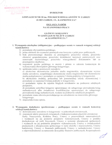 GIMNA .1 2 za7 GIMNAZJUM NR 20 im. POLSKICH HIMAKAISTOW W ZABRZU 41-803 ZABRZE, UL. KASPROWICZA7 OGLASZANABQR NA STANOWISKO PRACY GLOWNY KSIIJGOWY W GIMNAZJUM NR 20 W ZABRZU ul. KASPROWICZA 7 1. Wymagania niezb^dne (obligatoryjne - podlcgajijce occnic w ramach wstfpncj sclckcji kandydatow): 1) posiadanie obywatclstwa polskicgo, 2) pelna zdolnosc do czynnosci prawnych oraz korzysta z pclni praw publicznych; 3) brak prawomocnego skazania za przcstppstwo przeciwko mieniu. przeciwko obrotowi gospodarczemu, przeciwko dzialalnosci instytucji paristwowych oraz samorzadu terytorialnego, przcciwko wiarygodnosci dokumentow lub za przest^pstwo skarbovve; 4) znajomosc j?zyka polskiego w mowic i pismie w zakresie koniecznym do wykonywania obowiqzkow glownego ksicgowego; 5) spclnianie jcden z ponizszych vvarunkow: a) ukonczone ekonomic/.ne jednolitc studia magisterskic, ckonomiczne wyzsze studia zawodowe, uzupclniajace ckonomiczne studia magisterskic lub ckonomiczne studia podyplomowe i posiadanie co najmnicj 3-letnia praktyke \ ksiegowosci, b) ukonczenie sredniej. policcalncj lub pomaturalnej szkoty ekonomicznej i posiadanie co najmniej 6-letniej praktyki w ksiegowosci, c) posiadanie wpisu do rejestru bieglych rewidentow na podstawie odrebnych przepisow, d) posiadanie certyfikat ksiegowy uprawniajacy do usiugowego prowadzcnia ksiag rachunkowych albo swiadectwo kwalifikacyjnc uprawniaj^jce do uslugowego prowad/enia ksiag rachunkowych. wydane na podstawie odrebnych przepisow. 6) posiadanie stanu zdrowia pozwalajacego na zatrudnienie na stanowisku glownego ksiegowego, 7) nieposzlakowana opinia. 2. Wymagania dodatkowc (prcfcrowanc - podlegajijce occnie \ ramach koncowcj selekcji kandydatow): 1) doswiadczcnic zawodowe w ksiegowosci wjednostkach oswiatowych, 2) znajomosc aktow prawnych zwiazanych z funkcjonowaniem placowki oswiatowej: Karty Nauczyciela, Kodcksu Pracy, Ustawy o pracownikach samorzadowych i wydanych na jej postawic przepisow wykonawczych, Ustawy o podatku dochodowym od osob fizycznych, Ustawy o systemic ubczpieczen spotecznych i wydanych na jcj podstawie przepisow wykonawczych, Ustawy o swiadczeniach pienieznych z ubezpieczenia spotec/.nego w razie choroby i macicrzyhstwa, Ustawy budzetowej, Ustaw>' o fmansach publicznych, Ustawy o rachunkowosci, Ustawy o odpowiedzialnosci za naruszenie dyscypliny finansow publicznych, Rozporzadzenia w sprawie zasad rachunkowosci oraz planow kont dla budzctow jednostck samorzadu terytorialnego, 3) biegla znajomosc obslugi aplikacji komputerowych takich jak: pakiet biurowy Office, program ksiegowy SQola Ksiegowosc i Place, program ,.Plalnik v , SIO, aplikaeja e-PFRON2, 4) samodzielnosc, kreatywnosc. komunikatywnosc, umiejetnosc sprawnego podejmowania decyzji. umiejetnosc pracy na samodzielnym stanowisku, a takze w zespole, wysoka kultura osobista. 3. Zakrcs 1) 2) 3) wykonywanych zadan na stanowisku: prowadzi rachunkowosc jednostki wykonuje dyspozycje srodkami pienieznymi dokonuje wstepnej kontroli zgodnosci operacji gospodarczych i fmansowych z planem fmansowym 4) dokonuje wstepnej kontroli komplelnosci i rzetelnosci dokumentow dotyczacych operacji gospodarczych i fmansowych, 5) podpisuje dokumenty dotyczace poszczcgolnych operacji, 6) podcjmuje decyzje wst9pnych zaslrzezeri do przedstawionej occny prawidlowosci merytorycznej tej operacji i jej zgodnosci z prawem, 7) zapewnia, ze zobowi^zania wynikajace z operacji micszczq sie w planie fmansowym oraz harmonogramie dochodow i vvydatkovv, a jednostka posiada srodki finansowe na ich pokrycie, 8) w razie ujawnienia nieprawidlowosci. zwraca dokument wlasciwemu rzeczowo pracownikowi, a w razie ich nie usunipcia odmawia podpisania dokumentu, o czs'm zawiadamia piscmnie dyrektora. 9) moze zadac: a. udzielenia w formic pisemnej lub ustnej niezbednych informacji i wyjasnien b. udostepniania do wgladu dokumentow i wyliczen bedacych zrodlcm tych informacjami wyjasnien, 10) moze wnioskowac do dyrektora o okrcslenie trybu, wedlug ktorego majq bye wykonywane prace niezb9dne do zapcwnienia prawidlowosci gospodarki fmansowej orazewidencji ksiegowej, kalkulacji kos/tovv i sprawozdawczosci fmansowej, ll)sporzadza prawidlowo, tcrminowo i zgodnie z obowi^zujacymi przcpisami sprawozdania finansowe skladane przez szkole na zewnatrz, 12) nadzoruje gospodarke kasowa szkoly, przcprowadza kontrole kasy szkoly i kasjcra, 13)sporzadza, sprawdza i zatwierdza listy plac na podstawie pr/.ygotowanych przez sekretariat skladnikow wynagrodzenia pracx>wnik6w, 14)nalicza podatck od wynagrodzeri, zgodnie z obowiazujacymi w tym zakresie przepisami. 15) prowadzi wszclkie rozliczenia szkoly z bud/.elem panstwa, ZUS, PUP, MOPR, US i innymi instytucjami, z ktorymi szkola wspolpracuje w zakresie fmansowym, 16)czuwa nad wywiqzywaniem sie najemcow z warunkow umow najmu w zakresie zobowiazan fmansowych, 17)czuwa nad zabezpieczenienl srodkow fmansowych na fundusz socjalny, nadzoruje prawidlowosc wyplat z tych funduszow okreslonych i zatwierdzonych przez Dyrektora Szkoly, 18)nalezycie przechowuje i zabezpiecza dokumcnty ksiegowe, ksiegi rachunkowe oraz sprawozdania finansowe, 19) wykonuje innc czynnosci zlecone przez Dyrcktora Szkoiy, 4. Wymaganc dokumcnty. 1) Na dokumenty aplikacyjne skladaj^ sie: - list motywacyjny, - curriculum vitac, - kserokopic swiadectw pracy., - kserokopie dyplomow lub swiadectw potwierdzajqcych wyksztalcenic, - kserokopie zaswiadczeri, certyfikatow o ukonczonych kursach, szkoleniach. itp., - oryginal kwestionariusza osobowego, - oswiadczenie kandydata o posiadaniu pclnej zdolnosci do czynnosci prawnych i korzystaniu z pelni praw publicznych, - oswiadczenie kandydata o braku prawomocnego skazania za przestcpstwo przeciwko mieniu, przeciwko obrotowi gospodarczemu, przeciwko dziatalnosci instytucji panstwowych oraz samorz^du tcrytorialnego, przeciwko wiarygodnosci dokumentow lub za przestepstwo skarbowe oraz za umyslne przestcpstwo scigane z oskarzenia publicznego, - oswiadczenie kandydata o niekaralnosci za przcstepslwa popelnionc um