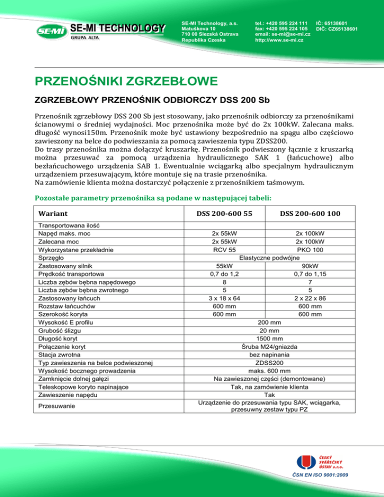 SE-MI Technology, a.s. Matuškova 10 710 00 Slezská Ostrava Republika Czeska tel.: +420 595 224 111 fax: +420 595 224 105 email: [email protected] http://www.se-mi.cz IČ: 65138601 DIČ: CZ65138601 PRZENOŚNIKI ZGRZEBŁOWE ZGRZEBŁOWY PRZENOŚNIK ODBIORCZY DSS 200 Sb Przenośnik zgrzebłowy DSS 200 Sb jest stosowany, jako przenośnik odbiorczy za przenośnikami ścianowymi o średniej wydajności. Moc przenośnika może być do 2x 100kW. Zalecana maks. długość wynosi150m. Przenośnik może być ustawiony bezpośrednio na spągu albo częściowo zawieszony na belce do podwieszania za pomocą zawieszenia typu ZDSS200. Do trasy przenośnika można dołączyć kruszarkę. Przenośnik podwieszony łącznie z kruszarką można przesuwać za pomocą urządzenia hydraulicznego SAK 1 (łańcuchowe) albo bezłańcuchowego urządzenia SAB 1. Ewentualnie wciągarką albo specjalnym hydraulicznym urządzeniem przesuwającym, które montuje się na trasie przenośnika. Na zamówienie klienta można dostarczyć połączenie z przenośnikiem taśmowym. Pozostałe parametry przenośnika są podane w następującej tabeli: Wariant Transportowana ilość Napęd maks. moc Zalecana moc Wykorzystane przekładnie Sprzęgło Zastosowany silnik Prędkość transportowa Liczba zębów bębna napędowego Liczba zębów bębna zwrotnego Zastosowany łańcuch Rozstaw łańcuchów Szerokość koryta Wysokość E profilu Grubość ślizgu Długość koryt Połączenie koryt Stacja zwrotna Typ zawieszenia na belce podwieszonej Wysokość bocznego prowadzenia Zamknięcie dolnej gałęzi Teleskopowe koryto napinające Zawieszenie napędu Przesuwanie DSS 200-600 55 DSS 200-600 100 2x 55kW 2x 55kW RCV 55 2x 100kW 2x 100kW PKO 100 Elastyczne podwójne 55kW 90kW 0,7 do 1,2 0,7 do 1,15 8 7 5 5 3 x 18 x 64 2 x 22 x 86 600 mm 600 mm 600 mm 600 mm 200 mm 20 mm 1500 mm Śruba M24/gniazda bez napinania ZDSS200 maks. 600 mm Na zawieszonej części (demontowane) Tak, na zamówienie klienta Tak Urządzenie do przesuwania typu SAK, wciągarka, przesuwny zestaw typu PZ ČSN EN ISO 9001:2009 PRZENOŚNIK ZGREBŁOWY DSS 200-2x55 kW