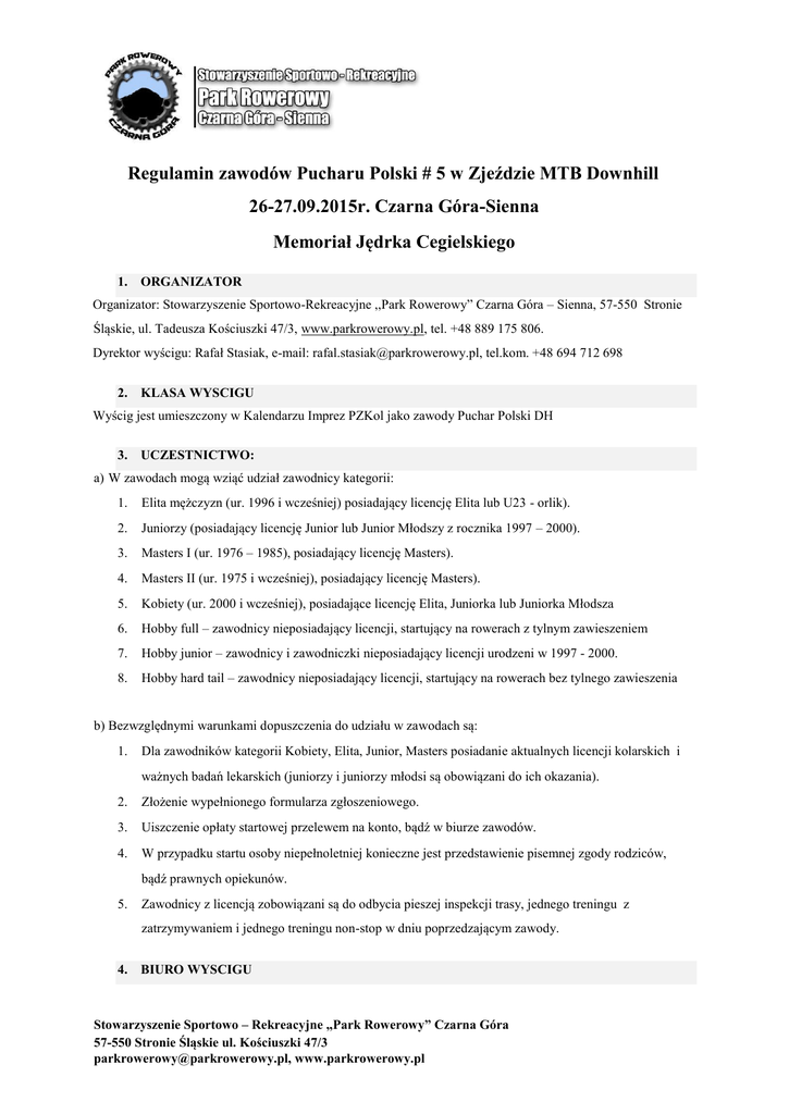 Regulamin zawodów Pucharu Polski # 5 w Zjeździe MTB Downhill 26-27.09.2015r. Czarna Góra-Sienna Memoriał Jędrka Cegielskiego 1. ORGANIZATOR Organizator: Stowarzyszenie Sportowo-Rekreacyjne ,,Park Rowerowy” Czarna Góra – Sienna, 57-550 Stronie Śląskie, ul. Tadeusza Kościuszki 47/3, www.parkrowerowy.pl, tel. +48 889 175 806. Dyrektor wyścigu: Rafał Stasiak, e-mail: [email protected], tel.kom. +48 694 712 698 2. KLASA WYSCIGU Wyścig jest umieszczony w Kalendarzu Imprez PZKol jako zawody Puchar Polski DH 3. UCZESTNICTWO: a) W zawodach mogą wziąć udział zawodnicy kategorii: 1. Elita mężczyzn (ur. 1996 i wcześniej) posiadający licencję Elita lub U23 - orlik). 2. Juniorzy (posiadający licencję Junior lub Junior Młodszy z rocznika 1997 – 2000). 3. Masters I (ur. 1976 – 1985), posiadający licencję Masters). 4. Masters II (ur. 1975 i wcześniej), posiadający licencję Masters). 5. Kobiety (ur. 2000 i wcześniej), posiadające licencję Elita, Juniorka lub Juniorka Młodsza 6. Hobby full – zawodnicy nieposiadający licencji, startujący na rowerach z tylnym zawieszeniem 7. Hobby junior – zawodnicy i zawodniczki nieposiadający licencji urodzeni w 1997 - 2000. 8. Hobby hard tail – zawodnicy nieposiadający licencji, startujący na rowerach bez tylnego zawieszenia b) Bezwzględnymi warunkami dopuszczenia do udziału w zawodach są: 1. Dla zawodników kategorii Kobiety, Elita, Junior, Masters posiadanie aktualnych licencji kolarskich i ważnych badań lekarskich (juniorzy i juniorzy młodsi są obowiązani do ich okazania). 2. Złożenie wypełnionego formularza zgłoszeniowego. 3. Uiszczenie opłaty startowej przelewem na konto, bądź w biurze zawodów. 4. W przypadku startu osoby niepełnoletniej konieczne jest przedstawienie pisemnej zgody rodziców, bądź prawnych opiekunów. 5. Zawodnicy z licencją zobowiązani są do odbycia pieszej inspekcji trasy, jednego treningu z zatrzymywaniem i jednego treningu non-stop w dniu poprzedzającym zawody. 4. BIURO WYSCIGU Stowarzyszenie Sportowo – Rekreacyjne „Park Rowerowy” Czarna Góra 57-550 Stronie Śląskie ul. Kościuszki 47/3 [email protected], www.parkrowerowy.pl Buro wyścigu mieścić się będzie w Karczmie „Czarna Góra”, Sienna 11, 57-550, Stronie Śląskie i czynne będzie w dniu 26.09.2015 w godz. 8.00 – 13.30; 27.09.2015 w godz. 9.00 – 16.00 5. TRENING Oficjalny trening dozwolony jest wyłącznie po kontroli licencji, zakończeniu wszystkich formalności rejestracyjnych i wydaniu numerów. Podczas treningu zawodnik musi mieć tabliczkę z numerem na rowerze. Treningi oficjalne odbędą się zgodnie z podanym niżej programem minutowym. Podczas trwania wyścigów trenowanie jest zabronione. 6. NAGRODY Zwycięzcy w poszczególnych kategoriach (min. 6 startujących w kat. elita i juniorzy oraz 4 startujących w kat. kobiety i masters) otrzymają puchary i dyplomy oraz nagrody rzeczowe, a w elicie nagrody pieniężne 1 miejsce – 800 zł, 2 miejsce 600 zł, 3 miejsce 400 zł. 7. CEREMONIA DEKORACJI Ceremonia dekoracji odbędzie się ok. 30 minut po zakończeniu zawodów Zgodnie z art. 1.2.112 Przepisów Sportowych do dekoracji mają obowiązek stawić się zawodnicy, którzy zajęli pierwsze 6 miejsc w każdej kategorii oraz zawodniczki, które zajęły pierwsze 4 miejsca. Zawodnicy mają obowiązek zgłosić się do dekoracji w strojach wyścigowych. 8. KARY W zakresie kar obowiązują Przepisy Sportowe PZKol. 9. PROGRAM MINUTOWY: Sobota 26.09.2015 godz. 08.00 – 13.00 - przyjmowanie zgłoszeń, wydawanie numerów startowych godz. 09.30 – 10.30 - obowiązkowa piesza inspekcja trasy przez zawodników godz. 10.30 – 14.30 - obowiązkowy trening z zatrzymywaniem godz. 14.30 – 16.00 - obowiązkowy trening non stop godz. 16.00 – 17.00 - trening non stop dla zawodników licencjonowanych Niedziela 27.09.2015 godz. 07.30 - odprawa służb zabezpieczających godz. 08.00 – 10.30 - trening z zatrzymywaniem godz. 10.30 – 11.30 - trening dla zawodników licencjonowanych Stowarzyszenie Sportowo – Rekreacyjne „Park Rowerowy” Czarna Góra 57-550 Stronie Śląskie ul. Kościuszki 47/3 [email protected], www.parkrowerowy.pl godz. 11.45 – 13.30 - eliminacje (hobby hard, hobby junior, hobby full, Kobiety, Mastersi, Juniorzy, Elita) godz. 14.00 - finał (hobby hard, hobby junior, hobby full) 10. ZASADY FINANSOWANIA Opłata startowa: 1. Opłata startowa zawodów: a. dla zawodników dokonujących zapisy przez internet do dnia 24.09.2015 do godziny 24 wynosi 100 zł, (16 zł. startowe + 84 zł wyciąg) b. dla zawodników zgłaszających się w dniu 26.09.2015 w biurze zawodów opłata wynosi 116 zł (32 zł startowe + 84 wyciąg). 2. Dla zawodników startujących tylko w niedzielę: a. zgłoszonych przez internet do dnia 24.09.2015 do godz. 24 opłata wynosi 60 zł b. zgłoszonych w dzień zawodów 27.09.2015 opłata startowa wynosi 70 zł 3. Opłatę startową można uiszczać przelewem na konto: Powiatowy Bank Spółdzielczy w Strzelinie, oddział w Stroniu Śląskim ul. Kościuszki 31 11 9588 0004 4201 6867 2000 0010 4. Zawodnicy uiszczający opłatę startową przez internet muszę posiadać przy sobie potwierdzenie płatności. W ramach opłaty startowej każdy uczestnik otrzymuje: - Zabezpieczenie medyczne podczas trwania treningów jak i w dniu zawodów. - Pamiątkowy numer startowy. - Dla zawodników posiadających nr. startowy bezpłatny, nielimitowany przejazd koleją podczas zawodów jak i treningów (w dniach 26-27.09.2015) Organizator nie zwraca opłaty startowej osobom, które nie ukończyły zawodów. 11. ZASADY BEZPIECZEŃSTWA Podczas zawodów stosowany będzie system chorągiewek: Zawodnik widzący powiewającą żółtą chorągiewkę ma obowiązek zatrzymać się lub wolno zjeżdżać w dół. Zawodnik widzący powiewającą czerwona chorągiewkę ma obowiązek natychmiast zatrzymać się. Zatrzymani zawodnicy spokojnie, lecz bezzwłocznie muszą, udać się na linie mety i 