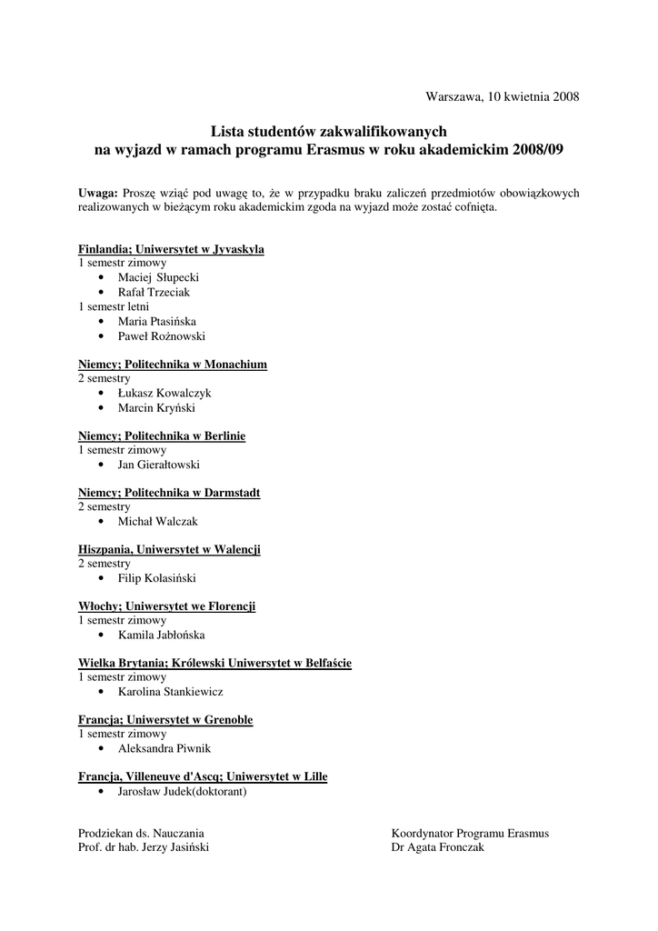 Warszawa, 10 kwietnia 2008 Lista studentów zakwalifikowanych na wyjazd w ramach programu Erasmus w roku akademickim 2008/09 Uwaga: Proszę wziąć pod uwagę to, że w przypadku braku zaliczeń przedmiotów obowiązkowych realizowanych w bieżącym roku akademickim zgoda na wyjazd może zostać cofnięta. Finlandia; Uniwersytet w Jyvaskyla 1 semestr zimowy • Maciej Słupecki • Rafał Trzeciak 1 semestr letni • Maria Ptasińska • Paweł Rożnowski Niemcy; Politechnika w Monachium 2 semestry • Łukasz Kowalczyk • Marcin Kryński Niemcy; Politechnika w Berlinie 1 semestr zimowy • Jan Gierałtowski Niemcy; Politechnika w Darmstadt 2 semestry • Michał Walczak Hiszpania, Uniwersytet w Walencji 2 semestry • Filip Kolasiński Włochy; Uniwersytet we Florencji 1 semestr zimowy • Kamila Jabłońska Wielka Brytania; Królewski Uniwersytet w Belfaście 1 semestr zimowy • Karolina Stankiewicz Francja; Uniwersytet w Grenoble 1 semestr zimowy • Aleksandra Piwnik Francja, Villeneuve d'Ascq; Uniwersytet w Lille • Jarosław Judek(doktorant) Prodziekan ds. Nauczania Prof. dr hab. Jerzy Jasiński Koordynator Programu Erasmus Dr Agata Fronczak
