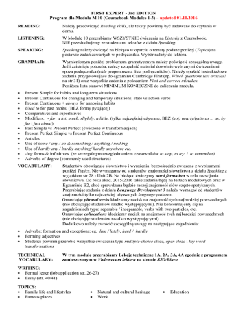 FIRST EXPERT - 3rd EDITION Program dla Modułu M 10 (Coursebook Modules 1-3) – updated 01.10.2016 READING: Należy przećwiczyć Reading skills, ale teksty powinny być zadawane do czytania w domu. LISTENING: W Module 10 przerabiamy WSZYSTKIE ćwiczenia na Listenig z Coursebook. NIE przesłuchujemy ze studentami tekstów z działu Speaking. SPEAKING: Speaking należy ćwiczyć na bieżąco w oparciu o tematy podane poniżej (Topics) na postawie zadań zawartych w podręczniku. Wybór należy do lektora. GRAMMAR: Wymienionym poniżej problemom gramatycznym należy poświęcić szczególną uwagę. Jeśli zaistnieje potrzeba, należy uzupełnić materiał dowolnie wybranymi ćwiczeniami spoza podręcznika (vide proponowana lista podręczników). Należy opuścić instruktażowe zadania przygotowujące do egzaminu Cambridge First (np. Which questions test articles? na str 31) oraz wszystkie zadania z poleceniem Find and correct mistakes. Poniższa lista stanowi MINIMUM KONIECZNE do zaliczenia modułu. Present Simple for habits and long-term situations Present Continuous for changing and temporary situations, state vs action verbs Present Continuous + always for annoying habits Used to for past habits, (BEZ formy pytającej) Comparatives and superlatives Modifiers: - far, a lot, much, slightly, a little, (tylko najczęściej używane, BEZ (not) nearly/quite as ... as, by far i just about) Past Simple vs Present Perfect (ćwiczone w transformacjach) Present Perfect Simple vs Present Perfect Continuous Articles Use of some / any / no & something / anything / nothing Use of hardly any / hardly anything/ hardly anywhere etc. -ing forms & infinitives (ze szczególnym uwzględnieniem czasowników to stop, to try i to remember) Adverbs of degree (commonly used structures) VOCABULARY: Studentów obowiązuje słownictwo i wyrażenia bezpośrednio związane z wypisanymi poniżej Topics. Nie wymagamy od studentów znajomości słownictwa z działu Speaking z wyjątkiem str 28 - Unit 2B. Na bieżąco ćwiczymy word formation w celu rozwijania słownictwa. Od roku akad. 2015/2016 takie zadania będą na testach modułowych oraz w Egzaminie B2, choć sprawdzana będzie raczej znajomość słów często spotykanych. Przerabiając zadania z działu Language Development 3 należy wymagać od studentów znajomości tylko najczęściej używanych language patterns. Omawiając phrasal verbs kładziemy nacisk na znajomość tych najbardziej powszechnych (nie obciążając studentów rzadko występującymi). Nie koncentrujemy się na zagadnieniach typu: separable / inseparable, verbs with two particles, etc. Omawiając collocations kładziemy nacisk na znajomość tych najbardziej powszechnych (nie obciążając studentów rzadko występującymi) Dodatkowo należy zwrócić szczególną uwagę na następujące zagadnienia: Adverbs: formation and exceptions: eg. late / lately, hard / hardly Forming adjectives Studenci powinni przerobić wszystkie ćwiczenia typu multiple-choice cloze, open cloze i key word transformations TECHNICAL VOCABULARY: W tym module przerabiamy Lekcje techniczne 1A, 2A, 3A, 4A zgodnie z programem zamieszczonym w Vademecum lektora na stronie SJO/Biuro WRITING: Formal letter (job application str. 26-27) Essay (str. 40/41) TOPICS: Family life and lifestyles Famous places Natural and cultural heritage Work Education FIRST EXPERT - 3rd EDITION Program dla Modułu M 11 (Coursebook Modules 4-6) – updated 01.10.2016 READING: Należy przećwiczyć Reading skills, ale teksty powinny być zadawane do czytania w Domu. LISTENING: W Module 11 przerabiamy WSZYSTKIE ćwiczenia na Listenig z Coursebook. NIE przesłuchujemy ze studentami tekstów z działu Speaking. SPEAKING: Speaking należy ćwiczyć na bieżąco w oparciu o tematy podane poniżej (Topics) na postawie zadań zawartych w podręczników. Wybór należy do lektora. GRAMMAR: Wymienionym poniżej problemom gramatycznym należy poświęcić szczególną uwagę. Jeśli zaistnieje potrzeba, należy uzupełnić materiał dowolnie wybranymi ćwiczeniami spoza podręcznika (vide proponowana lista podręczników). Należy opuścić instruktażowe zadania przygotowujące do egzaminu FCE (np. Which questions test articles? na str 31) oraz wszystkie zadania z poleceniem Find and correct mistakes. Poniższa lista stanowi MINIMUM KONIECZNE do zaliczenia modułu. Narrative tenses: Past Simple, Past Continuous, Past Perfect Time conjunctions Countable and uncountable nouns Future forms: going to, Present Continuous, will / shall Reflexives Relative clauses (with pronouns) to be/get used to + -ing VOCABULARY: Studentów obowiązuje słownictwo i wyrażenia bezpośrednio związane z wypisanymi poniżej Topics. Nie wymagamy od studentów znajomości słownictwa z działu Speaking. Na bieżąco ćwiczymy word formation w celu rozwijania słownictwa. Od roku akad. 2015/2016 takie zadania będą na testach modułowych oraz w Egzaminie B2, choć sprawdzana będzie raczej znajomość słów często spotykanych. Przerabiając zadania z działu Language Development 3 należy wymagać od studentów znajomości tylko najczęściej używanych language patterns. Omawiając phrasal verbs kładziemy nacisk na znajomość tych najbardziej powszechnych (nie obciążając studentów rzadko występującymi). Nie koncentrujemy się na zagadnieniach typu: separable / inseparable, verbs with two particles, etc. Omawiając collocations kładziemy nacisk na znajomość tych najbardziej powszechnych (nie obciążając studentów rzadko występującymi) Dodatkowo należy zwrócić szczególną uwagę na następujące zagadnienia: Adjectives often confused (eg current vs actual, -ing vs -ed adjectives) Phrasal verbs with take, come, Forming nouns Forming negative nouns Use of say, tell, speak, talk Adjectives and nouns + prepositions Studenci powinni przerobić wszystkie ćwiczenia typu multiple-choice cloze, open cloze i key word transformations TECHNICAL VOCABULARY: W tym module 
