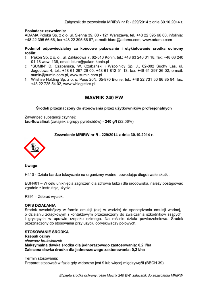 Załącznik do zezwolenia MRiRW nr R - 229/2014 z dnia 30.10.2014 r. Posiadacz zezwolenia: ADAMA Polska Sp. z o.o. ul. Sienna 39, 00 - 121 Warszawa, tel. +48 22 395 66 60, infolinia: +48 22 395 66 66, fax +48 22 395 66 67, e-mail: [email protected], www.adama.com Podmiot odpowiedzialny za końcowe pakowanie i etykietowanie środka ochrony roślin: 1. Pakon Sp. z o. o., ul. Zakładowa 7, 62-510 Konin, tel.: +48 63 240 01 18, fax: +48 63 240 01 18 wew. 136, email: [email protected] 2. "SUMIN" D. Czabańska, W. Czabański i Wspólnicy Sp. J., 62-002 Suchy Las, ul. Jagodowa 4, tel.: +48 61 297 26 00, +48 61 812 51 13, fax. +48 61 297 26 02, e-mail: [email protected], www.sumin.com.pl 3. Wilshire Holding Sp. z o. o. Pass 20N, 05-870 Błonie, tel.: +48 22 731 50 86 85 84, fax: +48 22 725 54 02, www.whlogistics.pl MAVRIK 240 EW Środek przeznaczony do stosowania przez użytkowników profesjonalnych Zawartość substancji czynnej: tau-fluwalinat (związek z grupy pyretroidów) - 240 g/l (22,06%) Zezwolenie MRiRW nr R - 229/2014 z dnia 30.10.2014 r. Uwaga H410 - Działa bardzo toksycznie na organizmy wodne, powodując długotrwałe skutki. EUH401 – W celu uniknięcia zagrożeń dla zdrowia ludzi i dla środowiska, należy postępować zgodnie z instrukcją użycia. P391 – Zebrać wyciek. OPIS DZIAŁANIA Środek owadobójczy w formie emulsji (olej w wodzie) do sporządzania emulsji wodnej, o działaniu żołądkowym i kontaktowym przeznaczony do zwalczania szkodników ssących i gryzących w uprawie rzepaku ozimego. Na roślinie działa powierzchniowo. Środek przeznaczony do stosowania przy użyciu opryskiwaczy polowych. STOSOWANIE ŚRODKA Rzepak ozimy chowacz brukwiaczek Maksymalna dawka środka dla jednorazowego zastosowania: 0,2 l/ha Zalecana dawka środka dla jednorazowego zastosowania: 0,2 l/ha Termin stosowania: Preparat stosować w fazie gdy widoczne jest 9 lub więcej międzywęźli (BBCH 39). Etykieta środka ochrony roślin Mavrik 240 EW, załącznik do zezwolenia MRiRW Zalecana ilość wody: 150-400 l/ha Zalecane opryskiwanie: średniokropliste Liczba zabiegów: 1 słodyszek rzepakowy (zabieg przeciwko słodyszkowi zwalcza również czterozębnego) Maksymalna dawka środka dla jednorazowego zastosowania: 0,2 l/ha Zalecana dawka środka dla jednorazowego zastosowania: 0,2 l/ha chowacza Termin stosowania: Preparat stosować od fazy żółtego pąka do fazy gdy jest otwartych 30% kwiatów (BBCH 5963). Zalecana ilość wody: 150-400 l/ha Zalecane opryskiwanie: średniokropliste Liczba zabiegów: 2 Odstęp między zabiegami: 7 dni szkodniki łuszczynowe chowacz podobnik, pryszczarek kapustnik Maksymalna dawka środka dla jednorazowego zastosowania: 0,2 l/ha Zalecana dawka środka dla jednorazowego zastosowania: 0,2 l/ha Termin stosowania: Preparat stosować w fazie rozwoju owoców (łuszczyn) tj. gdy 10% do 80% łuszczyn osiągnęło typową wielkość (BBCH 71-78). Zalecana ilość wody: 150-400 l/ha Zalecane opryskiwanie: średniokropliste Liczba zabiegów: 1 Maksymalna liczba zabiegów w sezonie wegetacyjnym w uprawie rzepaku ozimego: 2 ŚRODKI OSTROŻNOŚCI I ZALECENIA STOSOWANIA ZWIĄZANE Z DOBRĄ PRAKTYKĄ ROLNICZĄ 1. Środek działa najskuteczniej w temperaturze poniżej 20 0 C. W wyższej temperaturze powietrza zabiegi wykonywać pod koniec dnia. 2. Nie stosować na rośliny zwiędnięte lub porażone przez choroby. 3. Zabieg wykonać dokładnie, tak aby wszystkie części roślin były pokryte cieczą użytkową. 4. Środek stosować jeden lub maksymalnie dwa razy w sezonie wegetacyjnym, przemiennie ze środkami owadobójczymi należącymi do innych grup chemicznych o odmiennym mechanizmie działania. SPORZĄDZANIE CIECZY UŻYTKOWEJ Przed przystąpieniem do sporządzenia cieczy użytkowej dokładnie ustalić potrzebną jej ilość. Odmierzoną ilość środka wlać do zbiornika opryskiwacza napełnionego częściowo wodą (z włączonym mieszadłem) i uzupełnić wodą do potrzebnej ilości. Po wlaniu środka do zbiornika opryskiwacza nie wyposażonego w mieszadło hydrauliczne ciecz mechanicznie wymieszać. Opróżnione opakowania przepłukać trzykrotnie wodą, a popłuczyny wlać do zbiornika opryskiwacza z cieczą użytkową. POSTĘPOWANIE Z RESZTKAMI CIECZY UŻYTKOWEJ I MYCIE APARATURY Etykieta środka ochrony roślin Mavrik 240 EW, załącznik do zezwolenia MRiRW Z resztkami cieczy użytkowej po zabiegu należy postępować w sposób ograniczający ryzyko skażenia wód powierzchniowych i podziemnych, w rozumieniu przepisów Prawa wodnego oraz skażenia gruntu, tj.: – po uprzednim rozcieńczeniu zużyć na powierzchni, na której przeprowadzono zabieg, jeżeli jest to możliwe, lub, – unieszkodliwić z wykorzystaniem rozwiązań technicznych zapewniających biologiczną degradację substancji czynnych środków ochrony roślin, lub, – unieszkodliwić w inny sposób, zgodny z przepisami o odpadach. Po pracy aparaturę dokładnie wymyć. WARUNKI BEZPIECZNEGO STOSOWANIA ŚRODKA Przed zastosowaniem środka należy poinformować o tym fakcie wszystkie zainteresowane strony, które mogą być narażone na znoszenie cieczy roboczej i które zwróciły się o taką informację. Środki ostrożności dla osób stosujących środek: Nie jeść, nie pić ani nie palić podczas używania produktu. Środki ostrożności związane z ochroną środowiska naturalnego: Nie zanieczyszczać wód środkiem ochrony roślin lub jego opakowaniem. Nie myć aparatury w pobliżu wód powierzchniowych. Unikać zanieczyszczania wód poprzez rowy odwadniające z gospodarstw i dróg. Zaleca się stosowanie środka poza okresami aktywności pszczół. W celu ochrony organizmów wodnych konieczne jest wyznaczenie strefy ochronnej o szerokości: - 10 metrów od zbiorników i cieków wodnych lub - 1 metra od zbiorników i cieków wodnych z równoczesnym zastosowaniem rozpylaczy redukujących znoszenie cieczy użytkowej podczas zabiegu o 75%. W celu ochrony roślin oraz stawonogów niebędących cel