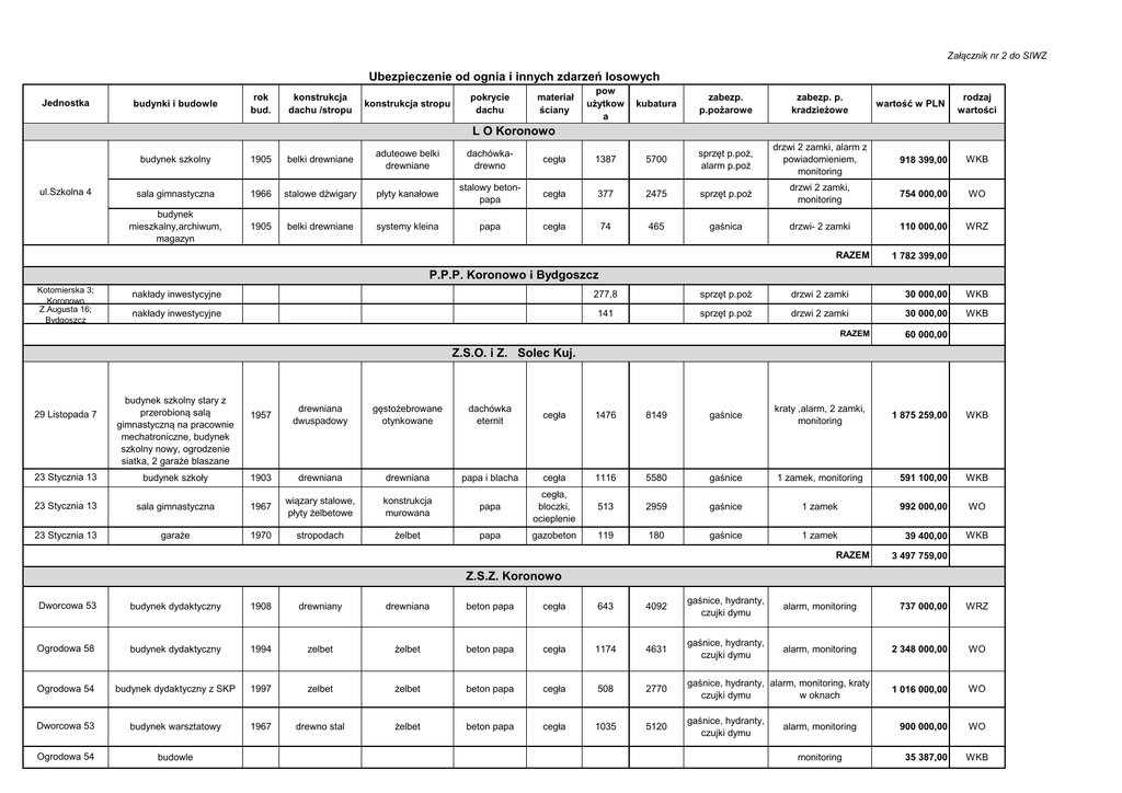 Załącznik nr 2 do SIWZ Ubezpieczenie od ognia i innych zdarzeń losowych Jednostka budynki i budowle rok bud. konstrukcja dachu /stropu konstrukcja stropu pokrycie dachu materiał ściany pow użytkow a kubatura zabezp. p.pożarowe zabezp. p. kradzieżowe wartość w PLN rodzaj wartości L O Koronowo ul.Szkolna 4 budynek szkolny 1905 belki drewniane aduteowe belki drewniane dachówkadrewno cegła 1387 5700 sprzęt p.poż, alarm p.poż drzwi 2 zamki, alarm z powiadomieniem, monitoring 918 399,00 WKB sala gimnastyczna 1966 stalowe dźwigary płyty kanałowe stalowy betonpapa cegła 377 2475 sprzęt p.poż drzwi 2 zamki, monitoring 754 000,00 WO budynek mieszkalny,archiwum, magazyn 1905 belki drewniane systemy kleina papa cegła 74 465 gaśnica drzwi- 2 zamki 110 000,00 WRZ RAZEM 1 782 399,00 P.P.P. Koronowo i Bydgoszcz Kotomierska 3; Koronowo Z.Augusta 16; Bydgoszcz nakłady inwestycyjne 277,8 sprzęt p.poż drzwi 2 zamki 30 000,00 WKB nakłady inwestycyjne 141 sprzęt p.poż drzwi 2 zamki 30 000,00 WKB RAZEM 60 000,00 Z.S.O. i Z. Solec Kuj. 29 Listopada 7 23 Stycznia 13 budynek szkolny stary z przerobioną salą gimnastyczną na pracownie mechatroniczne, budynek szkolny nowy, ogrodzenie siatka, 2 garaże blaszane budynek szkoły 1957 drewniana dwuspadowy gęstożebrowane otynkowane dachówka eternit cegła 1476 8149 gaśnice kraty ,alarm, 2 zamki, monitoring 1 875 259,00 WKB 1903 drewniana drewniana papa i blacha cegła 1116 5580 gaśnice 1 zamek, monitoring 591 100,00 WKB 513 2959 gaśnice 1 zamek 992 000,00 WO 119 180 gaśnice 1 zamek 39 400,00 WKB 23 Stycznia 13 sala gimnastyczna 1967 wiązary stalowe, płyty żelbetowe konstrukcja murowana papa cegła, bloczki, ocieplenie 23 Stycznia 13 garaże 1970 stropodach żelbet papa gazobeton RAZEM 3 497 759,00 Z.S.Z. Koronowo Dworcowa 53 budynek dydaktyczny 1908 drewniany drewniana beton papa cegła 643 4092 gaśnice, hydranty, czujki dymu alarm, monitoring 737 000,00 WRZ Ogrodowa 58 budynek dydaktyczny 1994 zelbet żelbet beton papa cegła 1174 4631 gaśnice, hydranty, czujki dymu alarm, monitoring 2 348 000,00 WO Ogrodowa 54 budynek dydaktyczny z SKP 1997 zelbet żelbet beton papa cegła 508 2770 gaśnice, hydranty, alarm, monitoring, kraty w oknach czujki dymu 1 016 000,00 WO Dworcowa 53 budynek warsztatowy 1967 drewno stal żelbet beton papa cegła 1035 5120 gaśnice, hydranty, czujki dymu alarm, monitoring 900 000,00 WO Ogrodowa 54 budowle monitoring 35 387,00 WKB Załącznik nr 2 do SIWZ Ogrodowa 54 Dworcowa 53 Ogrodowa 54 budynek dydaktyczny 2004 żelbet żelbet beton, papa cegła 1176 5426 gaśnice, hydranty, czujki dymu alarm, monitoring 2 352 000,00 WO hala sportowa 2015 żelbet żelbet papa bloczki gazobetono we 737 6632 gaśnice, hydranty, czujki dymu alarm, monitoring 2 517 919,00 WKB budynek dydakt.-adm 2005 żelbet żelbet beton, papa cegła 227 1422 gaśnice, hydranty, czujki dymu alarm, monitoring 663 447,00 WKB RAZEM 10 569 753,00 Z S A-E Karolewo budynki szkoły nr 1 i nr 2 Karolewo 8 1965 beton+cegła Ackerman papa cegła 2158 23340 gaśnice, hydranty,dozór, monitoring alarm, monitoring, dozór 4 316 000,00 WO budynek szkoły Placówka Op.Wych.nr 4 Karolewo 12 1965 beton+cegła Ackerman papa cegła 345 889 gaśnice hydranty dozór dozór całodobowy 621 460,00 WKB internat Karolewo 6, 6A,6B Placówka Op. Wych. kuchnia, stołówka 1968 beton+cegła Ackerman papa cegła 1613 16130 gaśnice, hydranty,dozór, monitoring monitoring, dozór 4 000 000,00 WO sala gimnastyczna z halą maszyn i pom. gospodarczymi 1901 drewno drewno papa cegła 1060 11250 gaśnice, instalacja alarmowa p.poż. alarm, monitoring, dozór 1 500 000,00 WR oficyna dworska 1850 drewno drewno dachówka ceramiczna cegła 192 1992 gaśnice dozór całodobowy 288 000,00 WRZ baza kształcenia praktycznego garaże, warsztaty 1969 beton+cegła beton cegła papa cegła 600 7980 gaśnice alarm, monitoring dozór 831 618,00 WKB oczyszczalnia ścieków 2000 beton beton papa gazobeton 176 880 gaśnice dozór 417 414,00 WKB Karolewo RAZEM 11 974 492,00 Z S Koronowo Sobieskiego 16; Koronowo budynek szkolny 1837 budynek gosp. drewniana drewniana drewniana dachówka cegła 1050 4622 papa murowany 163 456 gaśnice, hydrant wewnętrzny kraty w oknach na parterze, system alarmowy RAZEM 830 000,00 WRZ 12 258,00 WKB 842 258,00 Centrum Administracyjne Placówek Opiekuńczo Wychowawczych Trzemiętowo budynki-kompleks (mieszk)Trzemiętowo 17 1910 odbudo wa 1973 żelbeton betonowy papa cegła 890 4602 budynek gosp.- mieszkalny Trzemietowo 18 1973 drewniana drewniana papa cegła 266 613 hydrant dozór całodobowy 2 181 122,00 WO dozór całodobowy 179 071,00 WO RAZEM 2 360 193,00 Załącznik nr 2 do SIWZ D P S Bożenkowo Nadrzeczna 1; Bożenkowo; 86031 Osielsko budynek główny, mieszkalny biurowy i palarnia. 1990 płyty korytkowe, dźwigary klejone Cierpice Ackerman, płyty Spiroll papa cegła, gazobeton 1442 15240 gaśnice, hydrant, czujki p.poż. Minitoring kraty, zamki z atestem agregatorownia 1990 stopodach, płyty korytkowe stropy DZ-3 papa gazobeton, cegła 57 383 gaśnice, garaże i pom gosp. 1990 stopodach, płyty korytkowe stropy DZ-3 papa gazobeton, cegła 117 303 garaż wolonostojacy 1998 stopodach, płyty korytkowe stropy DZ-3 papa gazobeton, cegła 35 180 budowle 1990 5 492 953,00 WO teren ogrodzony 288 842,00 WKB gaśnice teren ogrodzony 50 488,00 WKB gaśnice teren ogrodzony 61 411,00 WKB 376 206,00 WKB RAZEM 6 269 900,00 D P S Koronowo Koronowo; Paderewskiego 35 mieszkalny 2006 dach konstr. drewniana żelbeton blachodachówk a cegła 771 2248 mieszkalny 1995 zelbeton zelbeton papa cegła 1855 7741 budynek mieszkalny 2001 profil stalowy profil stalowy płyta OSB blachodachówk a plyty OSB ,regips 723 2351 gaśnice, hydrant interaktywny system sygnalizacji poż. dozór 2 293 655,00 WKB 2 zamki, dozór 2 709 692,00 WKB 2 zamki, dozór 1 298 371,00 WKB RAZEM 6 301 718,00 Starostwo Powiatowe Bydgoszcz Konarskiego 1-3 budynek -adm-biurowy - nakłady inwestycyjne razem Z