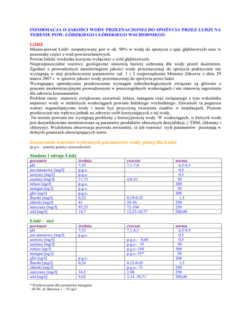 Zestawienie wartości wybranych parametrów wody pitnej dla Łodzi