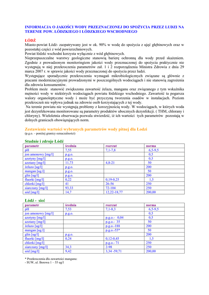 INFORMACJA O JAKOŚCI WODY PRZEZNACZONEJ DO SPOśYCIA PRZEZ LUDZI NA TERENIE POW. ŁÓDZKIEGO I ŁÓDZKIEGO WSCHODNIEGO ŁÓDŹ Miasto-powiat Łódź- zaopatrywany jest w ok. 90% w wodę do spoŜycia z ujęć głębinowych oraz w pozostałej części z wód powierzchniowych. Powiat łódzki wschodni korzysta wyłącznie z wód głębinowych. Nieprzepuszczalne warstwy geologiczne stanowią barierę ochronną dla wody przed skaŜeniem. Zgodnie z prowadzonym monitoringiem jakości wody przeznaczonej do spoŜycia praktycznie nie występują w niej przekroczenia parametrów zał. 1 i 2 rozporządzenia Ministra Zdrowia z dnia 29 marca 2007 r. w sprawie jakości wody przeznaczonej do spoŜycia przez ludzi. Występujące sporadycznie przekroczenia wymagań mikrobiologicznych związane są głównie z pracami modernizacyjnymi prowadzonymi w poszczególnych wodociągach i nie stanowią zagroŜenia dla zdrowia konsumentów. Problem moŜe stanowić zwiększona zawartość Ŝelaza, manganu oraz związanego z tym wskaźnika mętności wody w niektórych wodociągach powiatu łódzkiego wschodniego. Zawartość ta pogarsza walory organoleptyczne wody i moŜe być przyczyną tworzenia osadów w instalacjach. Poziom przekroczeń nie wpływa jednak na zdrowie osób korzystających z tej wody. Na terenie powiatu nie występują problemy z korozyjnością wody. W wodociągach, w których woda jest dezynfekowana monitorowane są parametry produktów ubocznych dezynfekcji. ( THM, chlorany i chloryny). Wieloletnia obserwacja pozwala stwierdzić, iŜ ich wartości tych parametrów pozostają w dolnych granicach obowiązujących norm. Zestawienie wartości wybranych parametrów wody pitnej dla Łodzi (p.g.o. – poniŜej granicy oznaczalności) Studnie i zdroje Łódź parametr pH jon amonowy [mg/l] azotyny [mg/l] azotany [mg/l] Ŝelazo [ug/l] mangan [ug.l] glin [ug/l] fluorki [mg/l] chlorki [mg/l] siarczany [mg/l] sód [mg/l] średnia 7,55 p.g.o. p.g.o. 11,73 p.g.o. p.g.o. p.g.o. 0,22 41 93,33 14,7 rozrzut 7,1-7,8 średnia 7,53 p.g.o. rozrzut 7,1-8,3 4,8-21 0,19-0,25 26-56 72-104 12,22-18,77 norma 6,5-9,5 0,5 0,5 50 200 50 200 1,5 250 250 200,00 Łódź - sieć parametr pH jon amonowy [mg/l] azotyny [mg/l] azotany [mg/l] Ŝelazo [ug/l] mangan [ug.l] glin [ug/l] fluorki [mg/l] chlorki [mg/l] siarczany [mg/l] sód [mg/l] p.g.o.- 0,04 p.g.o.- 35 p.g.o.-188 p.g.o.-55* p.g.o. 0,24 34,3 9,42 * Przekroczenia dla zawartości manganu: - SUW, ul. Borowa 1 – 55 ug/l 0,12-0,45 p.g.o.- 71 2-98 3,34 -59,71 norma 6,5-9,5 0,5 0,5 50 200 50 200 1,5 250 250 200,00 POWIAT ŁÓDZKI WSCHODNI Na terenie powiatu łódzkiego wschodniego funkcjonuje 40 wodociągów publicznych zaopatrujących w wodę do spoŜycia miasta gminne (5 wodociągów) i wsie (35 wodociągów)oraz 2 wodociągi lokalne obsługujące dom opieki społecznej i szpital w Tuszynie oraz stację uzdatniania wody w Kalinku gm. Rzgów. Wszystkie te wodociągi zasila woda głębinowa poddawana procesowi odŜelaziania. Wodociągi wiejskie dostarczają wodę do spoŜycia dla ok. 38 tys. mieszkańców. Dezynfekcja wody w tych wodociągach stosowana jest w przypadku stwierdzenia obecności mikroorganizmów chorobotwórczych w badanych próbkach wody. Na terenie powiatu łódzkiego wschodniego wyodrębniono 101 punktów kontrolnych (woda uzdatniona w SUW i woda u odbiorców na sieci ), z których pobierane są próbki wody do badań laboratoryjnych w monitoringu kontrolnym i przeglądowym z częstotliwością od 2-ch do 4-ch razy w roku w zaleŜności od ilości produkowanej wody. Wskaźniki chemiczne, dla których stwierdzono przekroczenia wartości normatywnych to mętność, barwa, Ŝelazo, mangan. Wartości tych wskaźników nie stanowią zagroŜenia dla zdrowia mieszkańców zaopatrywanych w wodę z tych wodociągów. Powiat łódzki wschodni parametr pH jon amonowy [mg/l] azotyny [mg/l] azotany [mg/l] Ŝelazo [ug/l] mangan [ug.l] glin [ug/l] fluorki [mg/l] chlorki [mg/l] siarczany [mg/l] sód [mg/l] średnia 7,66 p.g.o. 0,22 13,55 26,59 11,03 rozrzut 7,3-8,0 p.g.o.- 0,51 ** p.g.o.- 0,257 p.g.o.- 47 p.g.o.-533 *** p.g.o.- 124 0,11-0,59 5 - 46 2-94 3,06-57,29 norma 6,5-9,5 0,5 0,5 50 200 50 200 1,5 250 250 200,00 sód [mg/l] 200,00 ** przekroczenia dla zawartości jonu amonowego: - hydrofornia Rzgów, ul. Górna – 0,51 mg/l *** Przekroczenia dla zawartości Ŝelaza: - hydrofornia Bukowiec, ul. Stefana Batorego – 356 ug/l - hydrofornia Kaletnik, ul. Główna – 533 ug/l Woda przeznaczona do spoŜycia pochodząca z wodociągów publicznych na terenie powiatów: łódzkiego i łódzkiego wschodniego spełnia wymogi Rozporządzenia Ministra Zdrowia z dnia 29 marca 2007r. w sprawie jakości wody przeznaczonej do spoŜycia przez ludzi i jest bezpieczna dla zdrowia zarówno pod względem mikrobiologicznym jak i fizyko-chemicznym. LEGIONELLA SP. Źródłem zakaŜenia ludzi jest przewaŜnie woda, która w postaci aerozolu wodno-powietrznego lub wody , zawierającej bakterie z rodzaju Legionella przedostała się bezpośrednio do układu oddechowego. UwaŜa się, Ŝe źródłem większości stwierdzonych dotąd przypadków legionellozy w szpitalach lub hotelach są instalacje wody ciepłej lub instalacje klimatyzacyjne. Bakterie te mogą kolonizować wewnętrzne części rur z ciepłą wodą, zbiorniki na ciepłą wodę, wieŜe chłodnicze, perlatory zaworów czerpalnych (głowice natryskowe pryszniców). Najszybszy wzrost bakterii z rodzaju Legionella następuje w zakresie temperatur 35 – 45 °C, dlatego tak waŜne jest utrzymywanie odpowiednio wysokiej temperatury w instalacjach (55 - 60°C) i ich okresowy przegrzew do temperatury powyŜej 70°C oraz rodzaj materiału, z którego instalacja jest wykonana , poniewaŜ najszybszy wzrost tych bakterii następuje w instalacjach wykonanych z torzyw sztucznych, najmniejszy w instalacjach miedzianych. Zgodnie z obowiązującymi przepisami od 1 stycznia 2008 roku w zakładach opieki zdrowotnej i budynkach zamieszkania zbiorowego P