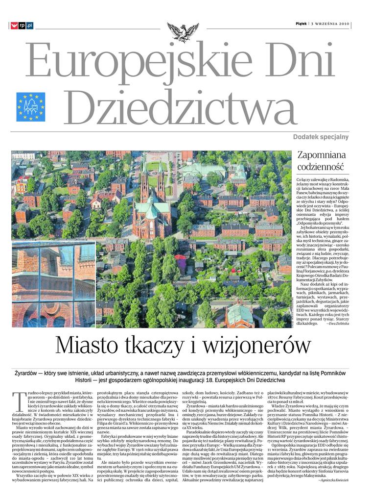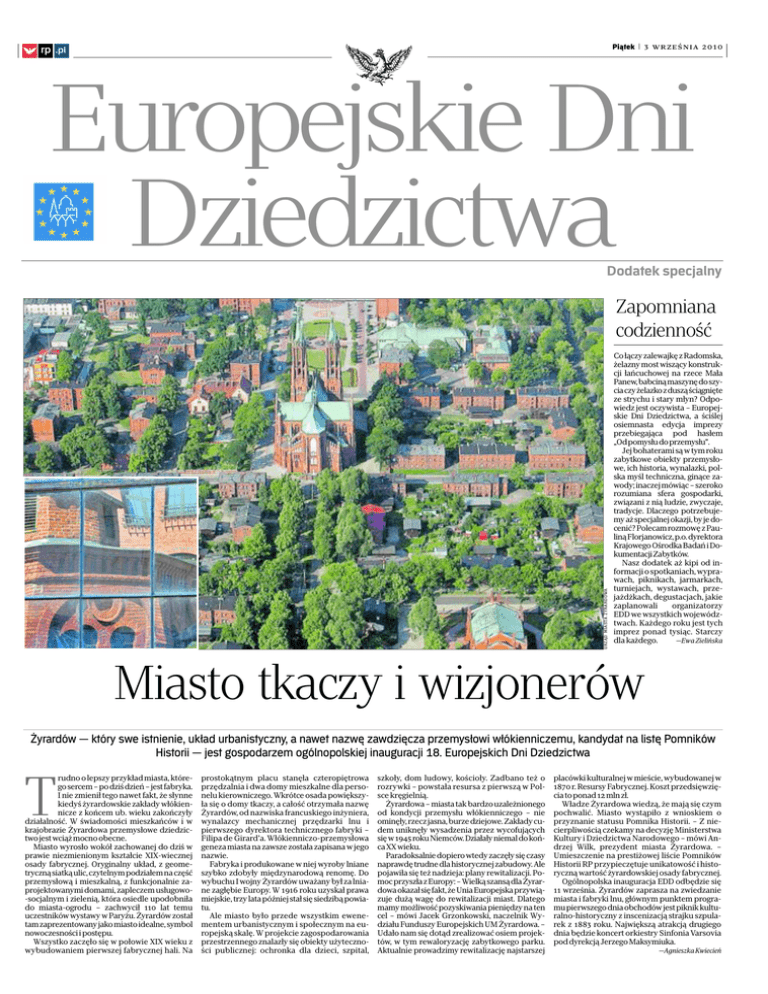 Piątek | 3 września 2010 ◊ rp .pl Europejskie Dni Dziedzictwa Dodatek specjalny URZĄD MIASTA ŻYRARDOWA Zapomniana codzienność Co łączy zalewajkę z Radomska, żelazny most wiszący konstrukcji łańcuchowej na rzece Mała Panew, babciną maszynę doszycia czy żelazko zduszą ściągnięte ze strychu i stary młyn? Odpowiedz jest oczywista – Europejskie Dni Dziedzictwa, a ściślej osiemnasta edycja imprezy przebiegająca pod hasłem „Odpomysłu doprzemysłu”. Jej bohaterami są w tym roku zabytkowe obiekty przemysłowe, ich historia, wynalazki, polska myśl techniczna, ginące zawody; inaczej mówiąc – szeroko rozumiana sfera gospodarki, związani z nią ludzie, zwyczaje, tradycje. Dlaczego potrzebujemy aż specjalnej okazji, by je docenić? Polecam rozmowę z Pauliną Florjanowicz, p.o. dyrektora Krajowego Ośrodka Badań i Dokumentacji Zabytków. Nasz dodatek aż kipi od informacji o spotkaniach, wyprawach, piknikach, jarmarkach, turniejach, wystawach, przejażdżkach, degustacjach, jakie zaplanowali organizatorzy EDD we wszystkich województwach. Każdego roku jest tych imprez ponad tysiąc. Starczy —Ewa Zielińska dla każdego. Miasto tkaczy i wizjonerów Żyrardów — który swe istnienie, układ urbanistyczny, a nawet nazwę zawdzięcza przemysłowi włókienniczemu, kandydat na listę Pomników Historii — jest gospodarzem ogólnopolskiej inauguracji 18. Europejskich Dni Dziedzictwa T rudno o lepszy przykład miasta, którego sercem – po dziś dzień – jest fabryka. I nie zmienił tego nawet fakt, że słynne kiedyś żyrardowskie zakłady włókiennicze z końcem ub. wieku zakończyły działalność. W świadomości mieszkańców i w krajobrazie Żyrardowa przemysłowe dziedzictwo jest wciąż mocno obecne. Miasto wyrosło wokół zachowanej do dziś w prawie niezmienionym kształcie XIX-wiecznej osady fabrycznej. Oryginalny układ, z geometryczną siatką ulic, czytelnym podziałem na część przemysłową i mieszkalną, z funkcjonalnie zaprojektowanymi domami, zapleczem usługowo-socjalnym i zielenią, która osiedle upodobniła do miasta-ogrodu – zachwycił 110 lat temu uczestników wystawy w Paryżu. Żyrardów został tam zaprezentowany jako miasto idealne, symbol nowoczesności i postępu. Wszystko zaczęło się w połowie XIX wieku z wybudowaniem pierwszej fabrycznej hali. Na prostokątnym placu stanęła czteropiętrowa przędzalnia i dwa domy mieszkalne dla personelu kierowniczego. Wkrótce osada powiększyła się o domy tkaczy, a całość otrzymała nazwę Żyrardów, od nazwiska francuskiego inżyniera, wynalazcy mechanicznej przędzarki lnu i pierwszego dyrektora technicznego fabryki – Filipa de Girard’a. Włókienniczo-przemysłowa geneza miasta na zawsze została zapisana w jego nazwie. Fabryka i produkowane w niej wyroby lniane szybko zdobyły międzynarodową renomę. Do wybuchu I wojny Żyrardów uważany był za lniane zagłębie Europy. W 1916 roku uzyskał prawa miejskie, trzy lata później stał się siedzibą powiatu. Ale miasto było przede wszystkim ewenementem urbanistycznym i społecznym na europejską skalę. W projekcie zagospodarowania przestrzennego znalazły się obiekty użyteczności publicznej: ochronka dla dzieci, szpital, szkoły, dom ludowy, kościoły. Zadbano też o rozrywki – powstała resursa z pierwszą w Polsce kręgielnią. Żyrardowa – miasta tak bardzo uzależnionego od kondycji przemysłu włókienniczego – nie ominęły, rzecz jasna, burze dziejowe. Zakłady cudem uniknęły wysadzenia przez wycofujących się w 1945 roku Niemców. Działały niemal do końca XX wieku. Paradoksalnie dopiero wtedy zaczęły się czasy naprawdę trudne dla historycznej zabudowy. Ale pojawiła się też nadzieja: plany rewitalizacji. Pomoc przyszła z Europy: – Wielką szansą dla Żyrardowa okazał się fakt, że Unia Europejska przywiązuje dużą wagę do rewitalizacji miast. Dlatego mamy możliwość pozyskiwania pieniędzy na ten cel – mówi Jacek Grzonkowski, naczelnik Wydziału Funduszy Europejskich UM Żyrardowa. – Udało nam się dotąd zrealizować osiem projektów, w tym rewaloryzację zabytkowego parku. Aktualnie prowadzimy rewitalizację najstarszej placówki kulturalnej w mieście, wybudowanej w 1870 r. Resursy Fabrycznej. Koszt przedsięwzięcia to ponad 12 mln zł. Władze Żyrardowa wiedzą, że mają się czym pochwalić. Miasto wystąpiło z wnioskiem o przyznanie statusu Pomnika Historii. – Z niecierpliwością czekamy na decyzję Ministerstwa Kultury i Dziedzictwa Narodowego – mówi Andrzej Wilk, prezydent miasta Żyrardowa. – Umieszczenie na prestiżowej liście Pomników Historii RP przypieczętuje unikatowość i historyczną wartość żyrardowskiej osady fabrycznej. Ogólnopolska inauguracja EDD odbędzie się 11 września. Żyrardów zaprasza na zwiedzanie miasta i fabryki lnu, głównym punktem programu pierwszego dnia obchodów jest piknik kulturalno-historyczny z inscenizacją strajku szpularek z 1883 roku. Największą atrakcją drugiego dnia będzie koncert orkiestry Sinfonia Varsovia pod dyrekcją Jerzego Maksymiuka. —Agnieszka Kwiecień 2 Piątek | 3 września 2010 Europejskie Dni Dziedzictwa rp .pl ◊ Historia z bliskiej perspektywy ◊: Europejskie Dni Dziedzictwa odbywają się na przełomie lata i jesieni – po powrotach z wakacyjnych wojaży. Jak na tle innych krajów kontynentu prezentuje się Polska? Mamy się czym pochwalić? Paulina Florjanowicz: Mamy mnóstwo powodów do dumy–na czele z dziedzictwem przemysłowym, które jest w tym roku tematem EDD w Polsce. Ideę Dni najlepiej streszcza popularne powiedzenie: „cudze chwalicie, swego nie znacie”. Dlatego imprezę organizujemy nie wczasie wakacji, tylko już po nich, i adresujemy do społeczności lokalnych, które dzięki niej poznają wartość swojego dziedzictwa. Właśnie: dziedzictwa, a nie zabytków, bo nie chodzi tylko oobiekty,ale także o historię z nimi związaną, o wpływ na nasz