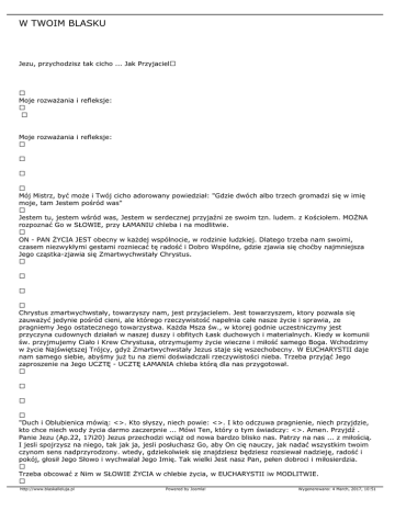 W TWOIM BLASKU Jezu, przychodzisz tak cicho ... Jak Przyjaciel Moje rozważania i refleksje: Moje rozważania i refleksje: Mój Mistrz, być może i Twój cicho adorowany powiedział: "Gdzie dwóch albo trzech gromadzi się w imię moje, tam Jestem pośród was" Jestem tu, jestem wśród was, Jestem w serdecznej przyjaźni ze swoim tzn. ludem. z Kościołem. MOŻNA rozpoznać Go w SŁOWIE, przy ŁAMANIU chleba i na modlitwie. ON - PAN ŻYCIA JEST obecny w każdej wspólnocie, w rodzinie ludzkiej. Dlatego trzeba nam swoimi, czasem niezwykłymi gestami rozniecać tę radość i Dobro Wspólne, gdzie zjawia się choćby najmniejsza Jego cząstka-zjawia się Zmartwychwstały Chrystus. Chrystus zmartwychwstały, towarzyszy nam, jest przyjacielem. Jest towarzyszem, ktory pozwala się zauważyć jedynie pośród cieni, ale którego rzeczywistość napełnia całe nasze życie i sprawia, ze pragniemy Jego ostatecznego towarzystwa. Każda Msza św., w ktorej godnie uczestniczymy jest przyczyna cudownych działań w naszej duszy i obfitych Łask duchowych i materialnych. Kiedy w komunii św. przyjmujemy Ciało i Krew Chrystusa, otrzymujemy życie wieczne i miłość samego Boga. Wchodzimy w życie Najświętszej Trójcy, gdyż Zmartwychwstały Jezus staje się wszechobecny. W EUCHARYSTII daje nam samego siebie, abyśmy już tu na ziemi doświadczali rzeczywistości nieba. Trzeba przyjąć Jego zaproszenie na Jego UCZTĘ - UCZTĘ ŁAMANIA chleba którą dla nas przygotował. "Duch i Oblubienica mówią: <>. Kto słyszy, niech powie: <>. I kto odczuwa pragnienie, niech przyjdzie, kto chce niech wody życia darmo zaczerpnie ... Mówi Ten, który o tym świadczy: <>. Amen. Przyjdź . Panie Jezu (Ap.22, 17i20) Jezus przechodzi wciąż od nowa bardzo blisko nas. Patrzy na nas ... z miłością. I jesli spojrzysz na niego, tak jak ja, jesli posłuchasz Go, aby On cię nauczy, jak nadać wszystkim twoim czynom sens nadprzyrodzony. wtedy, gdziekolwiek się znajdziesz będziesz rozsiewał nadzieję, radość i pokój, głosił Jego Słowo i wychwalał Jego Imię. Tak wielki Jest nasz Pan, pełen dobroci i miłosierdzia. Trzeba obcować z Nim w SŁOWIE ŻYCIA w chlebie życia, w EUCHARYSTII iw MODLITWIE. http://www.blaskalleluja.pl Powered by Joomla! Wygenerowano: 4 March, 2017, 10:51 I obcować z Nim tak, jak się obcuje z przyjacielem z osobą rzeczywista i żywa, jaką jest On-Chrystus, ponieważ zmartwychwstał. Trzeba zachwycić się Nim i Jego Ewangelia, gdyż nauka ta jest poznaniem Boga i Bożych Prawd przez syna Bożego - Wcielone Słowo i siebie samego w Nim - w Jezusie Chrystusie Panu naszym Marana tha! CHWALMY PANA - Także w necie! http://www.blaskalleluja.pl Powered by Joomla! Wygenerowano: 4 March, 2017, 10:51