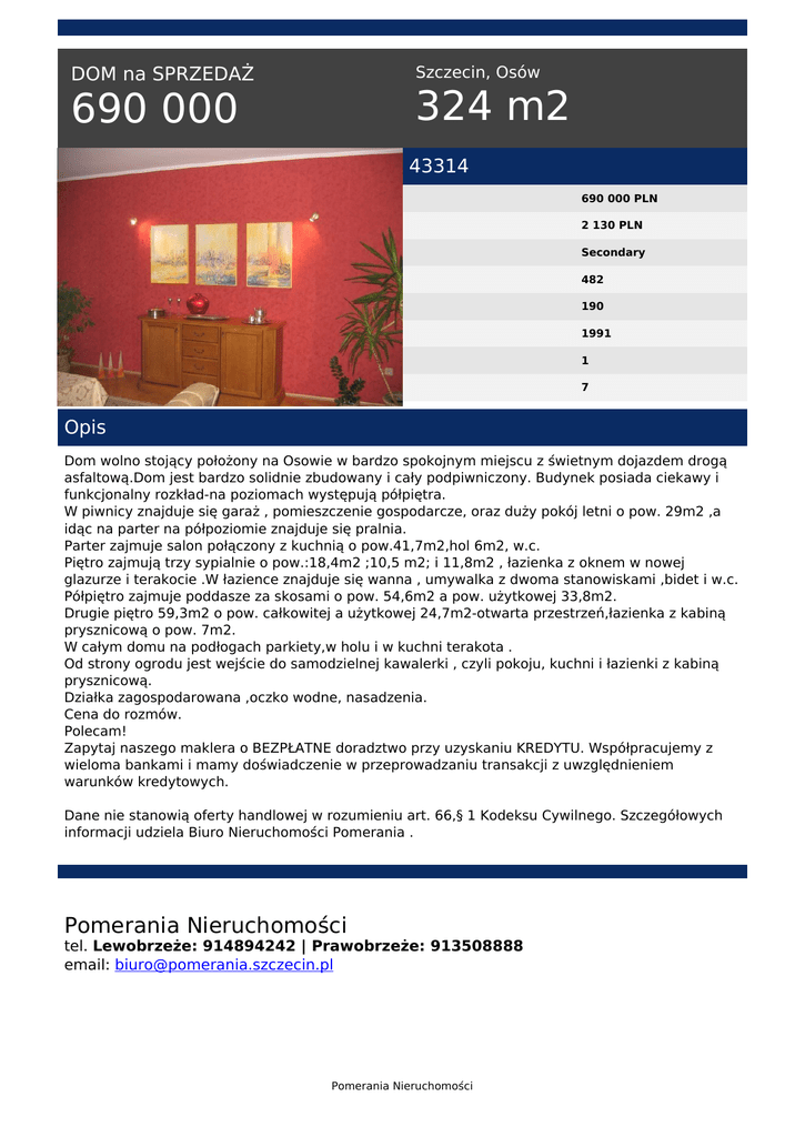 Szczecin, Osów DOM na SPRZEDAŻ 324 m2 690 000 43314 690 000 PLN 2 130 PLN Secondary 482 190 1991 1 7 Opis Dom wolno stojący położony na Osowie w bardzo spokojnym miejscu z świetnym dojazdem drogą asfaltową.Dom jest bardzo solidnie zbudowany i cały podpiwniczony. Budynek posiada ciekawy i funkcjonalny rozkład-na poziomach występują półpiętra. W piwnicy znajduje się garaż , pomieszczenie gospodarcze, oraz duży pokój letni o pow. 29m2 ,a idąc na parter na półpoziomie znajduje się pralnia. Parter zajmuje salon połączony z kuchnią o pow.41,7m2,hol 6m2, w.c. Piętro zajmują trzy sypialnie o pow.:18,4m2 ;10,5 m2; i 11,8m2 , łazienka z oknem w nowej glazurze i terakocie .W łazience znajduje się wanna , umywalka z dwoma stanowiskami ,bidet i w.c. Półpiętro zajmuje poddasze za skosami o pow. 54,6m2 a pow. użytkowej 33,8m2. Drugie piętro 59,3m2 o pow. całkowitej a użytkowej 24,7m2-otwarta przestrzeń,łazienka z kabiną prysznicową o pow. 7m2. W całym domu na podłogach parkiety,w holu i w kuchni terakota . Od strony ogrodu jest wejście do samodzielnej kawalerki , czyli pokoju, kuchni i łazienki z kabiną prysznicową. Działka zagospodarowana ,oczko wodne, nasadzenia. Cena do rozmów. Polecam! Zapytaj naszego maklera o BEZPŁATNE doradztwo przy uzyskaniu KREDYTU. Współpracujemy z wieloma bankami i mamy doświadczenie w przeprowadzaniu transakcji z uwzględnieniem warunków kredytowych. Dane nie stanowią oferty handlowej w rozumieniu art. 66,§ 1 Kodeksu Cywilnego. Szczegółowych informacji udziela Biuro Nieruchomości Pomerania . Pomerania Nieruchomości tel. Lewobrzeże: 914894242 | Prawobrzeże: 913508888 email: [email protected] Pomerania Nieruchomości Powered by TCPDF (www.tcpdf.org)