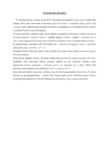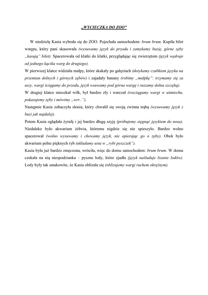 „WYCIECZKA DO ZOO” W niedzielę Kasia wybrała się do ZOO. Pojechała samochodem: brum brum. Kupiła bilet wstępu, który pani skasowała (wysuwamy język do przodu i zamykamy buzię, górne zęby „kasują” bilet). Spacerowała od klatki do klatki, przyglądając się zwierzętom (język wędruje od jednego kącika warg do drugiego). W pierwszej klatce widziała małpy, które skakały po gałęziach (dotykamy czubkiem języka na przemian dolnych i górnych zębów) i zajadały banany (robimy „małpkę”: trzymamy się za uszy, wargi ściągamy do przodu, język wsuwamy pod górna wargę i ruszamy dolna szczęką). W drugiej klatce mieszkał wilk, był bardzo zły i warczał (rozciągamy wargi w uśmiechu, pokazujemy zęby i mówimy „wrr..”). Następnie Kasia zobaczyła słonia, który chwalił się swoją zwinna trąbą (wysuwamy język z buzi jak najdalej). Potem Kasia oglądała żyrafę i jej bardzo długą szyję (próbujemy sięgnąć językiem do nosa). Niedaleko było akwarium żółwia, któremu nigdzie się nie spieszyło. Bardzo wolno spacerował (wolno wysuwamy i chowamy język, nie opierając go o zęby). Obok było akwarium pełne pięknych ryb (układamy usta w „rybi pyszczek”). Kasia była już bardzo zmęczona, wróciła, więc do domu samochodem: brum brum. W domu czekała na nią niespodzianka – pyszne lody, które zjadła (język naśladuje lizanie lodów). Lody były tak smakowite, że Kasia oblizała się (oblizujemy wargi ruchem okrężnym).