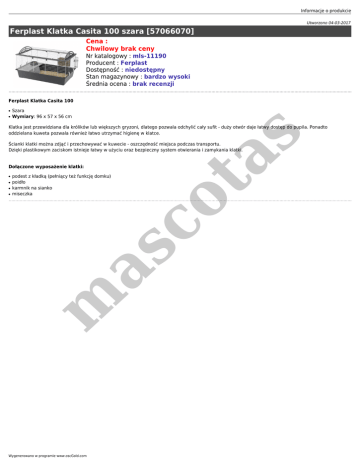 Informacje o produkcie Utworzono 04-03-2017 Ferplast Klatka Casita 100 szara [57066070] Cena : Chwilowy brak ceny Nr katalogowy : mls-11190 Producent : Ferplast Dostępność : niedostępny Stan magazynowy : bardzo wysoki Średnia ocena : brak recenzji Ferplast Klatka Casita 100 ● ● Szara Wymiary: 96 x 57 x 56 cm s Klatka jest przewidziana dla królików lub większych gryzoni, dlatego pozwala odchylić cały sufit - duży otwór daje łatwy dostęp do pupila. Ponadto oddzielana kuweta pozwala również łatwo utrzymać higienę w klatce. Dołączone wyposażenie klatki: ● ● ● m as ● podest z kładką (pełniący też funkcję domku) poidło karmnik na sianko miseczka co ta Ścianki klatki można zdjąć i przechowywać w kuwecie - oszczędność miejsca podczas transportu. Dzięki plastikowym zaciskom istnieje łatwy w użyciu oraz bezpieczny system otwierania i zamykania klatki. Wygenerowano w programie www.oscGold.com