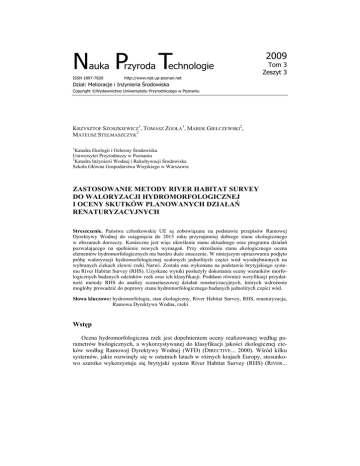 Nauka Przyroda Technologie ISSN 1897-7820 http://www.npt.up-poznan.net 2009 Tom 3 Zeszyt 3 Dział: Melioracje i Inżynieria Środowiska Copyright ©Wydawnictwo Uniwersytetu Przyrodniczego w Poznaniu KRZYSZTOF SZOSZKIEWICZ1, TOMASZ ZGOŁA1, MAREK GIEŁCZEWSKI2, MATEUSZ STELMASZCZYK2 1 Katedra Ekologii i Ochrony Środowiska Uniwersytet Przyrodniczy w Poznaniu 2 Katedra Inżynierii Wodnej i Rekultywacji Środowiska Szkoła Główna Gospodarstwa Wiejskiego w Warszawie ZASTOSOWANIE METODY RIVER HABITAT SURVEY DO WALORYZACJI HYDROMORFOLOGICZNEJ I OCENY SKUTKÓW PLANOWANYCH DZIAŁAŃ RENATURYZACYJNYCH Streszczenie. Państwa członkowskie UE są zobowiązane na podstawie przepisów Ramowej Dyrektywy Wodnej do osiągnięcia do 2015 roku przynajmniej dobrego stanu ekologicznego w obszarach dorzeczy. Konieczne jest więc określenie stanu aktualnego oraz programu działań pozwalającego na spełnienie nowych wymagań. Przy określaniu stanu ekologicznego ocena elementów hydromorfologicznych ma bardzo duże znaczenie. W niniejszym opracowaniu podjęto próbę waloryzacji hydromorfologicznej scalonych jednolitych części wód wyodrębnionych na wybranych ciekach zlewni rzeki Narwi. Została ona wykonana na podstawie brytyjskiego systemu River Habitat Survey (RHS). Uzyskane wyniki posłużyły dokonaniu oceny warunków morfologicznych badanych odcinków rzek oraz ich klasyfikacji. Poddano również weryfikacji przydatność metody RHS do analizy scenariuszowej działań renaturyzacyjnych, których wdrożenie mogłoby prowadzić do poprawy stanu hydromorfologicznego badanych jednolitych części wód. Słowa kluczowe: hydromorfologia, stan ekologiczny, River Habitat Survey, RHS, renaturyzacja, Ramowa Dyrektywa Wodna, rzeki Wstęp Ocena hydromorfologiczna rzek jest dopełnieniem oceny realizowanej według parametrów biologicznych, a wykorzystywanej do klasyfikacji jakości ekologicznej cieków według Ramowej Dyrektywy Wodnej (WFD) (DIRECTIVE... 2000). Wśród kilku systemów, jakie rozwinęły się w ostatnich latach w różnych krajach Europy, stosunkowo szeroko wykorzystuje się brytyjski system River Habitat Survey (RHS) (RIVER... 2 Szoszkiewicz K., Zgoła T., Giełczewski M., Stelmaszczyk M., 2009. Zastosowanie metody River Habitat Survey do waloryzacji hydromorfologicznej i oceny skutków planowanych działań renaturyzacyjnych. Nauka Przyr. Technol. 3, 3, #103. 1997, 2003). Jest to system oceny charakteru siedliska i jakości cieków oparty na parametrach morfologicznych. River Habitat Survey pozwala na charakterystykę rzek i ich klasyfikację na podstawie morfologicznej struktury rzek. System ten umożliwia ilościowe wyrażenie różnych cech morfologicznych oraz ich statystyczną ocenę. W rezultacie metoda ta ułatwia porównanie siedlisk rzecznych w skali zlewni i na większych obszarach geograficznych (NEWSON i IN. 1998). System RHS, umożliwiając rejestrowanie zachodzących zmian morfologicznych, znajduje zastosowanie w monitoringu i w różnych ocenach środowiskowych (DAWSON i SZOSZKIEWICZ 1999, WRIGHT i IN. 1998, NAURA i ROBINSON 1998). Obecnie system River Habitat Survey jest adaptowany do warunków lokalnych poszczególnych krajów europejskich (np. BUFFAGNI i KEMP 2002, SZOSZKIEWICZ i IN. 2008). System River Habitat Survey bazuje na identyfikacji elementów struktury morfologicznej cieku, wykorzystując ją do oceny jego jakości oraz charakteru siedliska. Badania opierają się na opisie 500-metrowego reprezentatywnego odcinka rzeki. Opis ten jest realizowany w dwóch następujących etapach: – Etap 1: charakterystyka podstawowych cech morfologicznych koryta i brzegów opisana w 10 profilach kontrolnych rozmieszczonych co 50 m; uwzględnia ona m.in. typ przepływu, substrat dna i brzegów, strukturę roślinności wodnej i brzegowej, użytkowanie brzegów, wielkość erozji brzegów, sposób sedymentacji, typy przekształceń i umocnienia techniczne na brzegach oraz na dnie cieku; – Etap 2: opis syntetyczny dla całego 500-metrowego odcinka uwzględniający wszystkie cechy i przekształcenia nie zarejestrowane w etapie poprzednim oraz dodatkowo opis doliny, wymiary koryta (wysokość brzegów, szerokość i głębokość koryta), bystrza, sedymentujący materiał i inne. Na podstawie oceny siedliska dokonanej w standardzie River Habitat Survey można obliczyć dwa syntetyczne indeksy jakości cieku (RAVEN i IN. 2000): – wskaźnik przekształcenia siedliska (Habitat Modification Score – HMS), który określa zakres przekształceń w morfologii cieku, – wskaźnik naturalności siedliska (Habitat Quality Assessment – HQA), który bazuje na obecności oraz różnorodności naturalnych elementów doliny rzecznej. Mała wartość wyniku HMS wskazuje na brak przekształceń antropogenicznych cieku, a duża – na dużą ich liczbę. Duże wartości HQA wskazują na występowanie licznych i zróżnicowanych elementów naturalnego krajobrazu w otoczeniu cieku, natomiast wynik zerowy oznacza całkowity brak elementów naturalnych. System River Habitat Survey jest wykorzystywany na potrzeby Ramowej Dyrektywy Wodnej. Dla syntetycznych indeksów HMS i HQA zostały określone wartości graniczne pięciu klas stanu hydromorfologicznego (WALKER i IN. 2002). Dla wskaźnika jakości HQA zaproponowano następujące zakresy poszczególnych klas: I: 0-20% największych wartości, II: > 20-40%, III: > 40-60%, IV: > 60-80%, V: > 80%. Dla indeksu HMS zaproponowano następujące zakresy poszczególnych klas: I: 0-2, II: 3-8, III: 9-20, IV: 21-44, V: > 45. 3 Szoszkiewicz K., Zgoła T., Giełczewski M., Stelmaszczyk M., 2009. Zastosowanie metody River Habitat Survey do waloryzacji hydromorfologicznej i oceny skutków planowanych działań renaturyzacyjnych. Nauka Przyr. Technol. 3, 3, #103. Metodyka Analizy zostały oparte na wynikach badań terenowych wykonanych w latach 2006-2007 na 23 stanowiskach badawczych zlokalizowanych w zlewni Górnej Narwi (rys. 1). Badania objęły cztery scalone 