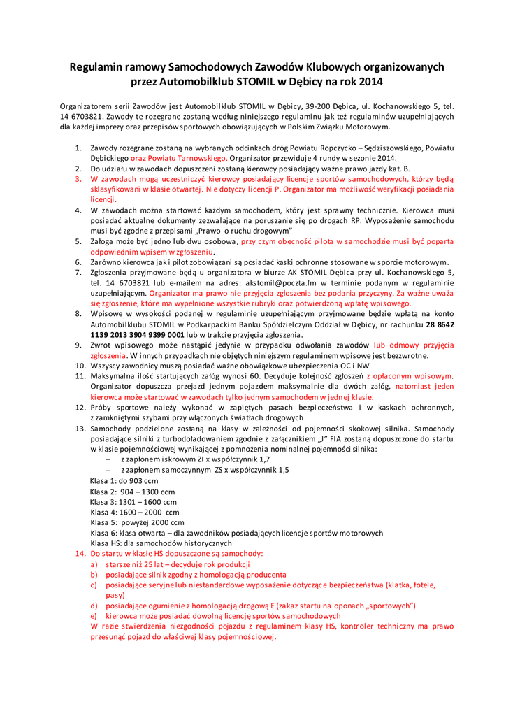 Regulamin ramowy Samochodowych Zawodów Klubowych organizowanych przez Automobilklub STOMIL w Dębicy na rok 2014 Organizatorem serii Zawodów jest Automobilklub STOMIL w Dębicy, 39-200 Dębica, ul. Kochanowskiego 5, tel. 14 6703821. Zawody te rozegrane zostaną według niniejszego regulaminu jak też regulaminów uzupełniających dla każdej imprezy oraz przepisów sportowych obowiązujących w Polskim Związku Motorowym. 1. 2. 3. 4. 5. 6. 7. 8. 9. 10. 11. 12. 13. 14. Zawody rozegrane zostaną na wybranych odcinkach dróg Powiatu Ropczycko – Sędziszowskiego, Powiatu Dębickiego oraz Powiatu Tarnowskiego. Organizator przewiduje 4 rundy w sezonie 2014. Do udziału w zawodach dopuszczeni zostaną kierowcy posiadający ważne prawo jazdy kat. B. W zawodach mogą uczestniczyd kierowcy posiadający licencje sportów samochodowych, którzy będą sklasyfikowani w klasie otwartej. Nie dotyczy licencji P. Organizator ma możliwośd weryfikacji posiadania licencji. W zawodach można startowad każdym samochodem, który jest sprawny technicznie. Kierowca musi posiadad aktualne dokumenty zezwalające na poruszanie się po drogach RP. Wyposażenie samochodu musi byd zgodne z przepisami „Prawo o ruchu drogowym” Załoga może byd jedno lub dwu osobowa , przy czym obecnośd pilota w samochodzie musi byd poparta odpowiednim wpisem w zgłoszeniu. Zarówno kierowca jak i pilot zobowiązani są posiadad kaski ochronne stosowane w sporcie motorowym. Zgłoszenia przyjmowane będą u organizatora w biurze AK STOMIL Dębica przy ul. Kochanowskiego 5, tel. 14 6703821 lub e-mailem na adres: [email protected] w terminie podanym w regulaminie uzupełniającym. Organizator ma prawo nie przyjęcia zgłoszenia bez podania przyczyny. Za ważne uważa się zgłoszenie, które ma wypełnione wszystkie rubryki oraz potwierdzoną wpłatę wpisowego. Wpisowe w wysokości podanej w regulaminie uzupełniającym przyjmowane będzie wpłatą na konto Automobilklubu STOMIL w Podkarpackim Banku Spółdzielczym Oddział w Dębicy, nr rachunku 28 8642 1139 2013 3904 9399 0001 lub w trakcie przyjęcia zgłoszenia. Zwrot wpisowego może nastąpid jedynie w przypadku odwołania zawodów lub odmowy przyjęcia zgłoszenia. W innych przypadkach nie objętych niniejszym regulaminem wpisowe jest bezzwrotne. Wszyscy zawodnicy muszą posiadad ważne obowiązkowe ubezpieczenia OC i NW Maksymalna ilośd startujących załóg wynosi 60. Decyduje kolejnośd zgłoszeo z opłaconym wpisowym. Organizator dopuszcza przejazd jednym pojazdem maksymalnie dla dwóch załóg, natomiast jeden kierowca może startowad w zawodach tylko jednym samochodem w jednej klasie. Próby sportowe należy wykonad w zapiętych pasach bezpi eczeostwa i w kaskach ochronnych, z zamkniętymi szybami przy włączonych światłach drogowych Samochody podzielone zostaną na klasy w zależności od pojemności skokowej silnika. Samochody posiadające silniki z turbodoładowaniem zgodnie z załącznikiem „J” FIA zostaną dopuszczone do startu w klasie pojemnościowej wynikającej z pomnożenia nominalnej pojemności silnika: z zapłonem iskrowym ZI x współczynnik 1,7 z zapłonem samoczynnym ZS x współczynnik 1,5 Klasa 1: do 903 ccm Klasa 2: 904 – 1300 ccm Klasa 3: 1301 – 1600 ccm Klasa 4: 1600 – 2000 ccm Klasa 5: powyżej 2000 ccm Klasa 6: klasa otwarta – dla zawodników posiadających licencje sportów motorowych Klasa HS: dla samochodów historycznych Do startu w klasie HS dopuszczone są samochody: a) starsze niż 25 lat – decyduje rok produkcji b) posiadające silnik zgodny z homologacją producenta c) posiadające seryjne lub niestandardowe wyposażenie dotycząc e bezpieczeostwa (klatka, fotele, pasy) d) posiadające ogumienie z homologacją drogową E (zakaz startu na oponach „sportowych”) e) kierowca może posiadad dowolną licencję sportów samochodowych W razie stwierdzenia niezgodności pojazdu z regulaminem klasy HS, kontr oler techniczny ma prawo przesunąd pojazd do właściwej klasy pojemnościowej. 15. Do startu w zawodach dopuszczone są pojazdy z zamontowaną instalacją LPG. W trakcie trwania imprezy zbiornik gazu musi byd opróżniony. 16. Zawodnicy oraz inni uczestnicy zawodów zobowiązani są bezwzględnie podporządkowad się poleceniom organizatorów i przestrzegad zasad bezpieczeostwa. Zawodnik może zostad ukarany za brak dyscypliny sportowej, za niesportowe zachowanie lub niezastosowanie się do poleceo Organizatora karą 50 sek. karnych, a w przypadkach drastycznych - wykluczeniem z zawodów. 17. Organizator nie przyjmuje na siebie odpowiedzialności za szkody wynikłe podczas trwania zawodów, zarówno w stosunku do załóg i ich sprzętu, jak i za spowodowane przez nich szkody i straty w sto sunku do osób trzecich i ich mienia. 18. Próba sportowa pokonywana będzie trzykrotnie. Do klasyfikacji koocowej będzie przyjęta suma trzech czasów przejazdów. W trakcie zawodów w miarę dostępnego czasu, organizator może zdecydowad o rozegraniu dodatkowego czwartego przejazdu również wliczanego do klasyfikacji. W przypadku nieukooczonego jednego przejazdu zawodnik otrzymuje taryfę (150 % czasu przejazdu najlepszego zawodnika w klasie). W przypadku nie ukooczenia więcej niż jednego przejazdu zawodnik nie jest klasyfikowany w zawodach. 19. Od dnia publikacji niniejszego regulaminu wprowadza się zakaz treningów na trasie zawodów w kierunku wyścigu. Każde stwierdzenie faktu niestosowania się do tego punktu regulaminu, będzie skutkowało wykluczeniem załogi z eliminacji. Zapoznanie się z trasą dozwolone jest wyłącznie w dniu zawodów, podczas przejazdu zapoznawczego oraz przejazdów treningowych. 20. Przed startem do próby należy ustawid samochód przednimi kołami przed linią START. Meta próby będzie metą lotną, czyli zawodnik nie zatrzymuje się na linii META. Zawodnik po przejechaniu mety lotnej zobowiązany jest do rozpoczęcia hamowania aż do zatrzymania przy tablicy META STOP. Start i mety ozn