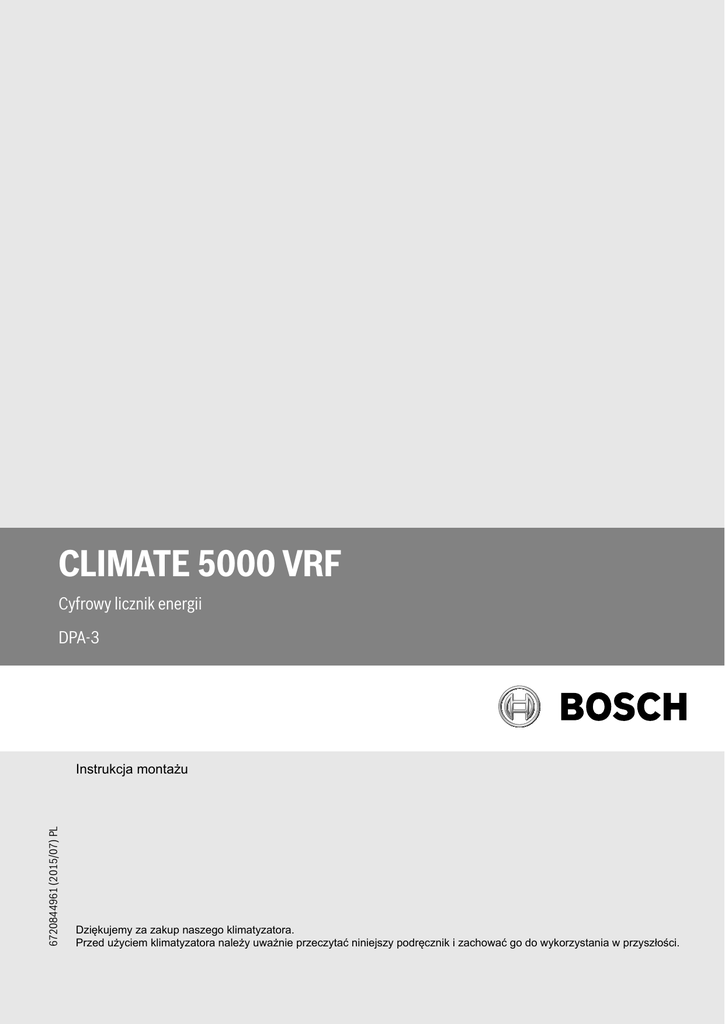 CLIMATE 5000 VRF Cyfrowy licznik energii DPA-3 6720844961 (2015/07) PL Instrukcja montażu Dziękujemy za zakup naszego klimatyzatora. Przed użyciem klimatyzatora należy uważnie przeczytać niniejszy podręcznik i zachować go do wykorzystania w przyszłości. 2 | INFORMACJE OGÓLNE 1. INFORMACJE OGÓLNE 1.1. DPA-3 (LED) 3-fazowy elektroniczny licznik watogodzin jest nowo opracowanym produktem, który spełnia wymagania normy IEC61036:2000. W konstrukcji i wykonaniu licznika wykorzystano zaawansowaną technologię SMT. Licznik służy głównie jako urządzenie pomiarowe do rejestrowania całkowitego zużycia energii w instalacji trójfazowej oraz zużycia energii w każdej fazie. Zawiera funkcję wskazywania braku fazy i zdalnej komunikacji za pomocą portów podczerwieni i 485. Protokół komunikacyjny spełnia wymagania normy DL/T645- 1997. Licznik charakteryzuje się dokładnością, stabilnością i dużą odpornością na zakłócenia. 1.2. 2. ZASADA DZIAŁANIA 2.1. Urządzenie do pomiaru energii Zastosowany odpowiedni układ trójfazowy do pomiaru. Schemat 1 ilustruje zasadę działania. Próbkowanie prądu Inny obwód wzmocnienia Przetwornik analogowo-cyfrowy Próbkowanie napięcia Inny obwód wzmocnienia Przetwornik analogowo-cyfrowy Procesor Cechy produktu 1.2.3 Solidny projekt z wykorzystaniem stabilnych przemysłowych komponentów o niskim zużyciu energii i dużej odporności na zakłócenia. 1.2.4 Ilość energii może być zapisywana, programowana i odczytywana przez funkcję komunikacji przez podczerwień oraz RS‑485. 1.2.5 Eksportowanie sygnałów impulsów bez zasilania. Korzystne do kalibracji i odczytu licznika. 6720844961 (2015/07) Filtrowanie dolnoprzepustowe Powielacz Wyjście wysokiej częstotliwości Cyfrowa przetwornica częstotliwości Wyjście niskiej częstotliwości 1.2.1 Piękna, praktyczna konstrukcja i wzornictwo, wysokiej jakości technologia produkcji, łatwy montaż i konserwacja. 1.2.2 Dokładne rejestrowanie i wyświetlanie z przewijaniem całkowitego zużycia energii w instalacji trójfazowej, jak również zużycia energii w każdej fazie. Korekcja fazy Filtrowanie dolnoprzepustowe Rys. 1 Rezystory obciążające zbierają analogowe dane sygnału napięcia, a przekładnik prądowy zbiera dane analogowe sygnału prądu — oba z wejścia trójfazowego. Następnie dane te są przesyłane do układu pomiarowego. Pomiar mocy chwilowej odbywa się przez konwersję i mnożenie różnicy A/D. Następnie cyfrowa przetwornica częstotliwości eksportuje sygnały impulsów częstotliwości, które są proporcjonalne do średniej mocy mierzonej energii. Ten sygnał jest dostarczany do zewnętrznego kalibrowania albo odczytu licznika. 2.2. Jednostka przetwarzania danych Energia 3-fazowej, 4-przewodowej jednostki jest eksportowana do procesora przez SPI, a następnie procesor zaczyna przetwarzanie danych, rejestrując ilości każdej fazy i zapisując dane w pamięci. Ponadto procesor nakazuje obwodowi napędu LED wyświetlanie wartości danych w odpowiednim czasie. Część danych w pamięci może być dostępna przez podczerwień i RS-485. CLIMATE 5000 VRF Dane techniczne | 3 3. DANE TECHNICZNE 3.1. Parametry 3.1.1 3.1.8 Pobór mocy: nie więcej niż 2 W/10 VA w obwodzie napięcia; nie więcej niż 1 VA w obwodzie prądowym. 3.2. Zakres napięcia: 220 V AC ± 20% 3.1.2 W poniższej tabeli 1 wymieniono napięcie odniesienia, rodzaj prądu i stałą licznika. Tabela 1 Napięcie odniesienia Klasa dokładności Specyfikacja prądu Stała 3*100 V Klasa 1.0/2.0 1,5(6) A 6400 imp/kWh 1,5(6) A 3200 imp/kWh 2,5(10) A 1600 imp/kWh 5(20) A 800 imp/kWh 5(40) A 800 imp/kWh 10(40) A 800 imp/kWh 15(60) A 400 imp/kWh 20(80) A 400 imp/kWh 3*220/380 V Klasa 1.0/2.0 3.1.3 Częstotliwość odniesienia: 50 Hz 3.1.4 Dokładność: klasa 1.0/2.0 3.1.5 W poniższej tabeli 2 podano procentowe zakresy błędów. Tabela 1/2 (OBCIĄŻENIE SYMETRYCZNE) Prąd obciążeniowy (A) Cały prąd Prąd przekładnika Współczynnik mocy 0,05 Ib ~ 0,1 Ib 0,02 In ~ 0,05 In 0,1 Ib ~ Imax Błąd procentowy (%) Klasa 1 Klasa 2 1.0 ±1.5 ±2.5 0,05 In ~ Imax 1.0 ±1.0 ±2.0 0,1 Ib ~ 0,2 Ib 0,05 In ~ 0,1 In 0,5 L, 0,8 C ±1.5 ±2.5 0,2 Ib ~ Imax 0,1 In ~ Imax 0,5 L, 0,8 C ±1.0 ±2.0 Parametry wydajności 3.2.1 Rejestracja: licznik może rejestrować całkowite zużycie energii aktywnej w instalacji trójfazowej w obie strony, jak również zużycie energii w każdej fazie. Licznik może mierzyć energię tylko w przód, nawet w przypadku gdy prąd jest podłączony odwrotnie. 3.2.2 Komunikacja: licznik komunikuje się przez podczerwień i port RS-485. 3.2.3 Programowanie: licznik ma przełącznik programowania w obudowie. Porty podczerwieni i RS-485 służą do programowania licznika po podaniu prawidłowego hasła. Umożliwiają ustawienie numeru seryjnego, przewijanie ekranu i zmianę hasła. 3.2.4 Funkcja odczytu licznika: dostęp do danych licznika można uzyskać bezpośrednio za pomocą ręcznego urządzenia do odczytu i zdalnie przez RS-485. 3.2.5 Wyświetlacz i wyjście: 3.2.5.1 Przewijanie wyświetlacza energii fazy A, B i C oddzielnie, także całkowitej energii, w zakresie od 0 do 99999,9 kWh. Praktyczne pomiary zawierają się w zakresie od 0 do 999999,99 kWh. Gdy ilość zużytej energii przekracza 99999,9 kWh, cyfra o największej wartości nie jest wyświetlana. Jednakże urządzenie komunikacyjne może odczytać licznik. Jeśli ilość energii przekracza 999999,99 kWh, dane wracają do 0, a wartość milionów należy dodać ręcznie. 3.2.5.2 Licznik wyświetla informację o braku napięcia, ale nie jest ona widoczna, gdy we wszystkich trzech fazach A, B, C jest napięcie. Brak jednej lub dwóch faz jest sygnalizowany przez zapalenie odpowiednich kontrolek. (Żółta kontrolka oznacza brak fazy A, zielona — fazy B, a czerwona — fazy C). 3.2.5.3 Licznik może testować wyjście impulsowe. Szerokość impulsu wynosi 80 ms ± 20% Tabela 2/2 (OBCIĄŻENIE NIESYMETRYCZNE) Prąd obci