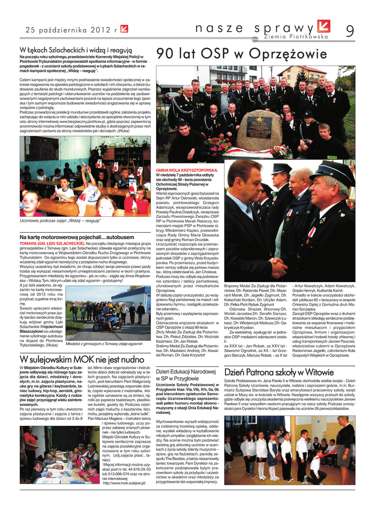 25 października 2012 r W Łękach Szlacheckich i widzą i reagują Na początu roku szkolnego, przedstawiciele Komendy Miejskiej Policji w Piotrkowie Trybunalskim przeprowadzili spotkania informacyjne - w formie pogadanek - z uczniami szkoły podstawowej w Łękach Szlacheckich w ramach kampanii społecznej „Widzę – reaguję”. nasze sprawy Ziemia Piotrkowska 9 90 lat OSP w Oprzężowie Celem kampanii jest między innymi podniesienie świadomości społecznej w zakresie reagowania na zjawiska patologiczne w szkołach i ich otoczeniu, a także budowanie zaufania do służb mundurowych. Poprzez wyjaśnienie zagrożeń wynikających z tematyki patologii i ukierunkowanie uczniów na podzielenie się zaobserwowanymi negatywnymi zachowaniami pozwoli na lepsze zrozumienie tego zjawiska i tym samym wspomoże budowanie świadomości angażowania się w sprawy związane z patologią. Podczas prowadzonej prelekcji mundurowi przedstawili ogólne założenia projektu zachęcając do wzięcia w nim udziału i skorzystanie ze specjalnie stworzonej w tym celu strony internetowej www.bezpieczny.piotrkow.pl, gdzie poprzez zapewnioną anonimowość można informować odpowiednie służby o dostrzeganych przez nich zagrożeniach zarówno ze strony rówieśników jak i dorosłych. (Wuka) Uczniowie podczas zajęć „Widzę – reaguję” Na kartę motorowerową pojechali... autobusem TOMAWA (GM. ŁĘKI SZLACHECKIE). Na początku bieżącego miesiąca grupa gimnazjalistów z Tomawy (gm. Łęki Szlacheckie) zdawała egzamin praktyczny na kartę motorowerową w Wojewódzkim Ośrodku Ruchu Drogowego w Piotrkowie Trybunalskim. Do egzaminu tego zostali dopuszczeni tylko ci uczniowie, którzy wcześniej zdali egzamin teoretyczny z przepisów ruchu drogowego. Wszyscy uczestnicy byli świadomi, że chcąc zdobyć swoje pierwsze prawo jazdy trzeba się wykazać niesamowitymi umiejętnościami zarówno w teorii i praktyce. Przygotowaniem młodzieży do egzaminu - jak co roku - zajęła się Anna Wojakowska – Wolska.Tym, którym udało się zdać egzamin - gratulujemy! A już dziś wiadomo, że egzamin na kartę motorowerową od 2013 roku ma przybrać zupełnie inną formę. Świeżo upieczeni właściciel motorowych praw jazdy bardzo serdecznie dziękują wójtowi gminy Łęki Szlacheckie Wojciechowi Błaszczykowi za udostępnienie szkolnego autobusu na dojazd do Piotrkowa Młodzież z gimnazjum z Tomawy zdaje egzamin Trybunalskiego. (Wuka) W sulejowskim MOK nie jest nudno W Miejskim Ośrodku Kultury w Sulejowie odbywają się różnego typu zajęcia dla dzieci, młodzieży i dorosłych, m.in. zajęcia plastyczne, nauka gry na gitarze i keyboardzie, taniec ludowy, hip-hop, aerobik, gimnastyka korekcyjna. Każdy z rodzajów zajęć przyciągnął wielu zainteresowanych. Po raz pierwszy w tym roku utworzono zajęcia plastyczne i zajęcia z tańca i śpiewu ludowego dla dzieci od 3 do 8 lat. Mimo obaw organizatorów i instruktorów dzieci dobrze odnalazły się w takich grupach. Na zajęciach plastycznych, pod kierunkiem Pani Małgorzaty Leśniewskiej powstają wspaniałe dzieła, często wykonane z materiałów, które ogólnie uznawane są za śmieci, np. rolki po papierze toaletowym, plastikowe butelki, gazety itp. Podczas ostatnich zajęć maluchy z kasztanów, liści, mchu, jarzębiny wykonały „leśne ludki”. Pan Mariusz Magiera – instruktor tańca i śpiewu ludowego, uczy poprzez zabawę znanych piosenek - nie tylko ludowych. Miejski Ośrodek Kultury w Sulejowie serdecznie zaprasza na zajęcia pozalekcyjne organizowane w tym roku szkolnym. (zdj.zajęcia plast., taniec) Więcej informacji można uzyskać pod nr tel. 44 616-25-33 lub 513-006-574 oraz na stronie internetowej http://www.mok.sulejow.pl/. GMINA WOLA KRZYSZTOPORSKA. W niedzielę 7 października odbyły sie obchody 90 - lecia powstania Ochotniczej Straży Pożarnej w Oprzężowie. Wśród zaproszonych gosci był poseł na Sejm RP Artur Ostrowski, wicestarosta powiatu piotrkowskiego Grzegorz Adamczyk, wiceprzewodniczaca rady Powiaty Paulina Dziadczyk, wiceprezes Zarzadu Powiatowego Zwiazku OSP RP w Piotrkowie Marek Rakoczy, komendant miejski PSP w Piotrkowie st. bryg. Włodzimierz Kapiec, przewodnicząca Rady Gminy Maria Głowacka oraz wójt gminy Roman Drozdek. Uroczystość rozpoczęła sie przemarszem pocztów sztandarowych i zaproszonych strazaków z zaprzyjaźnionych jednostek OSP z gminy Wola Krzysztoporska. Po przemarszu, przed budynkiem remizy odbyła się polowa masza św., którą celebrował ks. Jan Cholewa. Podczas mszy św.odbyło się poświecenie sztandaru i tablicy pamiatkowej, ufundowanych przez mieszkańców Oprzężowa. W dalszej części uroczystości, po wciągnieciu flagi państwowej na maszt i odśpiewaniu hymnu, nastąpiło przekazanie sztandaru. Były przemowy i wystapienia zaproszonych gości. Odznaczenia wręczone strażakom w OSP Oprzężów z okazji 90-lecia Złoty Medal Za Zasługi dla Pożarnictwa: Dh. Piekut Zdzisław, Dh. Woźniak Kazimierz, Dh. Jan Robak. Srebrny Medal Za Zasługi dla Pożarnictwa: Dh. Mastalerz Andrzej, Dh. Kowalski Roman, Dh. Gala Krzysztof Dzień Edukacji Narodowej w SP w Przygłowie Uczniowie Szkoły Podstawowej w Przygłowie klas: VIa, VIb, IVb, 0a, 0b pod kierunkiem opiekunów Samorządu Uczniowskiego zaprezentowali pełen humoru montaż słowno muzyczny z okazji Dnia Edukacji Narodowej. Wychowankowie wyrazili wdzięczność za codzienną troskliwą opiekę, oddanie, wysiłek wkładany w kształtowanie młodych umysłów i pogłębianie ich wiedzy. Na scenie można było podziwiać świetną grę aktorską uczniów w scenkach z życia szkoły, talenty muzyczne – śpiew, grę na flażoletach, parodię zespołu The Beatles, a także niesamowity taniec towarzyski. Pani Dyrektor na zakończenie podziękowała byłym pracownikom szkoły za przybycie i uczestnictwo w akademii oraz młodzieży za przygotowanie tak wspaniałej imprezy. Brązowy Medal Za Zasługi dla Pożarnictwa: Dh. Rabenda