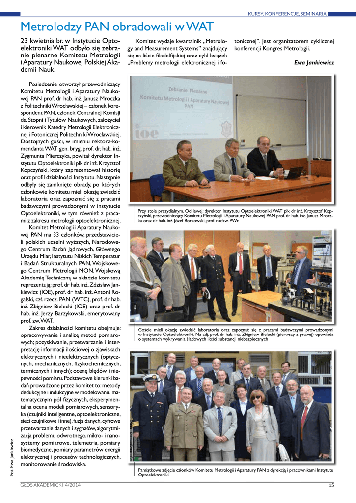 KURSY, KONFERENCJE, SEMINARIA Metrolodzy PAN obradowali w WAT Fot. Ewa Jankiewicz 23 kwietnia br. w Instytucie Optoelektroniki WAT odbyło się zebranie plenarne Komitetu Metrologii i Aparatury Naukowej Polskiej Akademii Nauk. Posiedzenie otworzył przewodniczący Komitetu Metrologii i Aparatury Naukowej PAN prof. dr hab. inż. Janusz Mroczka z Politechniki Wrocławskiej – członek korespondent PAN, członek Centralnej Komisji ds. Stopni i Tytułów Naukowych, założyciel i kierownik Katedry Metrologii Elektronicznej i Fotonicznej Politechniki Wrocławskiej. Dostojnych gości, w imieniu rektora-komendanta WAT gen. bryg. prof. dr. hab. inż. Zygmunta Mierczyka, powitał dyrektor Instytutu Optoelektroniki płk dr inż. Krzysztof Kopczyński, który zaprezentował historię oraz profil działalności Instytutu. Następnie odbyły się zamknięte obrady, po których członkowie komitetu mieli okazję zwiedzić laboratoria oraz zapoznać się z pracami badawczymi prowadzonymi w instytucie Optoelektroniki, w tym również z pracami z zakresu metrologii optoelektronicznej. Komitet Metrologii i Aparatury Naukowej PAN ma 33 członków, przedstawicieli polskich uczelni wyższych, Narodowego Centrum Badań Jądrowych, Głównego Urzędu Miar, Instytutu Niskich Temperatur i Badań Strukturalnych PAN, Wojskowego Centrum Metrologii MON. Wojskową Akademię Techniczną w składzie komitetu reprezentują: prof. dr hab. inż. Zdzisław Jankiewicz (IOE), prof. dr hab. inż. Antoni Rogalski, czł. rzecz. PAN (WTC), prof. dr hab. inż. Zbigniew Bielecki (IOE) oraz prof. dr hab. inż. Jerzy Barzykowski, emerytowany prof. zw. WAT. Zakres działalności komitetu obejmuje: opracowywanie i analizę metod pomiarowych; pozyskiwanie, przetwarzanie i interpretację informacji ilościowej o zjawiskach elektrycznych i nieelektrycznych (optycznych, mechanicznych, fizykochemicznych, termicznych i innych); ocenę błędów i niepewności pomiaru. Podstawowe kierunki badań prowadzone przez komitet to: metody dedukcyjne i indukcyjne w modelowaniu matematycznym pól fizycznych, eksperymentalna ocena modeli pomiarowych, sensoryka (czujniki inteligentne, optoelektroniczne, sieci czujnikowe i inne), fuzja danych, cyfrowe przetwarzanie danych i sygnałów, algorytmizacja problemu odwrotnego, mikro- i nanosystemy pomiarowe, telemetria, pomiary biomedyczne, pomiary parametrów energii elektrycznej i procesów technologicznych, monitorowanie środowiska. GŁOS AKADEMICKI 4/2014 Komitet wydaje kwartalnik „Metrology and Measurement Systems” znajdujący się na liście filadelfijskiej oraz cykl książek „Problemy metrologii elektronicznej i fo- tonicznej”. Jest organizatorem cyklicznej konferencji Kongres Metrologii. Ewa Jankiewicz Przy stole prezydialnym. Od lewej: dyrektor Instytutu Optoelektroniki WAT płk dr inż. Krzysztof Kopczyński, przewodniczący Komitetu Metrologii i Aparatury Naukowej PAN prof. dr hab. inż. Janusz Mroczka oraz dr hab. inż. Józef Borkowski, prof. nadzw. PWr. Goście mieli okazję zwiedzić laboratoria oraz zapoznać się z pracami badawczymi prowadzonymi w Instytucie Optoelektroniki. Na zdj. prof. dr hab. inż. Zbigniew Bielecki (pierwszy z prawej) opowiada o systemach wykrywania śladowych ilości substancji niebezpiecznych Pamiątkowe zdjęcie członków Komitetu Metrologii i Aparatury PAN z dyrekcją i pracownikami Instytutu Optoelektroniki 15