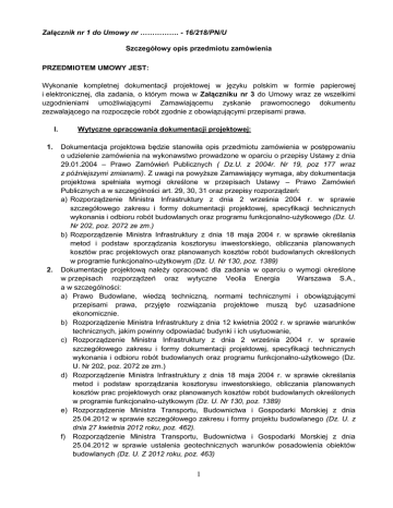 Załącznik nr 1 do Umowy nr ……………. - 16/218/PN/U Szczegółowy opis przedmiotu zamówienia PRZEDMIOTEM UMOWY JEST: Wykonanie kompletnej dokumentacji projektowej w języku polskim w formie papierowej i elektronicznej, dla zadania, o którym mowa w Załączniku nr 3 do Umowy wraz ze wszelkimi uzgodnieniami umożliwiającymi Zamawiającemu zyskanie prawomocnego dokumentu zezwalającego na rozpoczęcie robót zgodnie z obowiązującymi przepisami prawa. I. 1. 2. Wytyczne opracowania dokumentacji projektowej: Dokumentacja projektowa będzie stanowiła opis przedmiotu zamówienia w postępowaniu o udzielenie zamówienia na wykonawstwo prowadzone w oparciu o przepisy Ustawy z dnia 29.01.2004 – Prawo Zamówień Publicznych ( Dz.U. z 2004r. Nr 19, poz 177 wraz z późniejszymi zmianami). Z uwagi na powyższe Zamawiający wymaga, aby dokumentacja projektowa spełniała wymogi określone w przepisach Ustawy – Prawo Zamówień Publicznych a w szczególności art. 29, 30, 31 oraz przepisy rozporządzeń: a) Rozporządzenie Ministra Infrastruktury z dnia 2 września 2004 r. w sprawie szczegółowego zakresu i formy dokumentacji projektowej, specyfikacji technicznych wykonania i odbioru robót budowlanych oraz programu funkcjonalno-użytkowego (Dz. U. Nr 202, poz. 2072 ze zm.) b) Rozporządzenie Ministra Infrastruktury z dnia 18 maja 2004 r. w sprawie określania metod i podstaw sporządzania kosztorysu inwestorskiego, obliczania planowanych kosztów prac projektowych oraz planowanych kosztów robót budowlanych określonych w programie funkcjonalno-użytkowym (Dz. U. Nr 130, poz. 1389) Dokumentację projektową należy opracować dla zadania w oparciu o wymogi określone w przepisach rozporządzeń oraz wytyczne Veolia Energia Warszawa S.A., a w szczególności: a) Prawo Budowlane, wiedzą techniczną, normami technicznymi i obowiązującymi przepisami prawa, przyjęte rozwiązania projektowe muszą być uzasadnione ekonomicznie. b) Rozporządzenie Ministra Infrastruktury z dnia 12 kwietnia 2002 r. w sprawie warunków technicznych, jakim powinny odpowiadać budynki i ich usytuowanie, c) Rozporządzenie Ministra Infrastruktury z dnia 2 września 2004 r. w sprawie szczegółowego zakresu i formy dokumentacji projektowej, specyfikacji technicznych wykonania i odbioru robót budowlanych oraz programu funkcjonalno-użytkowego (Dz. U. Nr 202, poz. 2072 ze zm.) d) Rozporządzenie Ministra Infrastruktury z dnia 18 maja 2004 r. w sprawie określania metod i podstaw sporządzania kosztorysu inwestorskiego, obliczania planowanych kosztów prac projektowych oraz planowanych kosztów robót budowlanych określonych w programie funkcjonalno-użytkowym (Dz. U. Nr 130, poz. 1389) e) Rozporządzenie Ministra Transportu, Budownictwa i Gospodarki Morskiej z dnia 25.04.2012 w sprawie szczegółowego zakresu i formy projektu budowlanego (Dz. U. z dnia 27 kwietnia 2012 roku, poz. 462). f) Rozporządzenie Ministra Transportu, Budownictwa i Gospodarki Morskiej z dnia 25.04.2012 w sprawie ustalenia geotechnicznych warunków posadowienia obiektów budowlanych (Dz. U. Z 2012 roku, poz. 463) 1 g) oraz innymi niewymienionymi wyżej obowiązującymi przepisami prawa, a także warunkami pożarowymi, higienicznymi, zdrowotnymi, warunkami bezpieczeństwa i higieny pracy, innymi przepisami techniczno-budowlanymi określonymi w drodze rozporządzeń przez właściwych Ministrów, Polskie Normy i zasadami wiedzy technicznej. h) Dokumentacja budowy węzłów cieplnych powinna być opracowana zgodnie z „Wytycznymi projektowania węzłów cieplnych” część 1 i 2, opracowanymi przez HeatTech Center (dawniej OBRC SPEC S.A.) obowiązującymi od 15.02.2010 r., które są umieszczone na stronie internetowej www.energiadlawarszawy.pl w zakładce -> Strefa klienta -> Dla projektanta. i) Dokumentacja geodezyjna musi być zgodna z „Opracowaniem wymagań na dokumentację geodezyjną” z lutego 2011 r. opracowanym przez Heat-Tech Center (dawniej OBRC) – Veolia Energia Warszawa S.A. Opracowanie jest zamieszczone również na stronie internetowej www.energiadlawarszawy.pl w zakładce dla projektanta. j) Projekty sieci ciepłowniczej należy wykonać zgodnie z Zarządzeniem nr 1/2012 z dnia 21 lutego 2012 r. Veolia Energia Warszawa S.A. w sprawie rur przewodowych przeznaczonych do stosowania w warszawskim systemie ciepłowniczym (w.s.c.) oraz obowiązującymi „Wytycznymi wykonania, montażu, odbioru i eksploatacji rurociągów ciepłowniczych preizolowanych”, zamieszczonymi na stronie internetowej www.energiadlawarszawy.pl w zakładce dla projektanta. 3.Opracowanie dokumentacji projektowej należy wykonać przy uwzględnieniu n/w dokumentów i danych: a) warunków podłączenia do sieci ciepłowniczej: - indywidualnych węzłów cieplnych obecnie zasilanych z węzła grupowego Krzywe Koło 2/4 , z dn.14.07.2016r. (Załącznik nr 8A) - indywidualnych węzłów cieplnych obecnie zasilanych z węzła grupowego Świętojańska 7 , z dn.14.07.2016r. (Załącznik nr 8B) c) mapy GIS z naniesioną istniejącą siecią ciepłowniczą i budynkami, które są przewidziane do podłączenia (Załącznik nr 9 i 10) d) po ustaleniu i uzgodnieniu z właścicielami lokalizacji pomieszczeń na węzły cieplne należy zaproponować trasę sieci ciepłowniczej zgodnie z wydanymi warunkami podłączenia budynków i szacunkami i uzyskać na powyższe pisemną zgodę Działu Technologii Veolia Energia Warszawa S.A.(przed złożeniem do uzgodnienia na Naradzie Koordynacyjnej w BGiK- dawny ZUDP) e) średnice sieci ciepłowniczej i przyłączy należy zaprojektować na aktualne i szacowane zapotrzebowanie na ciepło i uzgodnić w formie pisemnej na etapie projektowania z Działem Technologii. Wykonawca zobowiązany jest do sprawdzenia istniejącej sieci niskoparametrowej preizolowanej i adaptacji tej sieci na potrzeby projektu w maksymalnym zakresie. Zakres ewentualnej przebudowy lub wymiany należy uzgodnić z Działem Technologii. f) projektowane 