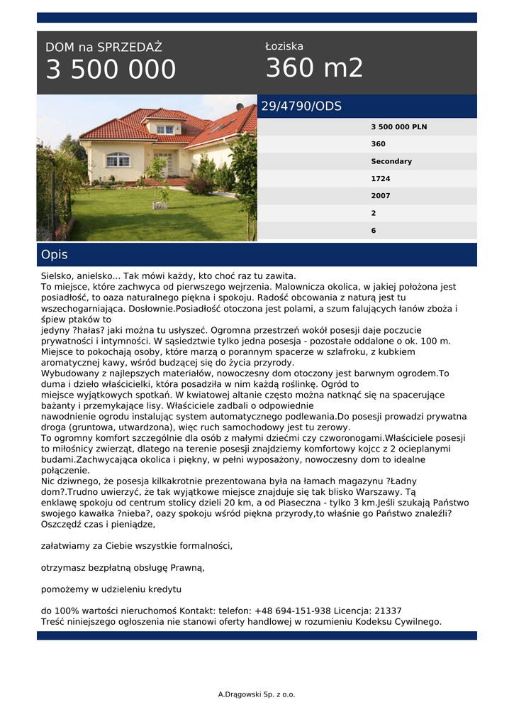 Łoziska DOM na SPRZEDAŻ 360 m2 3 500 000 29/4790/ODS 3 500 000 PLN 360 Secondary 1724 2007 2 6 Opis Sielsko, anielsko... Tak mówi każdy, kto choć raz tu zawita. To miejsce, które zachwyca od pierwszego wejrzenia. Malownicza okolica, w jakiej położona jest posiadłość, to oaza naturalnego piękna i spokoju. Radość obcowania z naturą jest tu wszechogarniająca. Dosłownie.Posiadłość otoczona jest polami, a szum falujących łanów zboża i śpiew ptaków to jedyny ?hałas? jaki można tu usłyszeć. Ogromna przestrzeń wokół posesji daje poczucie prywatności i intymności. W sąsiedztwie tylko jedna posesja - pozostałe oddalone o ok. 100 m. Miejsce to pokochają osoby, które marzą o porannym spacerze w szlafroku, z kubkiem aromatycznej kawy, wśród budzącej się do życia przyrody. Wybudowany z najlepszych materiałów, nowoczesny dom otoczony jest barwnym ogrodem.To duma i dzieło właścicielki, która posadziła w nim każdą roślinkę. Ogród to miejsce wyjątkowych spotkań. W kwiatowej altanie często można natknąć się na spacerujące bażanty i przemykające lisy. Właściciele zadbali o odpowiednie nawodnienie ogrodu instalując system automatycznego podlewania.Do posesji prowadzi prywatna droga (gruntowa, utwardzona), więc ruch samochodowy jest tu zerowy. To ogromny komfort szczególnie dla osób z małymi dziećmi czy czworonogami.Właściciele posesji to miłośnicy zwierząt, dlatego na terenie posesji znajdziemy komfortowy kojcc z 2 ocieplanymi budami.Zachwycająca okolica i piękny, w pełni wyposażony, nowoczesny dom to idealne połączenie. Nic dziwnego, że posesja kilkakrotnie prezentowana była na łamach magazynu ?Ładny dom?.Trudno uwierzyć, że tak wyjątkowe miejsce znajduje się tak blisko Warszawy. Tą enklawę spokoju od centrum stolicy dzieli 20 km, a od Piaseczna - tylko 3 km.Jeśli szukają Państwo swojego kawałka ?nieba?, oazy spokoju wśród piękna przyrody,to właśnie go Państwo znaleźli? Oszczędź czas i pieniądze, załatwiamy za Ciebie wszystkie formalności, otrzymasz bezpłatną obsługę Prawną, pomożemy w udzieleniu kredytu do 100% wartości nieruchomoś Kontakt: telefon: +48 694-151-938 Licencja: 21337 Treść niniejszego ogłoszenia nie stanowi oferty handlowej w rozumieniu Kodeksu Cywilnego. A.Drągowski Sp. z o.o. Agnieszka Andruszkiewicz tel. 694151938 email: [email protected] A.Drągowski Sp. z o.o. Powered by TCPDF (www.tcpdf.org)
