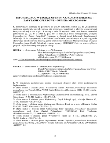 Gdańsk, dnia 02 marca 2016 roku INFORMACJA O WYBORZE OFERTY NAJKORZYSTNIEJSZEJ ZAPYTANIE OFERTOWE – NUMER: MZKZG/O/1/16 1. Zamawiający, działając na podstawie §5 pkt.34 załącznika numer 3A do „Regulaminu udzielania zamówień, których wartość nie przekracza wyrażonej w złotych równowartości kwoty określonej w art. 4 pkt. 8 ustawy z dnia 29 stycznia 2004 roku Prawo zamówień publicznych (tj. Dz. U. z 2013 r., poz. 907 z późn.zm.) przez Metropolitalny Związek Komunikacyjny Zatoki Gdańskiej” (zwanego w dalszej treści informacji Regulaminem) informuje, że w postępowaniu o udzielenie zamówienia prowadzonym w trybie zapytania ofertowego na sukcesywne dostawy gazety oraz dostawę ulotek do Metropolitalnego Związku Komunikacyjnego Zatoki Gdańskiej – numer sprawy: MZKZG/O/1/16 – w poszczególnych grupach - wybrane zostały następujące oferty: GRUPA 1 – oferta numer 5 złożona przez Wykonawcę : Piotr Teichman prowadzący działalność gospodarczą pod firmą Zakład Poligraficzny TECHGRAF Piotr Teichman ul.Podzwierzyniec 25, 37-100 Łańcut cena: 25 056 zł (słownie: dwadzieścia pięć tysięcy pięćdziesiąt sześć złotych). GRUPA 2 – oferta numer 1 – złożona przez Wykonawcę : Daniel Puławski prowadzący działalność gospodarczą pod firmą LIBRA-PRINT Daniel Puławski Al.Legionów 114B, 18-400 Łomża cena: 738 zł (słownie: siedemset trzydzieści osiem złotych). 2. W niniejszym postępowaniu zostało złożonych dziesięć ofert przez następujących Wykonawców : 1/ oferta numer 1 złożona przez Wykonawcę: Daniel Puławski prowadzący działalność gospodarczą pod firmą LIBRA-PRINT Daniel Puławski, Al.Legionów 114B, 18-400 Łomża– GRUPY: 1,2; 2/ oferta numer 2 złożona przez Wykonawcę: Drukarnia Pod Sikornikiem sp. z o.o., ul.Pod Sikornikiem 17, 30-216 Kraków –GRUPY: 1,2; 3/ oferta numer 3 złożona przez Wykonawcę: Zapol Sobczyk sp.j., ul.Aleja Piastów 42, 71-062 Szczecin– GRUPY: 1,2; 4/ oferta numer 4 złożona przez Wykonawcę: Business Point sp. z o.o., ul.Erazma Ciołka 11A/302, 01-402 Warszawa –GRUPY: 1,2; 5/ oferta numer 5 złożona przez Wykonawcę: Piotr Teichman prowadzący działalność gospodarczą pod firmą Zakład Poligraficzny TECHGRAF Piotr Teichman, ul.Podzwierzyniec 25, 37-100 Łańcut –GRUPY: 1,2; 6/ oferta numer 6 złożona przez Wykonawcę: Pasaż sp. z o.o., ul.Rydlówka 24, 30-363 Kraków –GRUPY: 1,2; 7/ oferta numer 7 złożona przez Wykonawcę: Helena Rąbalska prowadząca działalność gospodarczą pod firmą „HELDRUK” Helena Rąbalska ,ul.Partyzantów 3B, 82-200 Malbork –GRUPY: 1,2; 1/3 8/ oferta numer 8 złożona przez Wykonawcę: Przedsiębiorstwo Poligraficzno-Wydawnicze „MODENA” sp. z o.o. sp.k., ul.Chwarznieńska 170A/5, 81-602 Gdynia – GRUPY: 1,2; 9/ oferta numer 9 złożona przez Wykonawcę: Drukarnia WL sp. z o.o., ul.Elbląska 68C, 80-761 Gdańsk –GRUPY: 1,2; 10/ oferta numer 10 złożona przez Wykonawcę : Zbigniew Misiuro prowadzący działalność gospodarczą pod firmą Drukarnia „MISIURO” –Zbigniew Misiuro, ul.Gdańska 29, 80-518 Gdańsk –GRUPY: 1,2. 3. Streszczenie oceny i porównanie złożonych ofert. GRUPA 1 Nr oferty Cena (w zł) Ilość punktów za kryterium „cena” 1 26 784 93,55 2 35 280 ______________________ 3 40 608 61,70 4 25 920 96,67 5 25 056 100 6 34 560 72,50 7 31 104 80,56 8 43 296 _______________________ 9 29 376 85,29 10 38 880 64,44 Nr oferty Cena (w zł) Ilość punktów za kryterium „cena” 1 738 100 2 799,50 92,31 3 1 045,50* 70,58 4 1 537,50 48 5 984 75 6 922,50 80 7 1 107* 66,67 8 1 439,10 51,28 GRUPA 2 2/3 9 1 291,50 57,14 10 1 230 60 * po dokonaniu przez w obliczeniu ceny Zamawiającego poprawek oczywistych omyłek rachunkowych 4. Zamawiający informuje, że w GRUPIE 1 zostały odrzucone oferty złożone przez następujących Wykonawców : a) oferta numer 2 złożona przez Wykonawcę: Drukarnia Pod Sikornikiem sp. z o.o., ul.Pod Sikornikiem 17, 30-216 Kraków na podstawie §5 pkt.24 lit.d) załącznika numer 3A do Regulaminu. Uzasadnienie : dla przedmiotu zamówienia objętego GRUPĄ 1 obowiązuje symbol PKWiU 58.14.11.00 dla którego prawidłową stawką podatku VAT jest stawka 8% (zgodnie z treścią załącznika numer 3 poz.74 ustawy o podatku od towarów i usług) . Wykonawca dokonał obliczenia ceny przedmiotu zamówienia z uwzględnieniem 5% stawki podatku VAT, która jest stawką nieprawidłową . b) oferta numer 8 złożona przez Wykonawcę: Przedsiębiorstwo Poligraficzno-Wydawnicze „MODENA” sp. z o.o. sp.k., ul.Chwarznieńska 170A/5, 81-602 Gdynia na podstawie §5 pkt.24 lit.d) załącznika numer 3A do Regulaminu. Uzasadnienie : dla przedmiotu zamówienia objętego GRUPĄ 1 obowiązuje symbol PKWiU 58.14.11.00 dla którego prawidłową stawką podatku VAT jest stawka 8% (zgodnie z treścią załącznika numer 3 poz.74 ustawy o podatku od towarów i usług) . Wykonawca dokonał obliczenia ceny przedmiotu zamówienia z uwzględnieniem 23% stawki podatku VAT, która jest stawką nieprawidłową . 3/3