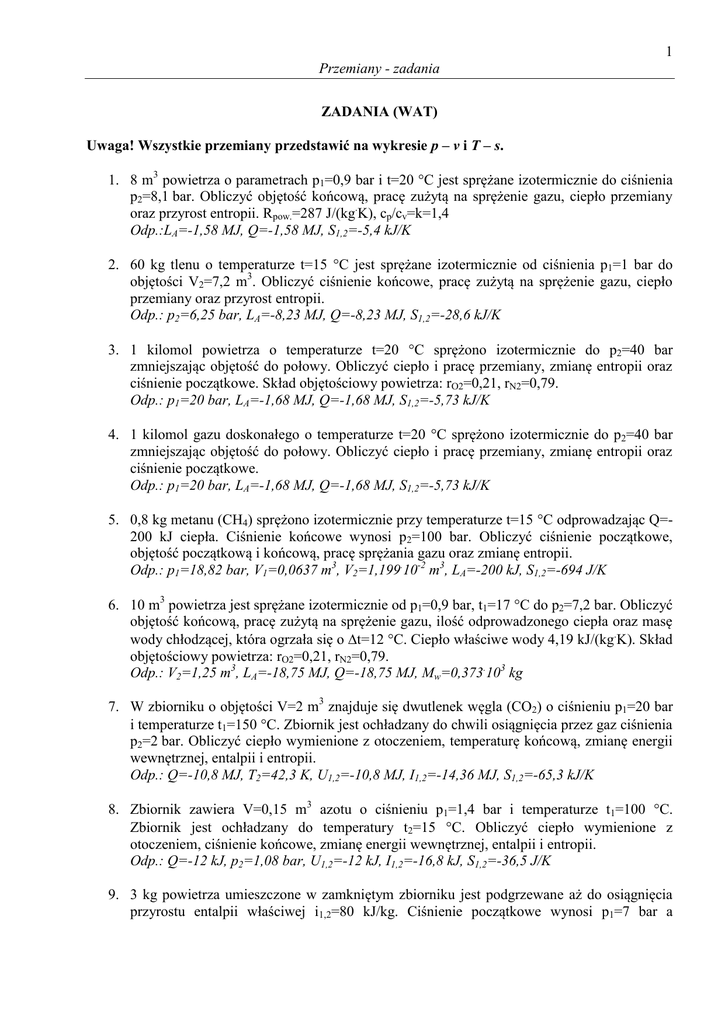 1 Przemiany - zadania ZADANIA (WAT) Uwaga! Wszystkie przemiany przedstawić na wykresie p – v i T – s. 1. 8 m3 powietrza o parametrach p1=0,9 bar i t=20 C jest sprężane izotermicznie do ciśnienia p2=8,1 bar. Obliczyć objętość końcową, pracę zużytą na sprężenie gazu, ciepło przemiany oraz przyrost entropii. Rpow.=287 J/(kg.K), cp/cv=k=1,4 Odp.:LA=-1,58 MJ, Q=-1,58 MJ, S1,2=-5,4 kJ/K 2. 60 kg tlenu o temperaturze t=15 C jest sprężane izotermicznie od ciśnienia p1=1 bar do objętości V2=7,2 m3. Obliczyć ciśnienie końcowe, pracę zużytą na sprężenie gazu, ciepło przemiany oraz przyrost entropii. Odp.: p2=6,25 bar, LA=-8,23 MJ, Q=-8,23 MJ, S1,2=-28,6 kJ/K 3. 1 kilomol powietrza o temperaturze t=20 C sprężono izotermicznie do p2=40 bar zmniejszając objętość do połowy. Obliczyć ciepło i pracę przemiany, zmianę entropii oraz ciśnienie początkowe. Skład objętościowy powietrza: rO2=0,21, rN2=0,79. Odp.: p1=20 bar, LA=-1,68 MJ, Q=-1,68 MJ, S1,2=-5,73 kJ/K 4. 1 kilomol gazu doskonałego o temperaturze t=20 C sprężono izotermicznie do p2=40 bar zmniejszając objętość do połowy. Obliczyć ciepło i pracę przemiany, zmianę entropii oraz ciśnienie początkowe. Odp.: p1=20 bar, LA=-1,68 MJ, Q=-1,68 MJ, S1,2=-5,73 kJ/K 5. 0,8 kg metanu (CH4) sprężono izotermicznie przy temperaturze t=15 C odprowadzając Q=200 kJ ciepła. Ciśnienie końcowe wynosi p2=100 bar. Obliczyć ciśnienie początkowe, objętość początkową i końcową, pracę sprężania gazu oraz zmianę entropii. Odp.: p1=18,82 bar, V1=0,0637 m3, V2=1,199.10-2 m3, LA=-200 kJ, S1,2=-694 J/K 6. 10 m3 powietrza jest sprężane izotermicznie od p1=0,9 bar, t1=17 C do p2=7,2 bar. Obliczyć objętość końcową, pracę zużytą na sprężenie gazu, ilość odprowadzonego ciepła oraz masę wody chłodzącej, która ogrzała się o t=12 C. Ciepło właściwe wody 4,19 kJ/(kg.K). Skład objętościowy powietrza: rO2=0,21, rN2=0,79. Odp.: V2=1,25 m3, LA=-18,75 MJ, Q=-18,75 MJ, Mw=0,373.103 kg 7. W zbiorniku o objętości V=2 m3 znajduje się dwutlenek węgla (CO2) o ciśnieniu p1=20 bar i temperaturze t1=150 C. Zbiornik jest ochładzany do chwili osiągnięcia przez gaz ciśnienia p2=2 bar. Obliczyć ciepło wymienione z otoczeniem, temperaturę końcową, zmianę energii wewnętrznej, entalpii i entropii. Odp.: Q=-10,8 MJ, T2=42,3 K, U1,2=-10,8 MJ, I1,2=-14,36 MJ, S1,2=-65,3 kJ/K 8. Zbiornik zawiera V=0,15 m3 azotu o ciśnieniu p1=1,4 bar i temperaturze t1=100 C. Zbiornik jest ochładzany do temperatury t2=15 C. Obliczyć ciepło wymienione z otoczeniem, ciśnienie końcowe, zmianę energii wewnętrznej, entalpii i entropii. Odp.: Q=-12 kJ, p2=1,08 bar, U1,2=-12 kJ, I1,2=-16,8 kJ, S1,2=-36,5 J/K 9. 3 kg powietrza umieszczone w zamkniętym zbiorniku jest podgrzewane aż do osiągnięcia przyrostu entalpii właściwej i1,2=80 kJ/kg. Ciśnienie początkowe wynosi p1=7 bar a 2 Przemiany - zadania temperatura końcowa t2=200 C. Obliczyć ciśnienie końcowe, ciepło przemiany i zmianę energii wewnętrznej. Stała gazowa powietrza R=287J/(kg·K), k = cp/cv= 1,4. Odp.: p2=8,4 bar, Q=172,2 kJ, U1,2=172,2 kJ 10. 1 kilogram powietrza o parametrach t1=47 C i p1=1,5 bar zwiększa objętość przy stałym ciśnieniu dopóki entropia nie zmieni się o 0,04 kJ/(kg.K). Obliczyć temperaturę końcową, ciepło i pracę przemiany, zmianę energii wewnętrznej i entalpii. Stała gazowa powietrza R=287 J(kg.K), k=cp/cv=1,4. Odp.:T2=333 K, Q=13,06 kJ, LA=3,75 kJ, U1,2=9,33 kJ, I1,2=13,06 kJ 11. W cylindrze z ruchomym tłokiem znajduje się 0,5 mN3 wodoru o parametrach p1=100658 Pa, t1=80 C. W wyniku doprowadzenia pewnej ilości ciepła temperatura wzrosła do t2=610 C. Obliczyć ilość doprowadzonego ciepła, pracę absolutną, zmianę energii wewnętrznej i entalpii, jeśli ciśnienie nie zmieniło się. Odp.: Q=344 kJ, LA=97,64 kJ, U1,2=245,6 kJ, I1,2=343,8 kJ 12. Azot podlega przemianie przy stałym ciśnieniu dopóki nie nastąpi przyrost energii wewnętrznej o 20 kJ/kg, a temperatura końcowa wyniesie 150 C. Obliczyć ciepło i pracę przemiany. Odp.: q=28 kJ/kg, lA=8 kJ/kg 13. Powietrze o temperaturze t1=27 C ogrzano przy stałym ciśnieniu aż do podwojenia objętości, podczas gdy entropia wzrosła o 0,06 kJ/K. Obliczyć masę powietrza, przyrost energii wewnętrznej, ciepło i pracę absolutną przemiany. Stała gazowa powietrza R=287J/(kg.K), k = cp/cv= 1,4. Odp.: M=0,086 kg, U1,2=18,5 kJ, Q=25,9 kJ, LA=7,4 kJ, 14. 1 kilomol azotu o temperaturze początkowej t1=300 C rozpręża się izentropowo od p1=7 bar do p2=0,7 bar. Obliczyć ciepło i pracę absolutną przemiany, zmianę energii wewnętrznej i entalpii. Odp.: Q=0 kJ, LA=5,74 MJ, U1,2=-5,74 MJ, I1,2=-8,033 MJ 15. 0,4 kg powietrza sprężono izentropowo od temperatury t1=50C, przy czym objętość zmniejszyła się do połowy. Obliczyć pracę absolutną przemiany, przyrost energii wewnętrznej i entalpii. Parametry powietrza R=287 J/(kg.K), k = cp/cv= 1,4. Odp.: LA=-29,56 kJ, U1,2=29,56 kJ, I1,2=41,38 kJ 16. 1 kg argonu Ar (M=40 kg/kmol) rozprężył się izentropowo od temperatury t1=150 C, przy czym ciśnienie spadło do połowy. Obliczyć pracę absolutną przemiany, zmianę energii wewnętrznej, entalpii i entropii oraz stosunek objętości po i przed rozprężeniem. Odp.: LA=32,13 kJ, U1,2=-32,13 kJ, I1,2=-53,33 kJ, S1,2=0, (V2/V1)=1,518 17. 1 kmol tlenu o ciśnieniu p1=1,4 bar i temperaturze t1=37C sprężono izentropowo aż do podwojenia ciśnienia. Obliczyć temperaturę końcową i pracę absolutną przemiany. Odp.: T2=378 K, LA=-1,41 MJ 18. 1 kmol gazu dwuatomowego o ciśnieniu p1=1,4 bar i temperaturze t1=37C sprężono izentropowo aż do podwojenia ciśnienia. Obliczyć temperaturę końcową i pracę absolutną przemiany. Odp.: T2=378 K, LA=-1,41 MJ 3 Przemiany - zadania 19. Powietrze jest sprężana politropowo z wykładnikiem n = 1,3 od ciśnienia 0,1 MPa i temperatury 20°C do ciśnienia 0,2 MPa. Masa powietrza wynosi 0, 51 kg. O