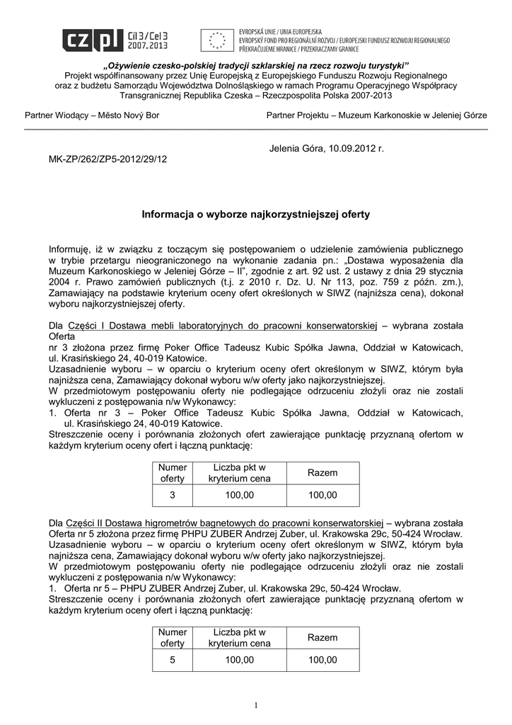 „Ożywienie czesko-polskiej tradycji szklarskiej na rzecz rozwoju turystyki” Projekt współfinansowany przez Unię Europejską z Europejskiego Funduszu Rozwoju Regionalnego oraz z budżetu Samorządu Województwa Dolnośląskiego w ramach Programu Operacyjnego Współpracy Transgranicznej Republika Czeska – Rzeczpospolita Polska 2007-2013 Partner Wiodący – Mĕsto Nový Bor Partner Projektu – Muzeum Karkonoskie w Jeleniej Górze _________________________________________________________________________________________________ Jelenia Góra, 10.09.2012 r. MK-ZP/262/ZP5-2012/29/12 Informacja o wyborze najkorzystniejszej oferty Informuję, iż w związku z toczącym się postępowaniem o udzielenie zamówienia publicznego w trybie przetargu nieograniczonego na wykonanie zadania pn.: „Dostawa wyposażenia dla Muzeum Karkonoskiego w Jeleniej Górze – II”, zgodnie z art. 92 ust. 2 ustawy z dnia 29 stycznia 2004 r. Prawo zamówień publicznych (t.j. z 2010 r. Dz. U. Nr 113, poz. 759 z późn. zm.), Zamawiający na podstawie kryterium oceny ofert określonych w SIWZ (najniższa cena), dokonał wyboru najkorzystniejszej oferty. Dla Części I Dostawa mebli laboratoryjnych do pracowni konserwatorskiej – wybrana została Oferta nr 3 złożona przez firmę Poker Office Tadeusz Kubic Spółka Jawna, Oddział w Katowicach, ul. Krasińskiego 24, 40-019 Katowice. Uzasadnienie wyboru – w oparciu o kryterium oceny ofert określonym w SIWZ, którym była najniższa cena, Zamawiający dokonał wyboru w/w oferty jako najkorzystniejszej. W przedmiotowym postępowaniu oferty nie podlegające odrzuceniu złożyli oraz nie zostali wykluczeni z postępowania n/w Wykonawcy: 1. Oferta nr 3 – Poker Office Tadeusz Kubic Spółka Jawna, Oddział w Katowicach, ul. Krasińskiego 24, 40-019 Katowice. Streszczenie oceny i porównania złożonych ofert zawierające punktację przyznaną ofertom w każdym kryterium oceny ofert i łączną punktację: Numer oferty Liczba pkt w kryterium cena Razem 3 100,00 100,00 Dla Części II Dostawa higrometrów bagnetowych do pracowni konserwatorskiej – wybrana została Oferta nr 5 złożona przez firmę PHPU ZUBER Andrzej Zuber, ul. Krakowska 29c, 50-424 Wrocław. Uzasadnienie wyboru – w oparciu o kryterium oceny ofert określonym w SIWZ, którym była najniższa cena, Zamawiający dokonał wyboru w/w oferty jako najkorzystniejszej. W przedmiotowym postępowaniu oferty nie podlegające odrzuceniu złożyli oraz nie zostali wykluczeni z postępowania n/w Wykonawcy: 1. Oferta nr 5 – PHPU ZUBER Andrzej Zuber, ul. Krakowska 29c, 50-424 Wrocław. Streszczenie oceny i porównania złożonych ofert zawierające punktację przyznaną ofertom w każdym kryterium oceny ofert i łączną punktację: Numer oferty Liczba pkt w kryterium cena Razem 5 100,00 100,00 1 Dla Części III Dostawa zamrażarki do pracowni konserwatorskiej – wybrana została Oferta nr 6 złożona przez firmę PHPU ZUBER Andrzej Zuber, ul. Krakowska 29c, 50-424 Wrocław. Uzasadnienie wyboru – w oparciu o kryterium oceny ofert określonym w SIWZ, którym była najniższa cena, Zamawiający dokonał wyboru w/w oferty jako najkorzystniejszej. W przedmiotowym postępowaniu oferty nie podlegające odrzuceniu złożyli oraz nie zostali wykluczeni z postępowania n/w Wykonawcy: 1. Oferta nr 6 – PHPU ZUBER Andrzej Zuber, ul. Krakowska 29c, 50-424 Wrocław, Streszczenie oceny i porównania złożonych ofert zawierające punktację przyznaną ofertom w każdym kryterium oceny ofert i łączną punktację: Numer oferty Liczba pkt w kryterium cena Razem 6 100,00 100,00 Dla Części IV Dostawa wyciągu stanowiskowego do pracowni konserwatorskiej – wybrana została Oferta nr 7 złożona przez firmę PHPU ZUBER Andrzej Zuber, ul. Krakowska 29c, 50-424 Wrocław. Uzasadnienie wyboru – w oparciu o kryterium oceny ofert określonym w SIWZ, którym była najniższa cena, Zamawiający dokonał wyboru w/w oferty jako najkorzystniejszej. W przedmiotowym postępowaniu oferty nie podlegające odrzuceniu złożyli oraz nie zostali wykluczeni z postępowania n/w Wykonawcy: 1. Oferta nr 7 – PHPU ZUBER Andrzej Zuber, ul. Krakowska 29c, 50-424 Wrocław, Streszczenie oceny i porównania złożonych ofert zawierające punktację przyznaną ofertom w każdym kryterium oceny ofert i łączną punktację: Numer oferty Liczba pkt w kryterium cena Razem 7 100,00 100,00 Dla Części V Dostawa odkurzaczy do pracowni konserwatorskiej – wybrana została Oferta nr 8 złożona przez firmę PHPU ZUBER Andrzej Zuber, ul. Krakowska 29c, 50-424 Wrocław. Uzasadnienie wyboru – w oparciu o kryterium oceny ofert określonym w SIWZ, którym była najniższa cena, Zamawiający dokonał wyboru w/w oferty jako najkorzystniejszej. W przedmiotowym postępowaniu oferty nie podlegające odrzuceniu złożyli oraz nie zostali wykluczeni z postępowania n/w Wykonawcy: 1. Oferta nr 8 – PHPU ZUBER Andrzej Zuber, ul. Krakowska 29c, 50-424 Wrocław. Streszczenie oceny i porównania złożonych ofert zawierające punktację przyznaną ofertom w każdym kryterium oceny ofert i łączną punktację: Numer oferty Liczba pkt w kryterium cena Razem 8 100,00 100,00 Dla Części VI Dostawa wyposażenia magazynów – szafy (komody) na rysunki i grafiki – wybrana została Oferta nr 2 złożona przez firmę BENER Michał Benka, ul. Wileńska 59B/15, 80-215 Gdańsk. Uzasadnienie wyboru – w oparciu o kryterium oceny ofert określonym w SIWZ, którym była najniższa cena, Zamawiający dokonał wyboru w/w oferty jako najkorzystniejszej. W przedmiotowym postępowaniu oferty nie podlegające odrzuceniu złożyli oraz nie zostali wykluczeni z postępowania n/w Wykonawcy: 1. Oferta nr 1 - Pozmebel Mateusz Gawroński Spółka Jawna, ul. Starołęcka 18, 61-361 Poznań, 2. Oferta nr 2 - BENER Michał Benka, ul. Wileńska 59B/15, 80-215 Gdańsk, 3. Oferta nr 3A - Pokker Office Tadeusz Kubic Spółka Jawna, Oddział w Katowicach, ul. Krasińskiego 24, 40-019 Ka