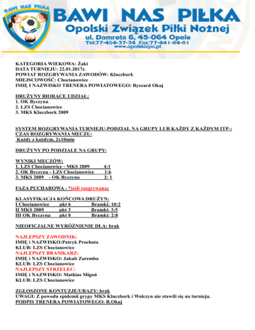 KATEGORIA WIEKOWA: Żaki DATA TURNIEJU: 22.01.2017r. POWIAT ROZGRYWANIA ZAWODÓW: Kluczbork MIEJSCOWOŚĆ: Chocianowice IMIĘ I NAZWISKO TRENERA POWIATOWEGO: Ryszard Okaj DRUŻYNY BIORĄCE UDZIAŁ: 1. OK Byczyna 2. LZS Chocianowice 3. MKS Kluczbork 2009 SYSTEM ROZGRYWANIA TURNIEJU-PODZIAŁ NA GRUPY LUB KAŻDY Z KAŻDYM ITP-: CZAS ROZGRYWANIA MECZU: Każdy z każdym, 2x10min DRUŻYNY PO PODZIALE NA GRUPY: WYNIKI MECZÓW: 1. LZS Chocianowice - MKS 2009 2. OK Byczyna - LZS Chocianowice 3. MKS 2009 - OK Byczyna 4:1 1:6 2: 1 FAZA PUCHAROWA - *jeśli rozgrywana: KLASYFIKACJA KOŃCOWA DRUŻYN: I Chocianowice pkt 6 Bramki: 10:2 II MKS 2009 pkt 3 Bramki: 3:5 III OK Byczyna pkt 0 Bramki: 2:8 NIEOFICJALNE WYRÓŻNIENIE DLA: brak NAJLEPSZY ZAWODNIK: IMIĘ i NAZWISKO:Patryk Prochota KLUB: LZS Chocianowice NAJLEPSZY BRAMKARZ: IMIĘ i NAZWISKO: Jakub Zaremba KLUB: LZS Chocianowice NAJLEPSZY STRZELEC: IMIĘ i NAZWISKO: Mathias Migoń KLUB: LZS Chocianowice ZGŁOSZONE KONTUZJE/URAZY: brak UWAGI: Z powodu epidemii grypy MKS Kluczbork i Wołczyn nie stawili się na turnieju. PODPIS TRENERA POWIATOWEGO: R.Okaj