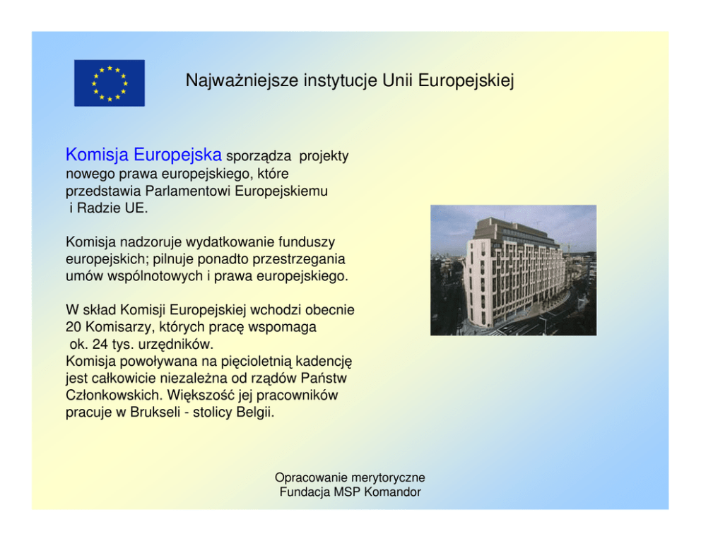 Najwa niejsze instytucje Unii Europejskiej Komisja Europejska sporz dza projekty nowego prawa europejskiego, które przedstawia Parlamentowi Europejskiemu i Radzie UE. Komisja nadzoruje wydatkowanie funduszy europejskich; pilnuje ponadto przestrzegania umów wspólnotowych i prawa europejskiego. W skład Komisji Europejskiej wchodzi obecnie 20 Komisarzy, których prac wspomaga ok. 24 tys. urz dników. Komisja powoływana na pi cioletni kadencj jest całkowicie niezale na od rz dów Pa stw Członkowskich. Wi kszo jej pracowników pracuje w Brukseli - stolicy Belgii. Opracowanie merytoryczne Fundacja MSP Komandor Najwa niejsze instytucje Unii Europejskiej Parlament Europejski Jest to najwi kszy wielonarodowy parlament na wiecie. Comiesi czne posiedzenia odbywaj si w Strasburgu, dodatkowe sesje i spotkania Komisji - w Brukseli. Sekretariat Generalny mie ci si w Luksemburgu. Kadencja parlamentu trwa 5 lat. Przewodnicz cy i wiceprzewodnicz cy s wybierani na połow kadencji Parlamentu, czyli na 2,5 roku. Opracowanie merytoryczne Fundacja MSP Komandor Najwa niejsze instytucje Unii Europejskiej Trybunał Sprawiedliwo ci Został utworzony w 1953 r. Trybunał Sprawiedliwo ci dokonuje interpretacji prawa europejskiego i kontroluje jego przestrzeganie. Trybunał ma siedzib w Luksemburgu, jego wyroki s niepodwa alne. Opracowanie merytoryczne Fundacja MSP Komandor