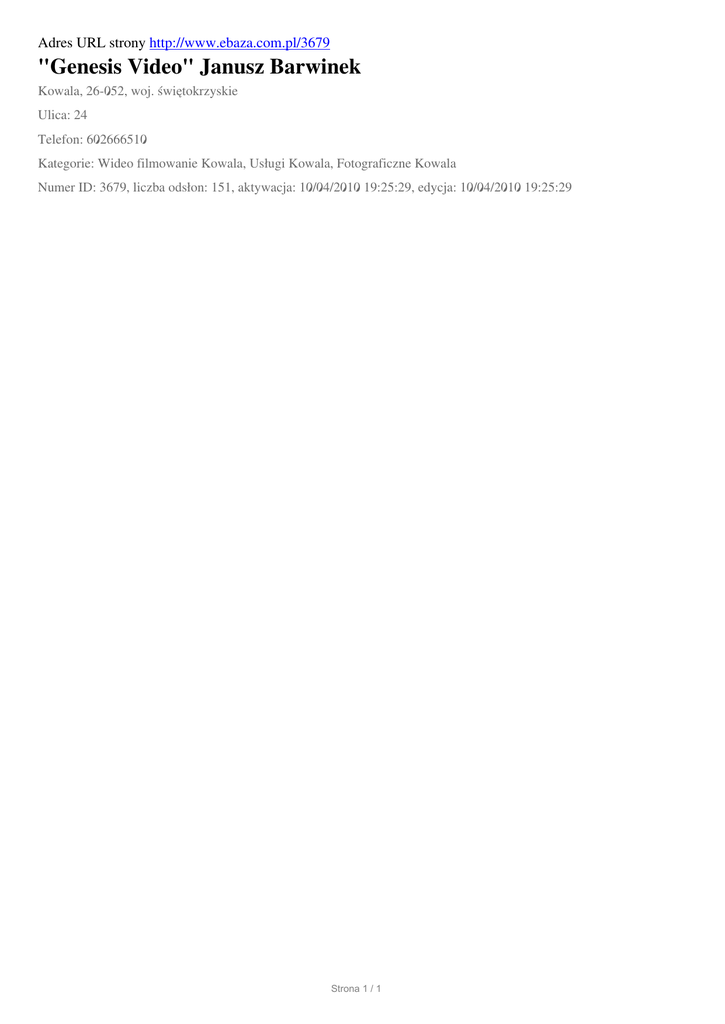 "Genesis Video" Janusz Barwinek, Kowala, 24