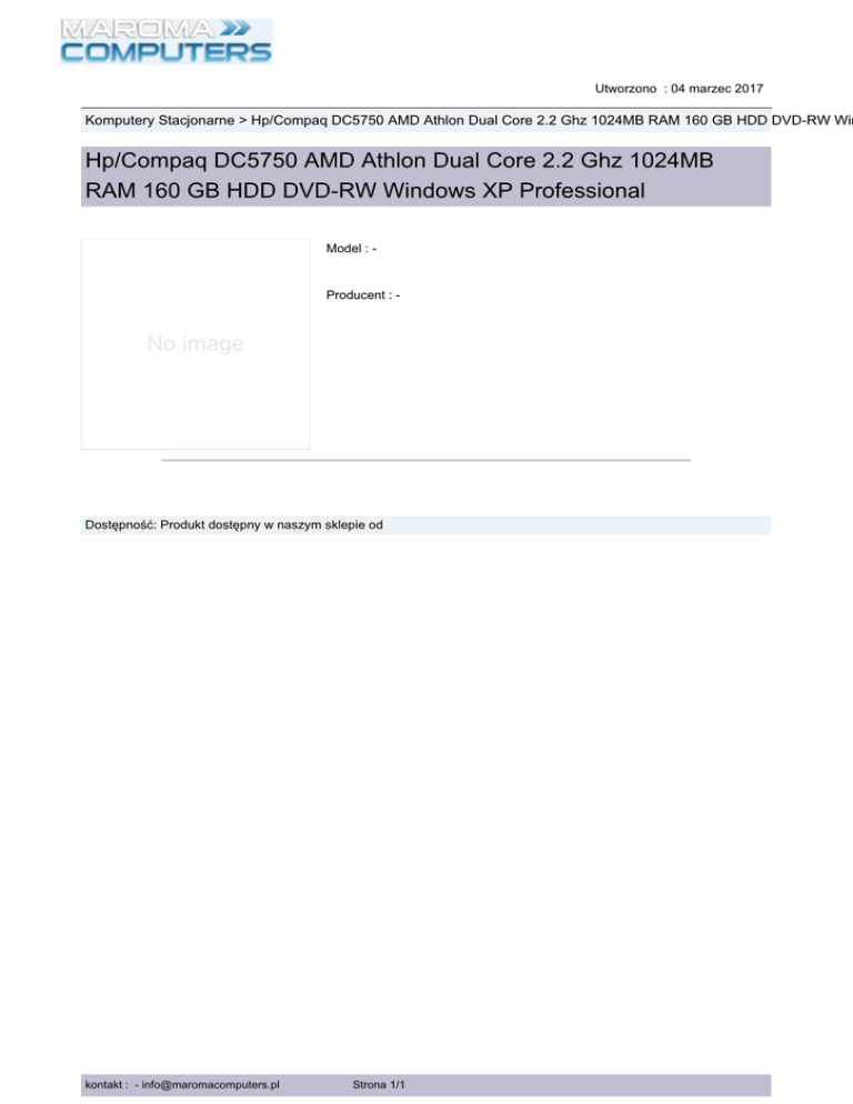 Utworzono : 04 marzec 2017 Komputery Stacjonarne > Hp/Compaq DC5750 AMD Athlon Dual Core 2.2 Ghz 1024MB RAM 160 GB HDD DVD-RW Win Hp/Compaq DC5750 AMD Athlon Dual Core 2.2 Ghz 1024MB RAM 160 GB HDD DVD-RW Windows XP Professional Model : - s r te Producent : - No image C a Dostępność: Produkt dostępny w naszym sklepie od m ro a M kontakt : - [email protected] Strona 1/1 m o u p