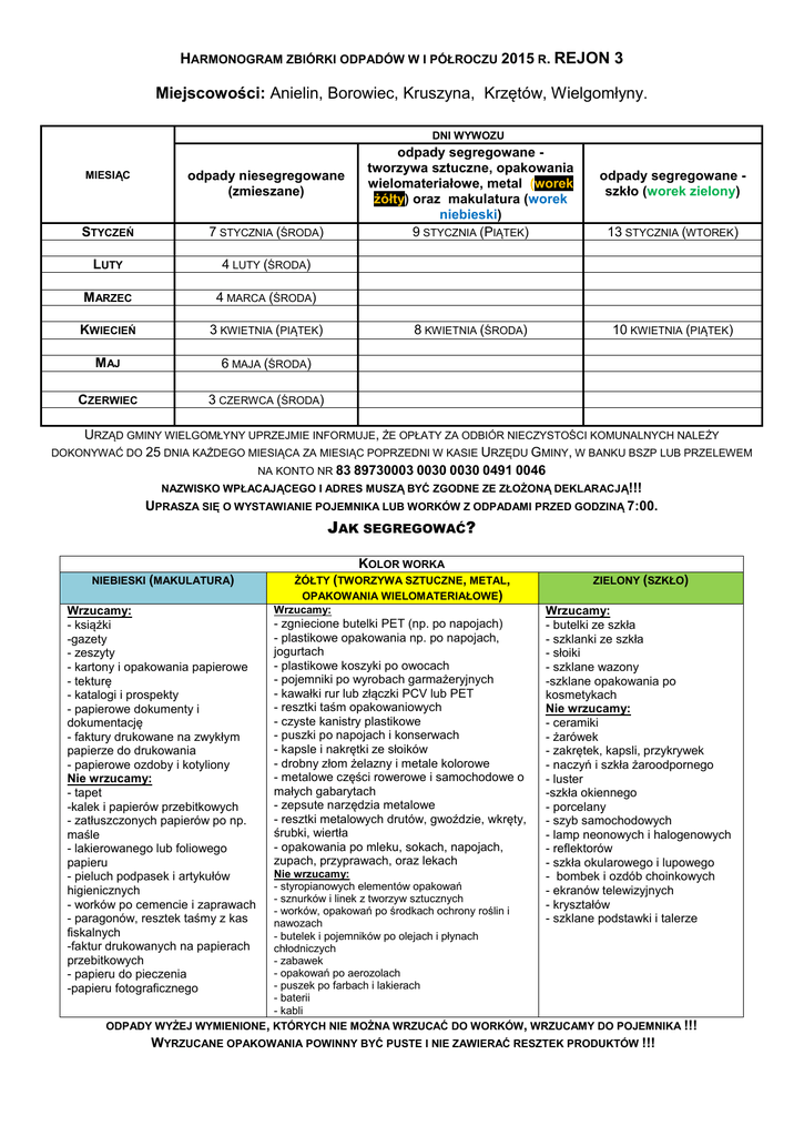HARMONOGRAM ZBIÓRKI ODPADÓW W I PÓŁROCZU 2015 R. REJON 3 Miejscowości: Anielin, Borowiec, Kruszyna, Krzętów, Wielgomłyny. DNI WYWOZU MIESIĄC odpady niesegregowane (zmieszane) STYCZEŃ 7 STYCZNIA (ŚRODA) LUTY 4 LUTY (ŚRODA) M ARZEC 4 MARCA (ŚRODA) KWIECIEŃ 3 KWIETNIA (PIĄTEK) M AJ 6 MAJA (ŚRODA) CZERWIEC 3 CZERWCA (ŚRODA) odpady segregowane tworzywa sztuczne, opakowania wielomateriałowe, metal (worek żółty) oraz makulatura (worek niebieski) 9 STYCZNIA (PIĄTEK) 8 KWIETNIA (ŚRODA) odpady segregowane szkło (worek zielony) 13 STYCZNIA (WTOREK) 10 KWIETNIA (PIĄTEK) URZĄD GMINY WIELGOMŁYNY UPRZEJMIE INFORMUJE, ŻE OPŁATY ZA ODBIÓR NIECZYSTOŚCI KOMUNALNYCH NALEŻY DOKONYWAĆ DO 25 DNIA KAŻDEGO MIESIĄCA ZA MIESIĄC POPRZEDNI W KASIE URZĘDU GMINY, W BANKU BSZP LUB PRZELEWEM NA KONTO NR 83 89730003 0030 0030 0491 0046 NAZWISKO WPŁACAJĄCEGO I ADRES MUSZĄ BYĆ ZGODNE ZE ZŁOŻONĄ DEKLARACJĄ!!! UPRASZA SIĘ O WYSTAWIANIE POJEMNIKA LUB WORKÓW Z ODPADAMI PRZED GODZINĄ 7:00. JAK SEGREGOWAĆ? NIEBIESKI (MAKULATURA) Wrzucamy: - książki -gazety - zeszyty - kartony i opakowania papierowe - tekturę - katalogi i prospekty - papierowe dokumenty i dokumentację - faktury drukowane na zwykłym papierze do drukowania - papierowe ozdoby i kotyliony Nie wrzucamy: - tapet -kalek i papierów przebitkowych - zatłuszczonych papierów po np. maśle - lakierowanego lub foliowego papieru - pieluch podpasek i artykułów higienicznych - worków po cemencie i zaprawach - paragonów, resztek taśmy z kas fiskalnych -faktur drukowanych na papierach przebitkowych - papieru do pieczenia -papieru fotograficznego KOLOR WORKA ŻÓŁTY (TWORZYWA SZTUCZNE, METAL, OPAKOWANIA WIELOMATERIAŁOWE) Wrzucamy: - zgniecione butelki PET (np. po napojach) - plastikowe opakowania np. po napojach, jogurtach - plastikowe koszyki po owocach - pojemniki po wyrobach garmażeryjnych - kawałki rur lub złączki PCV lub PET - resztki taśm opakowaniowych - czyste kanistry plastikowe - puszki po napojach i konserwach - kapsle i nakrętki ze słoików - drobny złom żelazny i metale kolorowe - metalowe części rowerowe i samochodowe o małych gabarytach - zepsute narzędzia metalowe - resztki metalowych drutów, gwoździe, wkręty, śrubki, wiertła - opakowania po mleku, sokach, napojach, zupach, przyprawach, oraz lekach ZIELONY (SZKŁO) Wrzucamy: - butelki ze szkła - szklanki ze szkła - słoiki - szklane wazony -szklane opakowania po kosmetykach Nie wrzucamy: - ceramiki - żarówek - zakrętek, kapsli, przykrywek - naczyń i szkła żaroodpornego - luster -szkła okiennego - porcelany - szyb samochodowych - lamp neonowych i halogenowych - reflektorów - szkła okularowego i lupowego - bombek i ozdób choinkowych - ekranów telewizyjnych - kryształów - szklane podstawki i talerze Nie wrzucamy: - styropianowych elementów opakowań - sznurków i linek z tworzyw sztucznych - worków, opakowań po środkach ochrony roślin i nawozach - butelek i pojemników po olejach i płynach chłodniczych - zabawek - opakowań po aerozolach - puszek po farbach i lakierach - baterii - kabli ODPADY WYŻEJ WYMIENIONE, KTÓRYCH NIE MOŻNA WRZUCAĆ DO WORKÓW, WRZUCAMY DO POJEMNIKA !!! WYRZUCANE OPAKOWANIA POWINNY BYĆ PUSTE I NIE ZAWIERAĆ RESZTEK PRODUKTÓW !!!