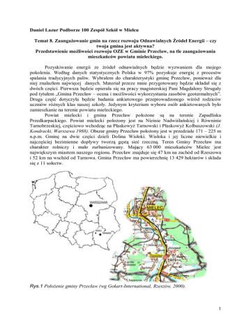 Daniel Lazur Podborze 100 Zespół Szkół w Mielcu Temat 8. Zaangażowanie gmin na rzecz rozwoju Odnawialnych Źródeł Energii – czy twoja gmina jest aktywna? Przedstawienie możliwości rozwoju OZE w Gminie Przecław, na tle zaangażowania mieszkańców powiatu mieleckiego. Pozyskiwanie energii ze źródeł odnawialnych będzie wyzwaniem dla mojego pokolenia. Według danych statystycznych Polska w 97% pozyskuje energię z procesów spalania tradycyjnych paliw. Wybrałem do charakterystyki gminę Przecław, ponieważ dla niej znalazłem najwięcej danych. Materiał przeze mnie przygotowany będzie składał się z dwóch części. Pierwsza będzie opierała się na pracy magisterskiej Pani Magdaleny Strugały pod tytułem „Gmina Przecław – ocena i możliwości wykorzystania zasobów geotermalnych”. Druga część dotyczyła będzie badania ankietowego przeprowadzonego wśród rodziców uczniów różnych klas naszej szkoły. Jedynym kryterium wyboru osób ankietowanych było zamieszkanie na terenie powiatu mieleckiego. Powiat mielecki i gmina Przecław położone są na terenie Zapadliska Przedkarpackiego. Powiat mielecki położony jest na Nizinie Nadwiślańskiej i Równinie Tarnobrzeskiej, częściowo wchodząc na Płaskowyż Tarnowski i Płaskowyż Kolbuszowski (J. Kondracki, Warszawa 1988). Obszar gminy Przecław położony jest w przedziale 171 – 225 m n.p.m. Gminę na dwie części dzieli Dolina Wisłoki. Wisłoka i jej liczne niewielkie i najczęściej bezimienne dopływy tworzą gęstą sieć rzeczną. Teren Gminy Przecław ma charakter rolniczy i mało zurbanizowany. Mający 63 000 mieszkańców Mielec jest największym miastem naszego regionu. Przecław znajduje się 47 km na zachód od Rzeszowa i 52 km na wschód od Tarnowa. Gmina Przecław ma powierzchnię 13 429 hektarów i składa się z 11 sołectw. Rys.1 Położenie gminy Przecław (wg Gokart-International, Rzeszów, 2000). 1 Wody podziemne na terenie gminy występują na różnych głębokościach nawiązując do rzeźby terenu i zależą od budowy geologicznej. Bezpośrednio w pobliżu koryta rzeki wody podziemne występują już od głębokości 0,5 m do1,5 m. Wahania wód podziemnych powiązane są z wahaniami lustra wody Wisłoki. Na terenie terasów akumulacyjnych wysokość pierwszego poziomu wód podziemnych wynosi od 1,5 – 5 m. Głębokość wód podziemnych w dużym stopniu zależy również od wielkości opadów. Ostatni rok (2010) należał do bardzo mokrych. Na obszarach płaskowyżów, zbudowanych z glin lodowcowych i utworów wodnolodowcowych, wody podziemne znajdują się na głębokościach 5-6 m i więcej M. Strugała, Sosnowiec 2008). Część gminy Przecław położona na lewym brzegu rzeki Wisłoki charakteryzuje się niedoborem wody (M. Strugała, Sosnowiec 2008). Prawobrzeżna część gminy położona jest w obrębie Głównego Zbiornika Wód Podziemnych nr 425 „Dębica – Stalowa Wola –Rzeszów”. Wody te są związane z warstwą wodonośną poziomu młodoneogeńskiego. Skałami zbiornikowymi są plejstoceńskie i holoceńskie utwory piaszczyste i piaszczysto–żwirowe Pradoliny Podkarpackiej (M. Strugała, Sosnowiec 2008). Zasilanie poziomu czwartorzędowych wód podziemnych następuje przede wszystkim poprzez infiltrację opadów atmosferycznych. Ze względu na zróżnicowany charakter naturalnych warunków środowiska gminy wykształciły się różnorodne gleby. Przeważają gleby piaszczyste i piaszczysto-gliniaste tworzące dobre i słabe kompleksy glebowe. Wśród gruntów ornych 28 % zajmują gleby o bardzo dobrej i dobrej jakości. Gleby średnie to 20,1 %. Dominują gleby o słabej i bardzo słabej jakości, które stanowią 51,9 % gruntów ornych (M. Strugała, sosnowiec 2008). Terytorium gminy Przecław charakteryzuje się bardzo małymi spadkami terenu oraz brakiem wyraźnie wciętych dolin. Wyjątek stanowi rozległa dolina rzeki Wisłoki, która intensywnie pogłębia swoje koryto wcinając się pomiędzy Płaskowyż Kolbuszowski i Płaskowyż Tarnowski. Część gminy położona na lewym brzegu Wisłoki znajduje się na terasie nadzalewowej o dość dużej wysokości dochodzącej do około 10 m (M. Strugała, Sosnowiec 2008). Na terasie zalewowej występują liczne starorzecza. Prawobrzeżna część gminy Przecław znajduje się na falistych równinach denudacyjno-peryglacjalnych (M. Strugała, Sosnowiec 2008). Odnosząc się do budowy geologicznej należy przypomnieć, że teren gminy Przecław położony jest w obrębie Zapadliska Przedkarpackiego powstałego w czasie orogenezy alpejskiej na przełomie paleogenu i neogenu. Teren gminy Przecław był wielokrotnie badany przez różne instytucje poszukujące ropy naftowej i gazu ziemnego. Według dokonanych przez nich odwiertów najstarsze skały znajdują się na północ od gminy i są wieku prekambryjskiego (łupki ilaste i mułowce kwarcytowe). Od północnej strony stwierdzono wierceniami występowanie również osadów paleozoicznych wieku dewońskiego: piaskowców, mułowców, zlepieńców, łupków, iłowców, wapieni, dolomitów i margli. Pod całym obszarem gminy stwierdzono występowanie utworów wieku triasowego takich jak: zlepieńce, piaskowce, iłowce, wapienie i margle. Na nich zalegają morskie osady miocenu takie jak: iły i iłowce oraz piaski i piaskowce. W plejstocenie na skutek działalności lądolodu strop osadów mioceńskich został zerodowany i osadziły się na nich gliny zwałowe i osady wodnolodowcowe. Na terenie gminy znajdują się trzy obszary górnicze wydobycia ropy naftowej i gazu ziemnego. Są to: Łączki Brzeskie, Korzeniów – Męciszów oraz Blizna – Ocieka. Eksploatację w złożu „Łączki Brzeskie” zakończono ze względów ekonomicznych. Przeprowadzono prace likwidacyjne i rekultywacyjne (M. Strugała, Sosnowiec 2008). We wschodniej części gminy Przecław występują duże złoża torfu w Rzemieniu, Dobryninie i Białym Borze. Zasoby dwóch złóż w Rzem