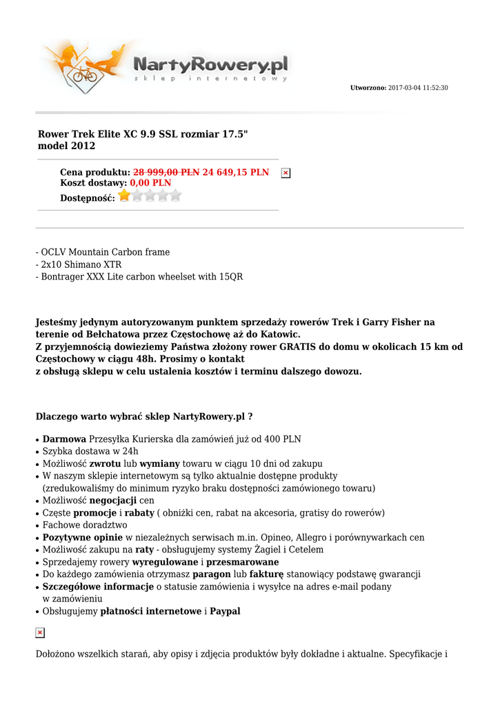 Utworzono: 2017-03-04 11:52:30 Rower Trek Elite XC 9.9 SSL rozmiar 17.5" model 2012 Cena produktu: 28 999,00 PLN 24 649,15 PLN Koszt dostawy: 0,00 PLN Dostępność: - OCLV Mountain Carbon frame - 2x10 Shimano XTR - Bontrager XXX Lite carbon wheelset with 15QR Jesteśmy jedynym autoryzowanym punktem sprzedaży rowerów Trek i Garry Fisher na terenie od Bełchatowa przez Częstochowę aż do Katowic. Z przyjemnością dowieziemy Państwa złożony rower GRATIS do domu w okolicach 15 km od Częstochowy w ciągu 48h. Prosimy o kontakt z obsługą sklepu w celu ustalenia kosztów i terminu dalszego dowozu. Dlaczego warto wybrać sklep NartyRowery.pl ? ● ● ● ● ● ● ● ● ● ● ● ● ● Darmowa Przesyłka Kurierska dla zamówień już od 400 PLN Szybka dostawa w 24h Możliwość zwrotu lub wymiany towaru w ciągu 10 dni od zakupu W naszym sklepie internetowym są tylko aktualnie dostępne produkty (zredukowaliśmy do minimum ryzyko braku dostępności zamówionego towaru) Możliwość negocjacji cen Częste promocje i rabaty ( obniżki cen, rabat na akcesoria, gratisy do rowerów) Fachowe doradztwo Pozytywne opinie w niezależnych serwisach m.in. Opineo, Allegro i porównywarkach cen Możliwość zakupu na raty - obsługujemy systemy Żagiel i Cetelem Sprzedajemy rowery wyregulowane i przesmarowane Do każdego zamówienia otrzymasz paragon lub fakturę stanowiący podstawę gwarancji Szczegółowe informacje o statusie zamówienia i wysyłce na adres e-mail podany w zamówieniu Obsługujemy płatności internetowe i Paypal Dołożono wszelkich starań, aby opisy i zdjęcia produktów były dokładne i aktualne. Specyfikacje i ceny mogą ulec zmianie bez uprzedzenia Płeć Przeznaczenie Widelec/ amortyzator Manetki Przerzutka przód Przerzutka tył Kaseta/ wolnobieg Korbowód Pedały Męski Górski / MTB Fox Factory Series 32 Float FIT RL, air spring, Kashima coat, remote lockout, rebound, E2 tapered steerer, 15QR thru axle, 100mm travel Shimano XTR M980, 10 speed Shimano XTR Shimano XTR M980 Shadow Shimano XTR M980 11-36, 10 speed Shimano XTR M985, 40/28 brak Hamulce Shimano XTR M985 hydraulic disc brakes Piasta przód Bontrager Race XXX Lite TLR Disc wheel system, 15mm front hub Piasta tył Bontrager Race XXX Lite TLR Disc wheel system, 5mm rear hub Obręcze 28 hole Szprychy b.d. Kolekcja 2012 Opony tubeless Ready Stery Cane Creek IS-3, E2, alloy cartridge Mostek Bontrager Race XXX Lite, 31.8mm Kierownica Bontrager Race X Lite Carbon Low Riser, 31.8mm, 15mm rise, 9 degree sweep Chwyty b.d. Siodło Bontrager Evoke RXL, carbon Sztyca Bontrager Race XXX Lite, 34.0mm, 5mm offset Waga - Rama OCLV Mountain Carbon w/Net Molded E2 head tube, BB90 w/Precision Fit sockets, internal control routing & no-cut off-road seatmast Hamulce Tarczowe hydrauliczne Damper brak Pegi brak Łańcuch brak danych Gwarancja Ilość biegów Adres: http://nartyrowery.pl/ dożywotnia na ramę i 2 lata na osprzęt 20 Telefon: 34 365 66 09, 793 61 04 29 Email: [email protected] Gadu-Gadu: Skype:
