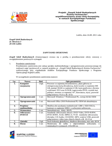 Projekt „Zespół Szkół Budowlanych Kuźnią Fachowców” współfinansowany przez Unię Europejską w ramach Europejskiego Funduszu Społecznego Lublin, dnia 16.08. 2011 roku Zespół Szkół Budowlanych ul. Słowicza 3 20-336 Lublin ZAPYTANIE OFERTOWE Zespół Szkół Budowlanych (Zamawiający) zwraca się z prośbą o przedstawienie oferty cenowej z uwzględnieniem poniższych wymagań: 1. Przedmiot zamówienia: Przedmiotem zamówienia jest zakup sprzętu multimedialnego i oprogramowania przeznaczonego do realizacji zajęć językowych w ramach projektu pt. „Zespół Szkół Budowlanych Kuźnia Fachowców” realizowanego przy współudziale środków Europejskiego Funduszu Społecznego z Programu Operacyjnego Kapitał Ludzki. W szczególności przedmiotem zamówienia stanowi: Lp. 1. Nazwa Komputer stacjonarny Ilość 1 kpl. 2. Oprogramowanie 1 szt. Opis parametrów Procesor co najmniej dwurdzeniowy, płyta główna ze zintegrowaną kartą dźwiękową, dysk twardy co najmniej 500 GB, pamięć RAM co najmniej 4 GB, karta graficzna z dwoma wyjściami: DVI oraz D-SUB, nagrywarka DVD, czytnik kart pamięci, monitor co najmniej 19”, klawiatura, mysz, przewód połączeniowy VGA o dł. 10 m Microsoft Windows 7 Professional PL, wersja 64-bit OEM 3. Oprogramowanie 1 szt. Microsoft Office 2010 Professional PL OEM lub aktualniejsza 4. Projektor multimedialny Wzmacniacz Odtwarzacz DVD/CD 1 szt. Możliwa do uzyskania rozdzielczość 1280 x 1024 SXGA, kontrast co najmniej 5000:1 z uchwytem sufitowym, Stereofoniczny, klasy HI-FI, Standardy odtwarzania obrazu: DVD Video, DVD+R/RW, DVD–R/RW, XviD, MPEG-4, VCD: standardy odtwarzania dźwięku: CD Audio, CD-R/RW, MP3; wejście USB, przewód połączeniowy video typu chinch-chinch o dł. 10-15 m Dwie kolumny głośnikowe, obudowa drewniana, moc min. 60 W Montowany do sufitu z odpowiednimi uchwytami, o minimalnych wymiarach: 210x180 cm 5. 6. 7. 8. Głośniki Ekran 1 szt. 1 szt. 1 kpl. 1 szt. Projekt „Zespół Szkół Budowlanych Kuźnią Fachowców” współfinansowany przez Unię Europejską w ramach Europejskiego Funduszu Społecznego 2. Miejsce i termin realizacji zamówienia: Zamówienie realizowane zostanie najpóźniej w ciągu 14 dni od dnia zawarcia umowy. Wykonawca będzie zobowiązany dostarczyć zamawiane produkty do siedziby Zamawiającego na adres ul. Słowicza 3, Lublin 3. Dokumenty wymagane od Oferenta 1. Formularz oferty wraz ze szczegółową kalkulacją ceny oferty zgodny ze wzorem stanowiącym Załącznik nr 1 do niniejszego Zapytania Ofertowego. 4. Osoba ze strony Zamawiającego uprawniona do kontaktu: Pani Agnieszka Rozwadowska , adres email: [email protected] 5. Ofertę należy przekazać w terminie do dnia: 31.08.2011 r. na formularzu stanowiącym Załącznik nr 1 do niniejszego Zapytania Ofertowego. 6. Ofertę można: a) przesłać e-mailem (skan oferty z podpisami osób upoważnionych do reprezentacji) na adres: [email protected] b) przesłać na adres biura Projektu: Biuro Projektu „Zespół Szkół Budowlanych Kuźnią Fachowców”Zespół Szkół Budowlanych , ul. Słowicza 3, 20-336 Lublin c)przesłać faksem: 81 444 27 00 7. Zleceniodawca zastrzega sobie prawo wyboru produktów, które zostaną zamówione spośród w/w w ofercie 8. Kryteria wyboru oferty najkorzystniejszej 1) Zamawiający dokona wyboru oferty najkorzystniejszej w oparciu o następujące kryteria: - cena poszczególnych produktów wybranych przez Zamawiającego Zamawiający udzieli zamówienia temu wykonawcy, który zaproponuje najniższą cenę. 9. Zamawiający odrzuci ofertę, jeżeli: a) jej treść nie będzie odpowiadać treści zapytania ofertowego, b) zostanie złożona przez wykonawcę wykluczonego z udziału w postępowaniu, c) zostanie złożona po terminie składania ofert, d) będzie zawierać rażąco niską cenę, e) będzie nieważna na podstawie odrębnych przepisów. Projekt „Zespół Szkół Budowlanych Kuźnią Fachowców” współfinansowany przez Unię Europejską w ramach Europejskiego Funduszu Społecznego 9. Załączniki: 1. Wzór oferty 2. Szczegółowa Kalkulacja Ceny Oferty Niniejsze zapytanie ofertowe nie stanowi zobowiązania ZSB do zawarcia umowy. Agnieszka Rozwadowska Koordynator merytoryczny Projekt „Zespół Szkół Budowlanych Kuźnią Fachowców” współfinansowany przez Unię Europejską w ramach Europejskiego Funduszu Społecznego załącznik nr 1 OFERTA Pieczęć firmowa Zespół Szkół Budowlanych ul. Słowicza 3 20-336 Lublin My, niżej podpisani,…………………………………………………………………………………... Działając w imieniu i na rzecz ………………………………………………………………………... ………………………………………………………………………………………………………… w odpowiedzi na przekazane Zapytanie Ofertowe na: zakup sprzętu multimedialnego i oprogramowania przeznaczonego do realizacji zajęć językowych w ramach projektu pt. „Zespół Szkół Budowlanych Kuźnia Fachowców” realizowanego przy współudziale środków Europejskiego Funduszu Społecznego z Programu Operacyjnego Kapitał Ludzki. składamy niniejszą ofertę: Oświadczamy, że zapoznaliśmy się z warunkami Zapytania Ofertowego i nie wnosimy do nich żadnych zastrzeżeń. Szczegółowa kalkulacja ceny oferty stanowi załącznik do niniejszej oferty. Zobowiązujemy się realizować zamówienie w terminach określonych w Zapytaniu Ofertowym. Uważamy się za związanych niniejszą ofertą przez okres 30 dni. Ofertę składamy na ___ ponumerowanych stronach: Załączniki: 1) Szczegółowa Kalkulacja Ceny Oferty 2) ………………………….. …………………….., dn. …………………….. …….…………………….......………… (podpis upoważnionego przedstawiciela) Projekt „Zespół Szkół Budowlanych Kuźnią Fachowców” współfinansowany przez Unię Europejską w ramach Europej