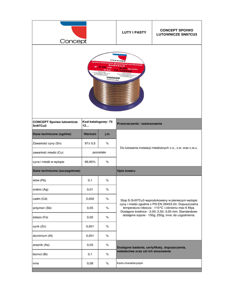 LUTY I PASTY CONCEPT Spoiwo lutownicze Sn97Cu3 Dane techniczne (ogólne) Zawartość cyny (Sn) Kod katalogowy: 75 12… Wartość j.m 97± 0,5 % CONCEPT SPOIWO LUTOWNICZE SN97CU3 Przeznaczenie / zastosowania Do lutowania instalacji miedzianych c.o., z.w. oraz c.w.u. pozostałe zawartość miedzi (Cu) cyna i miedź w wytopie 99,90% % Dane techniczne (szczegółowe) Opis towaru ołów (Pb) 0,1 % srebro (Ag) 0,01 % cadm (Cd) 0,002 % antymon (Sb) 0,05 % żelazo (Fe) 0,02 % cynk (Zn) 0,001 % aluminium (Al) 0,001 % arsenik (As) 0,03 % bizmut (Bi) 0,1 % inne 0,08 % Stop S-Sn97Cu3 wyprodukowany w pierwszym wytopie cyny i miedzi zgodnie z PN EN 29453-24. Dopuszczalna temperatura robocza - 110°C i ciśnieniu max 6 Mpa. Dostępne średnice - 2,00; 2,50; 3,00 mm. Standardowo dostępne szpule - 100g, 250g, inne: do uzgodnienia. Dostępne badania, certyfikaty, dopuszczenia, świadectwa oraz cel ich stosowania Karta charakterystyki