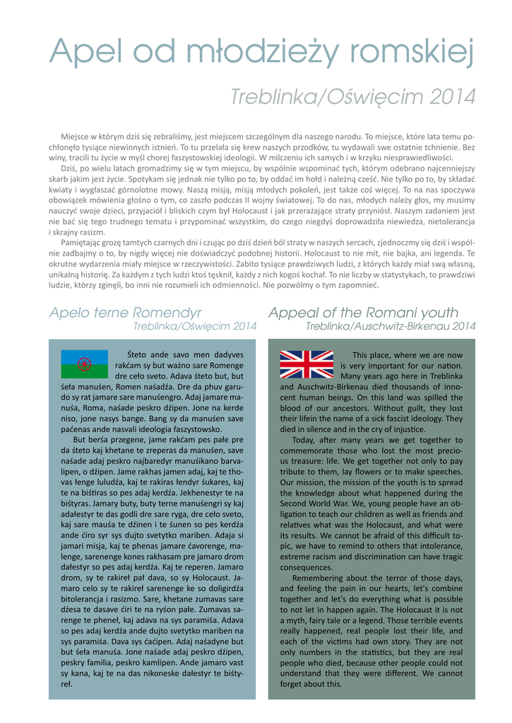 Apel od młodzieży romskiej Treblinka/Oświęcim 2014 Miejsce w którym dziś się zebraliśmy, jest miejscem szczególnym dla naszego narodu. To miejsce, które lata temu pochłonęło tysiące niewinnych istnień. To tu przelała się krew naszych przodków, tu wydawali swe ostatnie tchnienie. Bez winy, tracili tu życie w myśl chorej faszystowskiej ideologii. W milczeniu ich samych i w krzyku niesprawiedliwości. Dziś, po wielu latach gromadzimy się w tym miejscu, by wspólnie wspominać tych, którym odebrano najcenniejszy skarb jakim jest życie. Spotykam się jednak nie tylko po to, by oddać im hołd i należną cześć. Nie tylko po to, by składać kwiaty i wygłaszać górnolotne mowy. Naszą misją, misją młodych pokoleń, jest także coś więcej. To na nas spoczywa obowiązek mówienia głośno o tym, co zaszło podczas II wojny światowej. To do nas, młodych należy głos, my musimy nauczyć swoje dzieci, przyjaciół i bliskich czym był Holocaust i jak przerażające straty przyniósł. Naszym zadaniem jest nie bać się tego trudnego tematu i przypominać wszystkim, do czego niegdyś doprowadziła niewiedza, nietolerancja i skrajny rasizm. Pamiętając grozę tamtych czarnych dni i czując po dziś dzień ból straty w naszych sercach, zjednoczmy się dziś i wspólnie zadbajmy o to, by nigdy więcej nie doświadczyć podobnej historii. Holocaust to nie mit, nie bajka, ani legenda. Te okrutne wydarzenia miały miejsce w rzeczywistości. Zabito tysiące prawdziwych ludzi, z których każdy miał swą własną, unikalną historię. Za każdym z tych ludzi ktoś tęsknił, każdy z nich kogoś kochał. To nie liczby w statystykach, to prawdziwi ludzie, którzy zginęli, bo inni nie rozumieli ich odmienności. Nie pozwólmy o tym zapomnieć. Apelo terne Romendyr Treblinka/Oświęcim 2014 Śteto ande savo men dadyves rakćam sy but ważno sare Romenge dre ceło sveto. Adava śteto but, but śeła manuśen, Romen naśadźa. Dre da phuv garudo sy rat jamare sare manuśengro. Adaj jamare manuśa, Roma, naśade peskro dźipen. Jone na kerde niso, jone nasys bange. Bang sy da manuśen save paćenas ande nasvali ideologia faszystowsko. But berśa przegene, jame rakćam pes pałe pre da śteto kaj khetane te zreperas da manuśen, save naśade adaj peskro najbaredyr manuśikano barvalipen, o dźipen. Jame rakhas jamen adaj, kaj te thovas łenge luludźa, kaj te rakiras łendyr śukares, kaj te na biśtiras so pes adaj kerdźa. Jekhenestyr te na biśtyras. Jamary buty, buty terne manuśengri sy kaj adałestyr te das godli dre sare ryga, dre ceło sveto, kaj sare mauśa te dźinen i te śunen so pes kerdźa ande ćiro syr sys dujto svetytko mariben. Adaja si jamari misja, kaj te phenas jamare ćavorenge, malenge, sarenenge kones rakhasam pre jamaro drom dałestyr so pes adaj kerdźa. Kaj te reperen. Jamaro drom, sy te rakireł pał dava, so sy Holocaust. Jamaro celo sy te rakireł sarenenge ke so doligirdźa bitolerancja i rasizmo. Sare, khetane zumavas sare dźesa te dasave ćiri te na ryśon pałe. Zumavas sarenge te pheneł, kaj adava na sys paramiśa. Adava so pes adaj kerdźa ande dujto svetytko mariben na sys paramiśa. Dava sys ćaćipen. Adaj naśadyne but but śeła manuśa. Jone naśade adaj peskro dźipen, peskry familia, peskro kamlipen. Ande jamaro vast sy kana, kaj te na das nikoneske dałestyr te biśtyreł. Appeal of the Romani youth Treblinka/Auschwitz-Birkenau 2014 This place, where we are now is very important for our nation. Many years ago here in Treblinka and Auschwitz-Birkenau died thousands of innocent human beings. On this land was spilled the blood of our ancestors. Without guilt, they lost their lifein the name of a sick fascist ideology. They died in silence and in the cry of injustice. Today, after many years we get together to commemorate those who lost the most precious treasure: life. We get together not only to pay tribute to them, lay flowers or to make speeches. Our mission, the mission of the youth is to spread the knowledge about what happened during the Second World War. We, young people have an obligation to teach our children as well as friends and relatives what was the Holocaust, and what were its results. We cannot be afraid of this difficult topic, we have to remind to others that intolerance, extreme racism and discrimination can have tragic consequences. Remembering about the terror of those days, and feeling the pain in our hearts, let's combine together and let's do everything what is possible to not let in happen again. The Holocaust it is not a myth, fairy tale or a legend. Those terrible events really happened, real people lost their life, and each of the victims had own story. They are not only numbers in the statistics, but they are real people who died, because other people could not understand that they were different. We cannot forget about this. 11