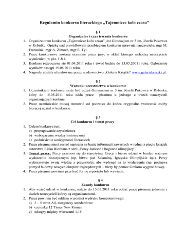 Regulamin konkursu literackiego „Tajemnicze koło czasu” 1. 2. 3. 4. §1 Organizator i czas trwania konkursu Organizatorem konkursu „Tajemnicze koło czasu” jest Gimnazjum nr 3 im. Józefa Pukowca w Rybniku. Opiekę nad prawidłowym przebiegiem konkursu sprawują nauczyciele: mgr M. Franusiak, mgr A. Zimoch, mgr E. Tyl. Prace konkursowe zostaną ocenione przez jury, w skład którego wchodzą nauczyciele wymienieni w pkt. 1 &1. Konkurs rozpoczyna się 01.04.2011 roku i trwać będzie do 15.05.20011 roku. Ogłoszenie wyników nastąpi 15.06.2011 roku. Nagrody zostały ufundowane przez wydawnictwo „Galeria Książki” www.galeriaksiazki.pl. §2 Warunki uczestnictwa w konkursie 1. Uczestnikiem konkursu może być uczeń Gimnazjum nr 3 im. Józefa Pukowca w Rybniku, który do 15.05.2011 roku odda prace pisemna u jednego z trzech nauczycieli organizujących konkurs. 2. Prace uczniowskie muszą stanowić od początku do końca oryginalną twórczość osoby biorącej udział w konkursie. §3 Cel konkursu i temat pracy 1. Celem konkursu jest: a) propagowanie czytelnictwa b) wzbogacenie wiedzy historycznej c) podniesienie umiejętności literackich 2. Praca pisemna musi zostać napisana na bazie informacji zawartych w jednej z pięciu książek autorstwa Ricka Riordana z serii „Percy Jackson i bogowie olimpijscy”. 3. Temat pracy: Percy przenosi się do starożytnej Grecji i bierze udział w bardzo ważnym wydarzeniu historycznym (np. bitwa pod Salaminą, Igrzyska Olimpijskie itp.). Percy wykorzystuje swoją wiedzę z przyszłości, aby wpłynąć na to wydarzenie (np. podsuwa pomysł budowy nowych okrętów trójrzędowych – triery by pomóc Grekom wygrać bitwę). 4. Praca pisemna powinna przybrać formę reportażu lub wywiadu. §4 Zasady konkursu 1. Aby wziąć udział w konkursie, należy do 15.05.2011 roku oddać pracę pisemną jednemu z dwóch nauczycieli którzy są organizatorami. 2. Praca powinna być oddana w postaci wydruku komputerowego: a) 3 – 5 stron A4, marginesy standardowe b) czcionka 12 Times New Roman c) odstępy między wierszami 1,15 3. W konkursie przewidziano następujące nagrody ufundowane przez wydawnictwo Galeria Książki: a) nagroda za zajęcie I miejsca: kompletna seria (5 tomów) „Percy Jackson i bogowie olimpijscy” autorstwa Ricka Riordana b) nagroda za zajęcie II miejsca: książka Rick Riordan „Czerwona Piramida” c) nagroda za zajęcie III miejsca: książka Rick Riordan „Czerwona Piramida” 4. Organizatorzy mają prawo do nieprzyznania którejkolwiek, jak i wszystkich nagród lub innego rozdziału nagród i wyróżnień. 5. Organizator nie recenzuje pisemnie ani ustnie prac, które nie zostały nagrodzone. §5 Postanowienia końcowe 1. Regulamin niniejszego konkursu dostępny jest na stronie internetowej Gimnazjum nr 3 im. Józefa Pukowca w Rybniku www.rybnik.pl/gimnazjum3 . 2. Składając pracę pisemną u organizatora, uczestnik potwierdza, że wyraża zgodę na zasady konkursu zawarte w niniejszym regulaminie. 3. W sytuacjach wyjątkowych organizator zastrzega sobie prawo zmiany niniejszego regulaminu.