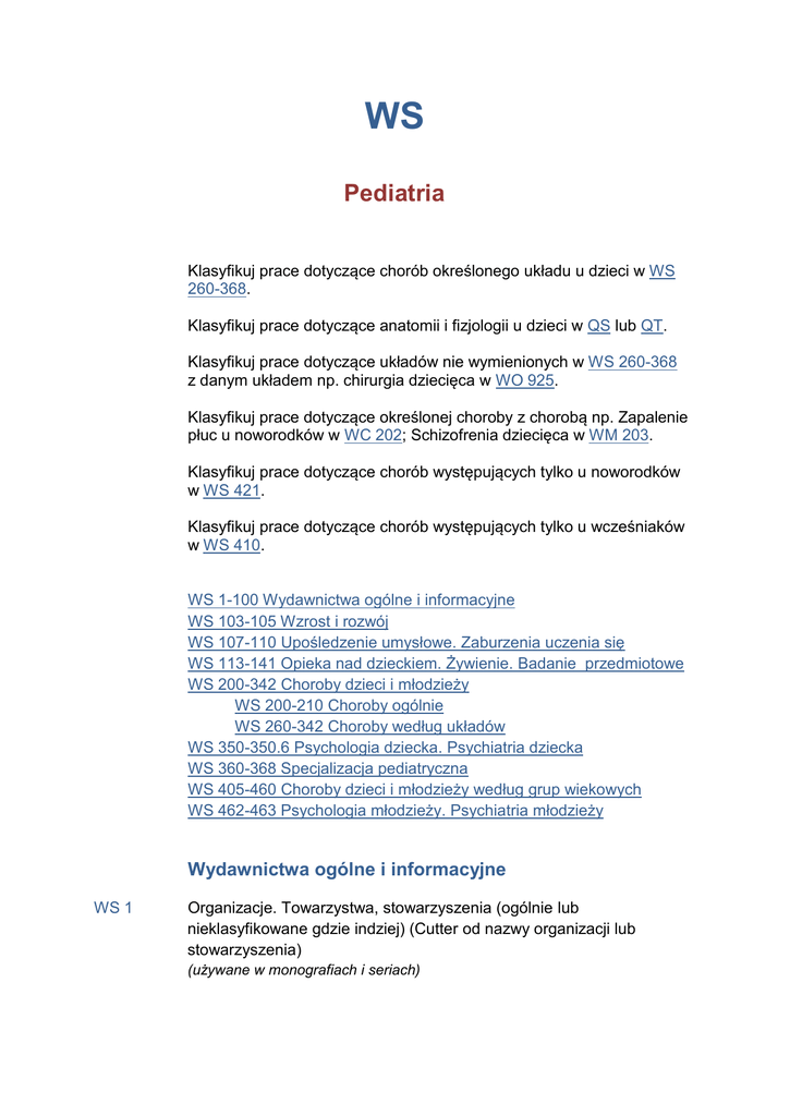 WS Pediatria Klasyfikuj prace dotyczące chorób określonego układu u dzieci w WS 260-368. Klasyfikuj prace dotyczące anatomii i fizjologii u dzieci w QS lub QT. Klasyfikuj prace dotyczące układów nie wymienionych w WS 260-368 z danym układem np. chirurgia dziecięca w WO 925. Klasyfikuj prace dotyczące określonej choroby z chorobą np. Zapalenie płuc u noworodków w WC 202; Schizofrenia dziecięca w WM 203. Klasyfikuj prace dotyczące chorób występujących tylko u noworodków w WS 421. Klasyfikuj prace dotyczące chorób występujących tylko u wcześniaków w WS 410. WS 1-100 Wydawnictwa ogólne i informacyjne WS 103-105 Wzrost i rozwój WS 107-110 Upośledzenie umysłowe. Zaburzenia uczenia się WS 113-141 Opieka nad dzieckiem. Żywienie. Badanie przedmiotowe WS 200-342 Choroby dzieci i młodzieży WS 200-210 Choroby ogólnie WS 260-342 Choroby według układów WS 350-350.6 Psychologia dziecka. Psychiatria dziecka WS 360-368 Specjalizacja pediatryczna WS 405-460 Choroby dzieci i młodzieży według grup wiekowych WS 462-463 Psychologia młodzieży. Psychiatria młodzieży Wydawnictwa ogólne i informacyjne WS 1 Organizacje. Towarzystwa, stowarzyszenia (ogólnie lub nieklasyfikowane gdzie indziej) (Cutter od nazwy organizacji lub stowarzyszenia) (używane w monografiach i seriach) Zawiera listę/wykazy członków towarzystw wydawane w seriach lub osobno/oddzielnie. Klasyfikuj informatory w WS 22. Roczne sprawozdania, raporty itp. w W1. Dla uczelni i instytutów patrz WS 23-24. WS 5 WS 7 Prace zebrane (ogólnie) Wielu autorów Jednego autora WS 9 Wystąpienia. Prezentacje. Eseje. Wykłady (ogólnie) WS 11 WS 11.1 Historia (Tabela G) Zasięg ogólny (nie Tabela G) WS 13 Słowniki. Encyklopedie (używane w monografiach i seriach) WS 15 Klasyfikacja. Terminologia (używane w monografiach i seriach) WS 16 Tabele. Statystyki (używane w monografiach i seriach) Klasyfikuj prace dotyczące rozwoju, wzrostu, wagi i odżywiania. Klasyfikuj tutaj statystyki umieralności dzieci bez podania przyczyny zgonu. Klasyfikuj statystyki umieralności dzieci z podaniem przyczyny zgonu w WA 900. WS 17 Atlasy. Albumy Por. z QZ 17 patomorfologia tkanek WS 18 Edukacja Klasyfikuj tutaj prace dotyczące nauczania (edukacji). WS 18.2 Materiały edukacyjne (używane w monografiach i seriach) Klasyfikuj tutaj materiały edukacyjne takie jak zarysy, streszczenia, pytania i odpowiedzi, testy, materiały do samokształcenia, katalogi, szkolenia, materiały do nauczania wspomaganego komputerowo, itp. niezależnie od formatu. Podręczniki, niezależnie od formatu, klasyfikuj według tematu, którego dotyczą (tematycznie). WS 19 Szkoły, uczelnie: wydziały, katedry i zakłady pediatrii (używane w monografiach i seriach) WS 20 Badania naukowe (ogólnie) Klasyfikuj tutaj prace dotyczące badań naukowych ogólnie. Prace poświęcone badaniom naukowym na dany temat, klasyfikuj według tematu. WS 21 Pediatria jako zawód. Etyka. Recenzje naukowe (analizy badawcze) WS 22 Informatory (Tabela G) (używane w monografiach i seriach) WS 22.1 Zasięg ogólny (nie Tabela G) (używane w monografiach i seriach) Akademie, instytuty Klasyfikuj tutaj również prace na temat organizacji prywatnych i państwowych świadczących pomoc dzieciom niepełnosprawnym, zawierające aspekt medyczny, żywieniowy, higieniczny oraz rehabilitację. Por. z WA 320 w aspekcie zdrowia publicznego. WS 23 WS 23.1 WS 24 Zbiorowo (Tabela G) Zasięg ogólny (nie Tabela G) Poszczególne instytucje (Cutter od nazwy instytucji) (Tabela G) WS 25 Podręczniki laboratoryjne. Techniki i procedury laboratoryjne WS 26 Sprzęt, wyposażenie i materiały (Np. Sztućce dla dzieci spastycznych ) Klasyfikuj katalogi w W 26. WS 26.5 Informatyka. Automatyczne przetwarzanie danych. Komputery (ogólnie) Klasyfikuj prace na temat konkretnych zastosowań według tematów w danej dziedzinie. Szpitale, ambulatoria, (w tym szpitale psychiatryczne dla dzieci) Klasyfikuj tutaj prace na temat szpitali psychiatrycznych tylko dla dzieci. Klasyfikuj prace: Służba zdrowia publiczna psychiatryczna dla dzieci w WM 30. WS 27 WS 27.1 WS 28 Zbiorowo (Tabela G) Zasięg ogólny (nie Tabela G) Poszczególne jednostki (szpitale)(Cutter od nazwy szpitala) (Tabela G) WS 28.5 WS 28.6 Muzea, wystawy Zbiorowo Poszczególne muzea (Cutter od nazwy muzeum) WS 29 WS 29 Hospital staff manuals Podręczniki instruktażowe dla personelu/pracowników szpitala WS 32 Prawo (Tabela G) (używane w monografiach i seriach) Zasięg ogólny (nie Tabela G) WS 32.1 (używane w monografiach i seriach) Komentarze do przepisów prawnych (Tabela G) WS 33 (używane w monografiach i seriach) Zasięg ogólny (nie Tabela G) WS 33.1 (używane w monografiach i seriach) WS 39 Poradniki. Przewodniki (używane w monografiach i seriach) Prace ogólne WS 100 Klasyfikuj tutaj prace dotyczące specjalności i specjalności i choroby razem. Klasyfikuj prace dotyczące tylko choroby w WS 200. Wzrost i rozwój Prawidłowy wzrost i rozwój fizyczny WS 103 Młodzieży patrz WS 460. WS 104 Zaburzenia wzrastania. Zespół opóźnienia rozwoju nieorganiczny WS 105 Prawidłowy wzrost i rozwój psychiczny/umysłowy . Psychologia dziecka Klasyfikuj prace dotyczące aspektu psychofizjologicznego w WL np. Fizjologia snu w WL 108; Lateralizacja w WL 335; lub jeśli dotyczy układu np. Wzrok i spostrzeganie wzrokowe w WW 103-104. WS 105.5 Poszczególne tematy, A-Z WS 105.5.A8 Adaptacja i postawa (wobec śmierci, choroby, rozwodu) WS 105.5.C3 Wychowanie dziecka (aspekty psychologiczne) Klasyfikuj prace ogólne w tym psychologiczne problemy opieki nad dzieckiem w WS 113. WS 105.5.C7 Poznanie. Fantazje. Wyobraźnia WS 105.5.C8 Komunikowanie się. Zachowanie werbalne WS 105.5.D2 Podejmowanie decyzji. Logika. Myślenie. Tworzenie pojęć. Postrzeganie (Psychologiczne) Klasyfikuj prace dotyczące postrzegania neurofizjologicznego i innych rodzajów postrzegania w WL 705 lub z narządem, którego dotyczy. WS 105.5.D3 Pozbawienie (środków do