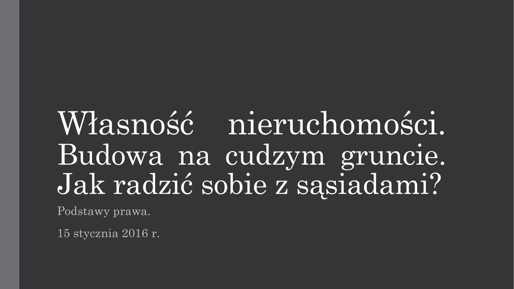 Własność nieruchomości. Budowa na cudzym gruncie. Jak radzić sobie z sąsiadami? Podstawy prawa. 15 stycznia 2016 r. Syn Agnieszki i Roberta – 15-letni Marek uczy się gry na pianinie. Trzy razy w tygodniu po dwie godziny w porze wczesnopopołudniowej ćwiczy etiudy i sonaty, dwa razy – mazurki i walce. Cała rodzina mieszka w bloku. Jedna z najbliższych sąsiadek – Mariola, twierdzi, że hałas, który słyszy w swoim mieszkaniu jest nie do zniesienia, skarży się że nieudolna gra szarpie jej nerwy. Pozostałym sąsiadom gra na pianinie zupełnie nie przeszkadza. Mieszkający w tym samym bloku pan Henryk ma specyficzne hobby – w wolnych chwilach zajmuje się wypychaniem zwierząt. Znosi do mieszkania martwe ptaki, lisy, a jak ma szczęście – także sarny. Zwierzęta poddaje specyficznej obróbce, co powoduje fetor n dwóch piętrach. Od czasu kiedy Henryk przeszedł na emeryturę poświęca się swojemu hobby codziennie. Na uwagi sąsiadów reaguje wzruszeniem ramion. Janusz i Grażyna mieszkają w domu jednorodzinnym w dzielnicy willowej. Cała rodzina bardzo lubi grillować. Jak tylko zaczynają się cieplejsze dni to kilka razy w tygodniu rozpalają grilla, co jednak nie podoba się ich bezpośredniej sąsiadce Wandzie, której przeszkadza zapach i dym. Po którejś z rzędu nieprzyjemnej wymianie zdań Wanda zagroziła, że poda Janusza i Grażynę do sądu. Wacław P. i Władysław K. byli sąsiadami. Ulubioną rozrywką Wacława P. jest oglądanie telewizji. Niestety na skutek dobudowania przez Władysława K. kolejnego piętra jego domu odbiór sygnału telewizyjnego u Wacława P. znacznie się pogorszył. Czy w związku z tym przysługuje mu jakieś roszczenie względem Władysława K. czy też powinien kupić satelitę? • W wypadku uniemożliwienia lub utrudnienia odbioru programu telewizyjnego - osobie narażonej na tego rodzaju zakłócenia przysługuje roszczenie o przywrócenie stanu zgodnego z prawem (art. 222 § 2 k.c.). • Stosownie do okoliczności, przywrócenie do stanu poprzedniego może wyrażać się w nakazaniu osobie zakłócającej podłączenie na jej koszt urządzeń telewizyjnych do instalacji znajdującej się na nieruchomości, skąd pochodzą zakłócenia, aby umożliwić odbiór programu. Marlena M. mieszka w domku jednorodzinnym z niewielkim ogródkiem. Jej sąsiad – Stanisław S. posadził przed laty cały szereg drzew wzdłuż granicy nieruchomości. Obecnie drzewa są tak wysokie, że zasłaniają słońce, ich korzenie są bardzo rozrośnięte, co w efekcie uniemożliwia pani Marchlewskiej uprawianie przygranicznego pasa ziemi o szerokości pięciu metrów. Czy Marlena M. może zmusić Stanisława S. do usunięcia drze, które znajdują się przecież na jego działce? Zenona Z. bardzo denerwowały gałęzie zawieszające się z jabłoni sąsiada nad jego nieruchomości. We wrześniu, gdy drzewo było pełne owoców obciął gałęzie przechodzące na jego teren, owoce skonsumował, a drewno spalił w kominku. Sąsiad jest tym oburzony i domaga się zapłaty za poniesioną szkodę. Czy sytuacja wyglądała by inaczej, gdyby Zenon Z. zamian gałęzi i owoców obciął korzenie drzewa przechodzące z sąsiedniej nieruchomości? Anna Z. i Joanna P. były właścicielka sąsiadujących ze sobą nieruchomości gruntowych. Anna Z. rozpoczęła budowę przybudówki, jednak przy wylewaniu fundamentów przekroczyła o 20 cm granicę, wykorzystując pod budowę części nieruchomości sąsiada. Joanna P. jak tylko to zauważyła, wyraziła jednoznacznie swój sprzeciw i nakazała Annie Z. zmianę sposobu budowy, po czym wyjechała na urlop. Po powrocie stwierdziła jednak, że ukończona przybudówka stoi częściowo na jej terenie. Czy w związku z tym Joanna P. musi rozebrać swój budynek? Dariusz P., kopiąc w ogródku, znalazł skrzynię pełną kosztowności. Oprócz biżuterii i monet w skrzyni znajdowały się również dokumenty: 1) wskazujące, że właścicielem skrzyni, że Baruch Goldstein, urodzony w 1870 r.? 2) wskazujące, że właścicielem skrzyni był Feliks P. – dziadek Dariusza P.? Trzej bracia: Adam B., Bolesław B. i Czesław B. odziedziczyli po ojcu samochód. Po miesiącu jeden z braci – Czesław B. – jako, że lubił pozostałych dwóch postanowił sprzedać swój udział w samochodzie mieszkającemu w sąsiedztwie małżeństwu z siedmiorgiem dzieci. Pozostali bracia gorąco protestowali przeciwko jego planom. Czy ich sprzeciw ma jakieś znaczenie? Czy sprzedaż udziału jest dozwolona? Przemysław B. i Daria S. odziedziczyli po zmarłym pradziadku w częściach równych prawo własności dwupokojowego mieszkania, 200-metrowego domu, 3-hektarowej działki oraz dwuletniej krowy. Od wielu lat pozostawali jednak ze sobą w konflikcie, wspólne zamieszkiwanie było więc niemożliwe. Żadne z nich nie życzy sobie, aby mieć cokolwiek wspólnego z drugim. Co w takim razie mogą zrobić współwłaściciele? Dom przy ul. Przy Rondzie w Krakowie należy do dwóch sióstr – Zofii i Marii P., których udziały we współwłasności wynoszą po ½. Siostry umówiły się między sobą, że jedna będzie mieszkać na parterze, a druga na piętrze. Po 3 latach bezkonfliktowego zamieszkiwania okazało się jednak, że dach wymaga natychmiastowego remontu. Zofia P., mieszkająca na parterze zdecydowanie odmówiła jednak partycypacji w kosztach, twierdząc, że kwestia dachu jej nie dotyczy. Czy ma rację? A co gdyby chodziło o konieczność pilnego remontu mieszkania znajdującego się na piętrze? Na skutek tego konfliktu Maria P. postanowiła sprzedać swój udział w nieruchomości Ryszardowi Sz. Ten po zakupie postanowił, że bardziej odpowiada mu jednak mieszkanie na parterze, więc wprowadził się do Zofii P., której jednak niezbyt się to spodobało. Czy Ryszard Sz. miał prawo prowadzić się do Zofii? 10 maja 2005 r. Jerzy K. nabył od Czesława C. nieruchomość położoną w Wieliczce. Zaraz po sfin
