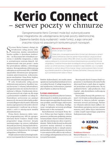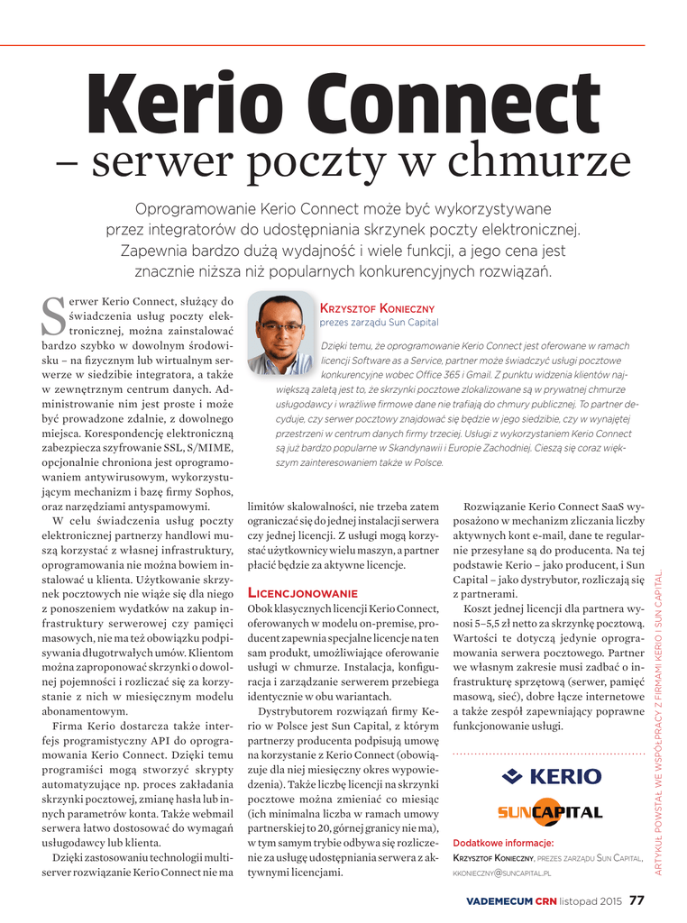 Kerio Connect – serwer poczty w chmurze Oprogramowanie Kerio Connect może być wykorzystywane przez integratorów do udostępniania skrzynek poczty elektronicznej. Zapewnia bardzo dużą wydajność i wiele funkcji, a jego cena jest znacznie niższa niż popularnych konkurencyjnych rozwiązań. Krzysztof Konieczny prezes zarządu Sun Capital Dzięki temu, że oprogramowanie Kerio Connect jest oferowane w ramach licencji Software as a Service, partner może świadczyć usługi pocztowe konkurencyjne wobec Office 365 i Gmail. Z punktu widzenia klientów największą zaletą jest to, że skrzynki pocztowe zlokalizowane są w prywatnej chmurze usługodawcy i wrażliwe firmowe dane nie trafiają do chmury publicznej. To partner decyduje, czy serwer pocztowy znajdować się będzie w jego siedzibie, czy w wynajętej przestrzeni w centrum danych firmy trzeciej. Usługi z wykorzystaniem Kerio Connect są już bardzo popularne w Skandynawii i Europie Zachodniej. Cieszą się coraz większym zainteresowaniem także w Polsce. limitów skalowalności, nie trzeba zatem ograniczać się do jednej instalacji serwera czy jednej licencji. Z usługi mogą korzystać użytkownicy wielu maszyn, a partner płacić będzie za aktywne licencje. Licencjonowanie Obok klasycznych licencji Kerio Connect, oferowanych w modelu on-premise, producent zapewnia specjalne licencje na ten sam produkt, umożliwiające oferowanie usługi w chmurze. Instalacja, konfiguracja i zarządzanie serwerem przebiega identycznie w obu wariantach. Dystrybutorem rozwiązań firmy Kerio w Polsce jest Sun Capital, z którym partnerzy producenta podpisują umowę na korzystanie z Kerio Connect (obowiązuje dla niej miesięczny okres wypowiedzenia). Także liczbę licencji na skrzynki pocztowe można zmieniać co miesiąc (ich minimalna liczba w ramach umowy partnerskiej to 20, górnej granicy nie ma), w tym samym trybie odbywa się rozliczenie za usługę udostępniania serwera z aktywnymi licencjami. Rozwiązanie Kerio Connect SaaS wyposażono w mechanizm zliczania liczby aktywnych kont e-mail, dane te regularnie przesyłane są do producenta. Na tej podstawie Kerio – jako producent, i Sun Capital – jako dystrybutor, rozliczają się z partnerami. Koszt jednej licencji dla partnera wynosi 5–5,5 zł netto za skrzynkę pocztową. Wartości te dotyczą jedynie oprogramowania serwera pocztowego. Partner we własnym zakresie musi zadbać o infrastrukturę sprzętową (serwer, pamięć masową, sieć), dobre łącze internetowe a także zespół zapewniający poprawne funkcjonowanie usługi. Dodatkowe informacje: Krzysztof Konieczny, prezes zarządu Sun Capital, [email protected] VADEMECUM CRN listopad 2015 77 ARTYKUŁ POWSTAŁ WE WSPÓŁPRACY Z FIRMAMI KERIO I SUN CAPITAL. S erwer Kerio Connect, służący do świadczenia usług poczty elektronicznej, można zainstalować bardzo szybko w dowolnym środowisku – na fizycznym lub wirtualnym serwerze w siedzibie integratora, a także w zewnętrznym centrum danych. Administrowanie nim jest proste i może być prowadzone zdalnie, z dowolnego miejsca. Korespondencję elektroniczną zabezpiecza szyfrowanie SSL, S/MIME, opcjonalnie chroniona jest oprogramowaniem antywirusowym, wykorzystującym mechanizm i bazę firmy Sophos, oraz narzędziami antyspamowymi. W celu świadczenia usług poczty elektronicznej partnerzy handlowi muszą korzystać z własnej infrastruktury, oprogramowania nie można bowiem instalować u klienta. Użytkowanie skrzynek pocztowych nie wiąże się dla niego z ponoszeniem wydatków na zakup infrastruktury serwerowej czy pamięci masowych, nie ma też obowiązku podpisywania długotrwałych umów. Klientom można zaproponować skrzynki o dowolnej pojemności i rozliczać się za korzystanie z nich w miesięcznym modelu abonamentowym. Firma Kerio dostarcza także interfejs programistyczny API do oprogramowania Kerio Connect. Dzięki temu programiści mogą stworzyć skrypty automatyzujące np. proces zakładania skrzynki pocztowej, zmianę hasła lub innych parametrów konta. Także webmail serwera łatwo dostosować do wymagań usługodawcy lub klienta. Dzięki zastosowaniu technologii multiserver rozwiązanie Kerio Connect nie ma
