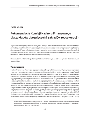 Rekomendacje KNF dla zakładów ubezpieczeń i zakładów reasekuracji Paweł Wajda Rekomendacje Komisji Nadzoru Finansowego dla zakładów ubezpieczeń i zakładów reasekuracji1 Artykuł jest poświęcony analizie relatywnie nowego instrumentu sprawowania nadzoru nad rynkiem ubezpieczeń i rynkiem reasekuracji, jakim są rekomendacje wydawane przez Komisję Nadzoru Finansowego. W szczególności przedmiotem rozważań jest umiejscowienie wskazanych rekomendacji w ramach systemu prawa, jak również ocena wpływu rekomendacji na prawidłowe i bezpieczne funkcjonowanie zakładów ubezpieczeń i zakładów reasekuracji. Słowa kluczowe: rekomendacja, Komisja Nadzoru Finansowego, nadzór nad rynkiem ubezpieczeń, akt typu soft law. Wprowadzenie System finansowy i stanowiące jego element składowy rynki finansowe, w tym rynek ubezpieczeń, mogą być z powodzeniem przyrównane do swoistego krwioobiegu systemu gospodarczego. Tak jak system naczyń krwionośnych dostarcza niezbędne składniki odżywcze do wszystkich komórek organizmu, tak system finansowy pozwala na transfer kapitału od podmiotów i jednostek, które dysponują jego nadwyżkami i są zainteresowane ich pomnożeniem, do tych podmiotów i jednostek, które poszukują kapitału i są skłonne zapłacić za jego pozyskanie. W konsekwencji powyższego system finansowy należy do tych części systemu finansowego, które budzą szczególne zainteresowanie wszystkich uczestników obrotu – tak w sferze finansowej, jak i w sferze realnej systemu gospodarczego – i jednocześnie wymagają specyficznej regulacji. Do kategorii notorii powszechnych należy przy tym stanowisko iż system finansowy jest tą częścią systemu gospodarczego, której regulacja jest zdecydowanie najtrudniejsza. System finansowy potrzebuje bowiem regulacji wyważonej, idealnie dopasowanej do okoliczności i jego specyfiki – regulacji niejako szytej na miarę. Regulacja ta musi pozwalać na wyznaczenie najlepszego kompromisu pomiędzy zyskiem, a ryzykiem, tak by z jednej 1. Tekst stanowi zmodyfikowaną wersję artykułu: S. Pabian, P. Wajda, Natura prawna i skutki rekomendacji Komisji Nadzoru Finansowego kierowanych do zakładów ubezpieczeń i zakładów reasekuracji, „Wiadomości Ubezpieczeniowe” 2015, nr 1, s. 109–120. – 119 – Wiadomości Ubezpieczeniowe 3/2016 strony uniknąć sytuacji, w której zbyt dużo swobody w obrębie rynku skutkować będzie upadłością uczestników obrotu w rezultacie podejmowania zbyt dużego ryzyka i efektem zarażenia, tj. przenoszeniem się problemów jednego uczestnika na innych, natomiast z drugiej strony uniknąć sytuacji, w której w obliczu nadmiaru regulacji niemożliwym będzie prowadzenie rentownej działalności. Dobrą regulacją rynku finansowego będzie zatem taka, która pozwoli na wyznaczenie najlepszego kompromisu pomiędzy zyskiem a ryzykiem, tak by zbytnio nie krępować możliwości wypracowania tego pierwszego i by nie pozwolić na podejmowanie zbyt ryzykownych działań. Poddając analizie przepisy ustawy z dnia 11 września 2015 r. o działalności ubezpieczeniowej i reasekuracyjnej2 (dalej także jako: u.dz.u.r.), z punktu widzenia spełnienia przez nią powyższego wymogu formułowanego w odniesieniu do dobrych regulacji, należy wskazać, że u.dz.u.r. ma z pewnością pewne braki. Do najbardziej widocznych należy fakt, że jej przepisy uniemożliwiają krajowym zakładom ubezpieczeń pozyskiwanie kapitału, który z punktu widzenia adekwatności kapitałowej kwalifikowany byłby jako kapitał Tier 1 Hybrid (na marginesie rozważań celowe jest wskazanie, że wprawdzie krajowe zakłady ubezpieczeń mogą pokusić się o pozyskanie takiego kapitału, niemniej odbędzie się to w sposób, który może spotkać się z opozycją ze strony Komisji Nadzoru Finansowego). Do grupy czynników, które czynią uprawnionym przyjęcie stanowiska, iż u.dz.u.r. nie jest dobrą regulacją rynku ubezpieczeń, należy także wyposażenie Komisji Nadzoru Finansowego (dalej także jako: Komisja) w instrument regulacji rynku ubezpieczeń w postaci rekomendacji. W powyższym kontekście należy zastrzec, iż na negatywną ocenę zasługuje nie sam instrument regulacji, jakim jest rekomendacja, ale sposób, w jaki instrument ten został wprowadzony do katalogu kompetencji Komisji 1. Rekomendacje unijne a krajowe Komisja na mocy art. 365 ust. 1 u.dz.u.r. została wyposażona w uprawnienie do wydawania rekomendacji skierowanych do zakładów ubezpieczeń i zakładów reasekuracji w dwojakim zakresie. Po pierwsze, w zakresie niezbędnym do realizacji wytycznych i zaleceń Europejskiego Urzędu Nadzoru Ubezpieczeń i Pracowniczych Programów Emerytalnych (EIOPA) wydawanych na podstawie art. 16 rozporządzenia Parlamentu Europejskiego i Rady (UE) na 1094/2010 z dnia 24 listopada 2010 r. w sprawie ustanowienia Europejskiego Urzędu Nadzoru (Europejskiego Urzędu Nadzoru Ubezpieczeń i Pracowniczych Programów Emerytalnych), zmiany decyzji nr 716/2009/WE i uchylenia decyzji Komisji 2009/79/ WE (tzw. rekomendacje unijne). Po drugie, w celu zapewnienia zgodności działalności zakładów ubezpieczeń i zakładów reasekuracji z przepisami prawa; zapobieżenia naruszenia interesów ubezpieczających, ubezpieczonych, uposażonych lub uprawnionych z umów ubezpieczenia; ograniczenia ryzyka występującego w działalności zakładu ubezpieczeń lub zakładu reasekuracji; zapewnienia trwałej zdolności zakładu ubezpieczeń do wykonywania zobowiązań (tzw. rekomendacje krajowe). Z powyższych rekomendacji wyłącznie rekomendacje, o których jest mowa w art. 365 ust. 1 pkt 1 u.dz.u.r. (tj. rekomendacje unijne), stanowią implementację postanowień Dyrektywy 2009/138/ WE Parlamentu Europejskiego i Rady z dnia 25 listopada 2009 r. w sprawie podejmowania i prowadzenia działalności ubezpieczeniowej i reasekuracyjnej – Wypłacalność II (Solvency II)3. Natomiast rekomendacje, z art. 365 ust. 1 pkt 2 u.dz.u.r. (tj