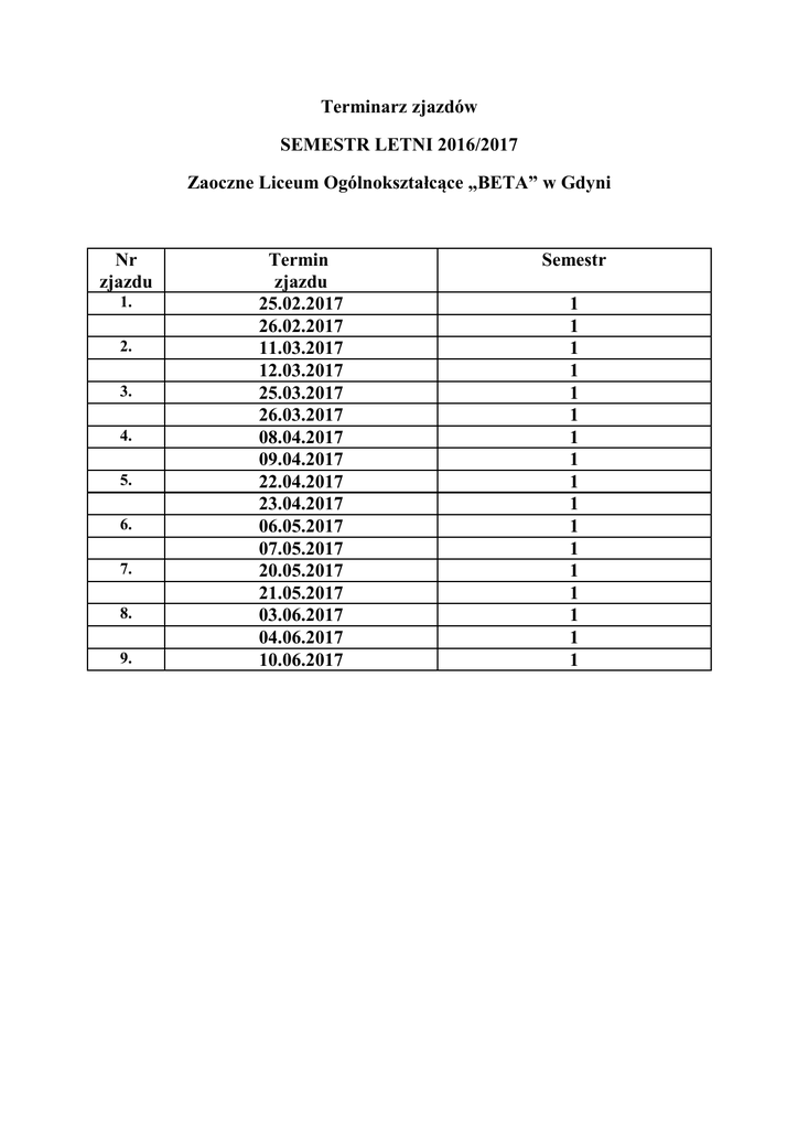 Terminarz zjazdów SEMESTR LETNI 2016/2017 Zaoczne Liceum Ogólnokształcące „BETA” w Gdyni Nr zjazdu 1. 2. 3. 4. 5. 6. 7. 8. 9. Termin zjazdu 25.02.2017 26.02.2017 11.03.2017 12.03.2017 25.03.2017 26.03.2017 08.04.2017 09.04.2017 22.04.2017 23.04.2017 06.05.2017 07.05.2017 20.05.2017 21.05.2017 03.06.2017 04.06.2017 10.06.2017 Semestr 1 1 1 1 1 1 1 1 1 1 1 1 1 1 1 1 1