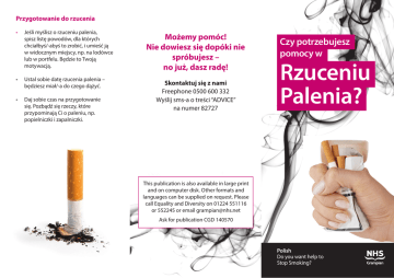 Przygotowanie do rzucenia • Jeśli myślisz o rzuceniu palenia, spisz listę powodów, dla których chciałbyś/-abyś to zrobić, i umieść ją w widocznym miejscy, np. na lodówce lub w portfelu. Będzie to Twoją motywacją. • Ustal sobie datę rzucenia palenia – będziesz miał/-a do czego dążyć. • Daj sobie czas na przygotowanie się. Pozbądź się rzeczy, które przypominają Ci o paleniu, np. popielniczki i zapalniczki. Możemy pomóc! Nie dowiesz się dopóki nie spróbujesz – no już, dasz radę! Skontaktuj się z nami Freephone 0500 600 332 Wyślij sms-a o treści “ADVICE” na numer 82727 Czy potrzebujesz pomocy w Rzuceniu Palenia? This publication is also available in large print and on computer disk. Other formats and languages can be supplied on request. Please call Equality and Diversity on 01224 551116 or 552245 or email [email protected] Ask for publication CGD 140570 Polish Do you want help to Stop Smoking? Dlaczego powinienem/powinnam przyjść do Smoking Advice Service (poradni ds. rzucania palenia)? • Rozumiemy, że rzucenie palenia może być trudne • Wiemy, że każdy ma inne powody, dla których pali oraz chce rzucić palenie • Nie będziemy zrzędzić ani prawić kazań • Z właściwym produktem i wsparciem masz 4-krotnie większe szanse na rzucenie palenia • Otrzymasz darmową Nicotine Replacement Therapy (NRT) na receptę. Może ona zwiększyć Twoje szanse na pomyślne rzucenie palenia i jest również dostępna dla osób poniżej lat 18 • Wsparcie lokalne jest dostępne w wielu miejscach na terenie Grampian • Wszelkie usługi są darmowe i poufne • Jeśli palisz tytoń lub e-papierosy, możemy pomóc Ci je rzucić W jaki sposób Smoking Advice Service mi pomoże? Co dalej? • • Grupy wsparcia Sesje mają miejsce raz w tygodniu przez 6 tygodni, z możliwością uczęszczania przez następne 6 tygodni w razie potrzeby. Każda sesja trwa 45 minut. Atmosfera na spotkaniach jest przyjacielska i nieformalna; znajdziesz tam wsparcie wraz z innymi palaczami. Krok 1: Jeśli zdecydujesz, że chciałbyś/-ałabyś otrzymać pomoc w rzuceniu palenia, zadzwoń pod ten darmowy numer: 0500 600 332. Przedyskutujemy dostępne opcje i usługi, które będą najbardziej Ci odpowiadać. • Krok 2: Zarezerwujemy Ci miejsce w wybranym przez Ciebie rodzaju wsparcia; otrzymasz też list pocztą ze szczegółami spotkania. • • Wsparcie indywidualne Możesz zobaczyć się z doradcą do spraw rzucania palenia w cztery oczy. Krok 3: Rozpoczyna się proces wsparcia w rzuceniu palenia. • Krok 4: Przez cały ten czas będziemy Ci oferować wsparcie i otuchę oraz odpowiemy na każde Twoje pytanie • Krok 5: Jeśli pod koniec sesji będziesz chciał/-a otrzymać dalszą pomoc, z chęcią Ci jej udzielimy. • Oferujemy do 12 tygodni wsparcia dostosowanego do Twoich potrzeb. • Wsparcie telefoniczne Otrzymasz wsparcie od doradcy przez telefon, jeżeli nie jesteś w stanie stawić się osobiście. • Wsparcie z apteki Możesz udać się do swojej lokalnej apteki bez wcześniej umówionej wizyty i otrzymać do 12 tygodni wsparcia. Skontaktujemy się z Tobą tylko wtedy, gdy udzielisz nam na to pozwolenia.