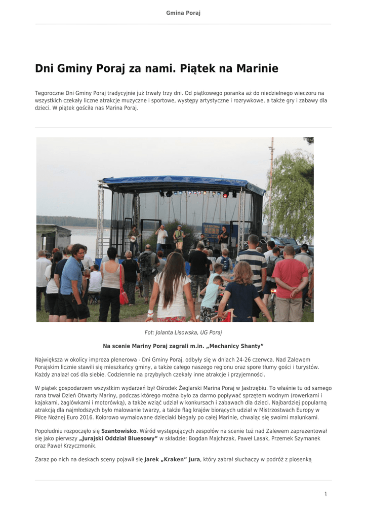 Gmina Poraj Dni Gminy Poraj za nami. Piątek na Marinie Tegoroczne Dni Gminy Poraj tradycyjnie już trwały trzy dni. Od piątkowego poranka aż do niedzielnego wieczoru na wszystkich czekały liczne atrakcje muzyczne i sportowe, występy artystyczne i rozrywkowe, a także gry i zabawy dla dzieci. W piątek gościła nas Marina Poraj. Fot: Jolanta Lisowska, UG Poraj Na scenie Mariny Poraj zagrali m.in. „Mechanicy Shanty” Największa w okolicy impreza plenerowa - Dni Gminy Poraj, odbyły się w dniach 24-26 czerwca. Nad Zalewem Porajskim licznie stawili się mieszkańcy gminy, a także całego naszego regionu oraz spore tłumy gości i turystów. Każdy znalazł coś dla siebie. Codziennie na przybyłych czekały inne atrakcje i przyjemności. W piątek gospodarzem wszystkim wydarzeń był Ośrodek Żeglarski Marina Poraj w Jastrzębiu. To właśnie tu od samego rana trwał Dzień Otwarty Mariny, podczas którego można było za darmo popływać sprzętem wodnym (rowerkami i kajakami, żaglówkami i motorówką), a także wziąć udział w konkursach i zabawach dla dzieci. Najbardziej popularną atrakcją dla najmłodszych było malowanie twarzy, a także flag krajów biorących udział w Mistrzostwach Europy w Piłce Nożnej Euro 2016. Kolorowo wymalowane dzieciaki biegały po całej Marinie, chwaląc się swoimi malunkami. Popołudniu rozpoczęło się Szantowisko. Wśród występujących zespołów na scenie tuż nad Zalewem zaprezentował się jako pierwszy „Jurajski Oddział Bluesowy” w składzie: Bogdan Majchrzak, Paweł Lasak, Przemek Szymanek oraz Paweł Krzyczmonik. Zaraz po nich na deskach sceny pojawił się Jarek „Kraken” Jura, który zabrał słuchaczy w podróż z piosenką 1 Gmina Poraj żeglarską. Gwiazdą wieczoru był zespół „Mechanicy Shanty”, który wspaniale wykonał szanty oraz piosenki żeglarskie, zarówno polskie, jak i z pogranicza folku irlandzkiego, bluegrass, a nawet country. Mechanicy wystąpili w składzie: Andrzej Bernat, Henryk Czekała „Szkot”, Michał Karczewski, Jacek Ledworowski, Maciej Łuczak oraz Piotr Ruszkowski. Wieczór widowiskowo zakończył sekstet wokalny „Banana Boat”, który bez żadnego instrumentu, z łatwością porwał publiczność autorskimi interpretacjami klasycznych szant, oryginalnymi wykonaniami piosenek żeglarskich oraz neo-szantami. Panowie przyjechali ze Śląska w pełnym składzie, tj.: Tomasz Czarny, Maciej Jędrzejko, Paweł Jędrzejko, Paweł Konieczny, Michał Maniara, Piotr Wiśniewski. Po zakończonym występie wszyscy wykonawcy otrzymywali statuetki Przyjaciela Gminy Poraj. Ponadto Jarek „Kraken” Jura otrzymał z rąk wójta Łukasza Stachery oraz przewodniczącej Rady Gminy Katarzyny Kaźmierczak specjalne podziękowania oraz pamiątkową statuetkę za wkład w rozwój i rozpowszechnianie kultury żeglarskiej na terenie Gminy Poraj. 2