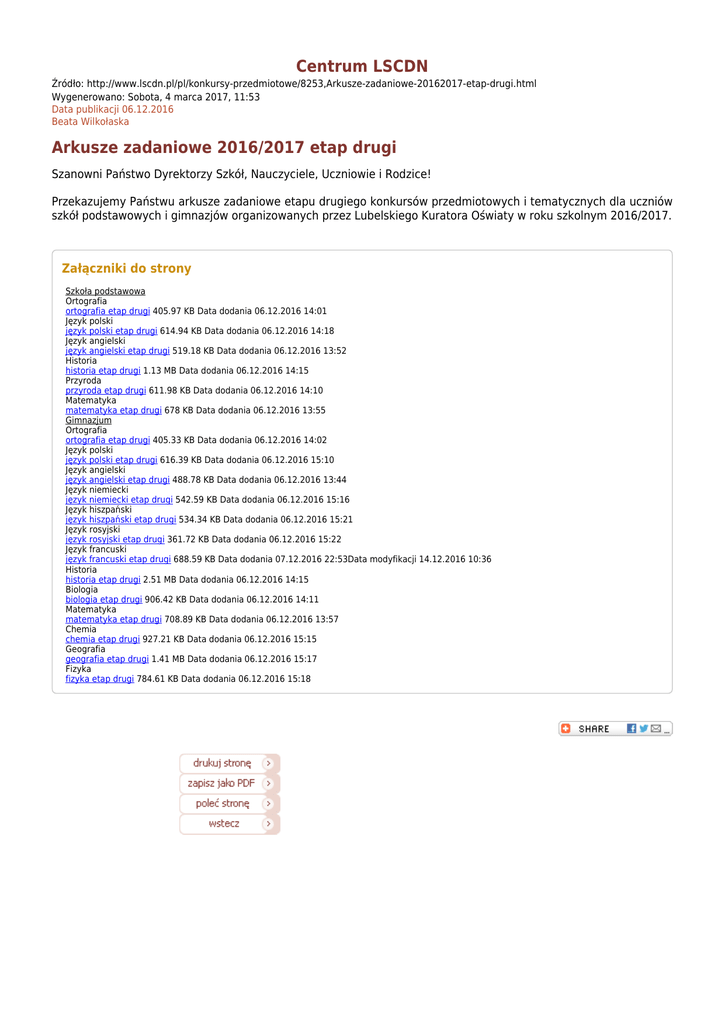Centrum LSCDN Źródło: http://www.lscdn.pl/pl/konkursy-przedmiotowe/8253,Arkusze-zadaniowe-20162017-etap-drugi.html Wygenerowano: Sobota, 4 marca 2017, 11:53 Data publikacji 06.12.2016 Beata Wilkołaska Arkusze zadaniowe 2016/2017 etap drugi Szanowni Państwo Dyrektorzy Szkół, Nauczyciele, Uczniowie i Rodzice! Przekazujemy Państwu arkusze zadaniowe etapu drugiego konkursów przedmiotowych i tematycznych dla uczniów szkół podstawowych i gimnazjów organizowanych przez Lubelskiego Kuratora Oświaty w roku szkolnym 2016/2017. Załączniki do strony Szkoła podstawowa Ortografia ortografia etap drugi 405.97 KB Data dodania 06.12.2016 14:01 Język polski język polski etap drugi 614.94 KB Data dodania 06.12.2016 14:18 Język angielski język angielski etap drugi 519.18 KB Data dodania 06.12.2016 13:52 Historia historia etap drugi 1.13 MB Data dodania 06.12.2016 14:15 Przyroda przyroda etap drugi 611.98 KB Data dodania 06.12.2016 14:10 Matematyka matematyka etap drugi 678 KB Data dodania 06.12.2016 13:55 Gimnazjum Ortografia ortografia etap drugi 405.33 KB Data dodania 06.12.2016 14:02 Język polski język polski etap drugi 616.39 KB Data dodania 06.12.2016 15:10 Język angielski język angielski etap drugi 488.78 KB Data dodania 06.12.2016 13:44 Język niemiecki język niemiecki etap drugi 542.59 KB Data dodania 06.12.2016 15:16 Język hiszpański język hiszpański etap drugi 534.34 KB Data dodania 06.12.2016 15:21 Język rosyjski język rosyjski etap drugi 361.72 KB Data dodania 06.12.2016 15:22 Język francuski język francuski etap drugi 688.59 KB Data dodania 07.12.2016 22:53Data modyfikacji 14.12.2016 10:36 Historia historia etap drugi 2.51 MB Data dodania 06.12.2016 14:15 Biologia biologia etap drugi 906.42 KB Data dodania 06.12.2016 14:11 Matematyka matematyka etap drugi 708.89 KB Data dodania 06.12.2016 13:57 Chemia chemia etap drugi 927.21 KB Data dodania 06.12.2016 15:15 Geografia geografia etap drugi 1.41 MB Data dodania 06.12.2016 15:17 Fizyka fizyka etap drugi 784.61 KB Data dodania 06.12.2016 15:18