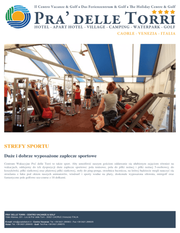 STREFY SPORTU Duże i dobrze wyposażone zaplecze sportowe Centrum Wakacyjne Pra’ delle Torri to także sport. Aby umożliwić naszym gościom oddawanie się ulubionym zajęciom również na wakacjach, oddajemy do ich dyspozycji duże zaplecze sportowe: pola tenisowe, pola do piłki nożnej i piłki nożnej 5-osobowej, do koszykówki, piłki siatkowej oraz plażowej piłki siatkowej, stoły do ping-ponga, strzelnica łucznicza, na której będziecie mogli nauczyć się strzelania z łuku pod okiem naszych animatorów, windsurf i sporty wodne na plaży, doskonale wyposażona siłownia, minigolf oraz fantastyczne pole golfowe sea-course z 18 dołkami. PRA' DELLE TORRI - CENTRO VACANZE & GOLF Viale Altanea, 201 - Loc.tà Pra' delle Torri - 30021 CAORLE (Venezia) ITALIA E-mail: [email protected] - Centro Vacanze: Tel. +39 0421.299063 - Fax +39 0421.299035 Hotel: Tel. +39 0421.299445 - Golf: Tel./Fax +39 0421.299570 Powered by TCPDF (www.tcpdf.org)