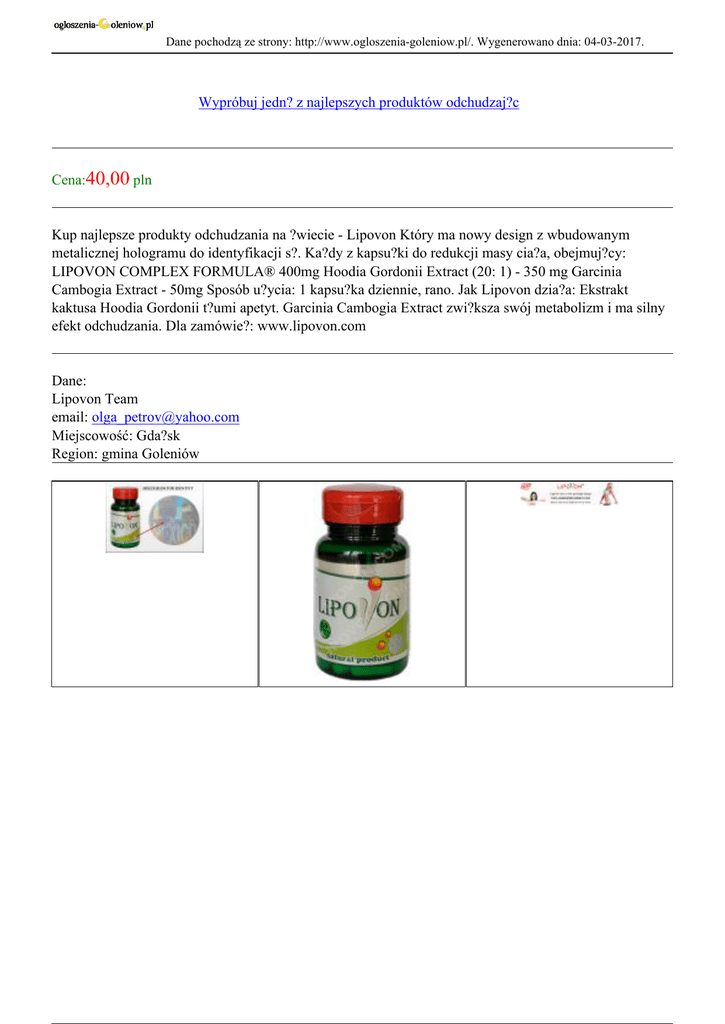 Dane pochodzą ze strony: http://www.ogloszenia-goleniow.pl/. Wygenerowano dnia: 04-03-2017. Wypróbuj jedn? z najlepszych produktów odchudzaj?c Cena:40,00 pln Kup najlepsze produkty odchudzania na ?wiecie - Lipovon Który ma nowy design z wbudowanym metalicznej hologramu do identyfikacji s?. Ka?dy z kapsu?ki do redukcji masy cia?a, obejmuj?cy: LIPOVON COMPLEX FORMULA® 400mg Hoodia Gordonii Extract (20: 1) - 350 mg Garcinia Cambogia Extract - 50mg Sposób u?ycia: 1 kapsu?ka dziennie, rano. Jak Lipovon dzia?a: Ekstrakt kaktusa Hoodia Gordonii t?umi apetyt. Garcinia Cambogia Extract zwi?ksza swój metabolizm i ma silny efekt odchudzania. Dla zamówie?: www.lipovon.com Dane: Lipovon Team email: [email protected] Miejscowość: Gda?sk Region: gmina Goleniów