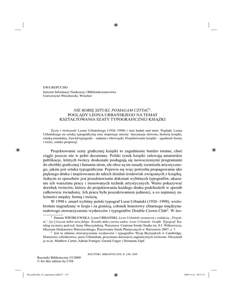 EWA REPUCHO Instytut Informacji Naukowej i Bibliotekoznawstwa Uniwersytet Wrocławski, Wrocław NIE ROBIĘ SZTUKI, POMAGAM CZYTAĆ1. POGLĄDY LEONA URBAŃSKIEGO NA TEMAT KSZTAŁTOWANIA SZATY TYPOGRAFICZNEJ KSIĄŻKI Życie i twórczość Leona Urbańskiego (1926–1998) i stan badań nad nimi. Poglądy Leona Urbańskiego na sztukę typograficzną oraz inspiracje artysty: fascynacja słowem, historią książki, sztuką orientalną. Zawód typografa – zadania i obowiązki. Projektowanie książki – zgodność formy i treści, sztuka proporcji. Projektowanie szaty graficznej książki to zagadnienie bardzo istotne, choć ciągle jeszcze nie w pełni doceniane. Polski rynek książki zalewają amatorskie publikacje, których twórcy doskonale posługują się nowoczesnymi programami do obróbki graficznej i łamania stron, ale obce są im zasady rzemiosła artystycznego, jakim jest sztuka typograficzna. Pojawia się więc potrzeba propagowania idei pięknego druku i inspirowania do takich działań środowisk związanych z książką. Jednym ze sposobów jest przedstawienie dokonań wybitnych typografów, ukazanie ich warsztatu pracy i stosowanych technik artystycznych. Warto pokazywać dorobek twórców, którzy do projektowania każdego druku podchodzili w sposób całkowicie świadomy. Ich praca była poszukiwaniem jedności, a co najmniej zależności między formą i treścią. W 1998 r. zmarł wybitny polski typograf Leon Urbański (1926–1998), wielokrotnie nagradzany w kraju i za granicą, członek honorowy elitarnego międzynarodowego stowarzyszenia wydawców i typografów Double Crown Club2. W śro1 Danuta WRÓBLEWSKA, Leon URBAŃSKI, Leon Urbański rozmawia z redakcją „Projektu”, [w:] Lucem dabit atra fuligo. Światło dała czarna sadza. Leon Urbański. Grafik. Typograf. Katalog wystawy pod red. Anny Mieczyńskiej, Warszawa: Centrum Sztuki Studio im. S.I. Witkiewicza, Muzeum Drukarstwa Warszawskiego, Pracowania Sztuk Plastycznych w Warszawie 2007, s. 7. 2 Jest to elitarne stowarzyszenie wydawców i typografów Wysp Brytyjskich w Cambridge. Honorowe członkostwo, poza Urbańskim, przyznano dziesięciu zagranicznym twórcom. Otrzymali je m.in. Matthew Carter, Adrian Frutiger, Gerard Unger i Hermann Zapf. Roczniki Biblioteczne 53/2009 © for this edition by CNS Roczniki bibl_53_imprimatur.indb237 237 ROCZNIKI BIBLIOTECZNE, R. LIII: 2009 2009-11-23 09:11:11 238 EWA REPUCHO dowisku grafików i ludzi książki był uważany za jednego z najwybitniejszych typografów polskich, za „króla polskiej typografii i absolutny autorytet w dziedzinie książki”3. Wymienia się go często obok największych typografów połowy XX w. – Jana Tschicholda, Hermanna Zapfa, Oldřicha Hlavsy, Adriana Frutigera4. Porównywano go także do mistrzów tej miary co Giovanni Mardersteig czy Max Caflisch, a w Polsce – do Adama Półtawskiego. Działalność Urbańskiego ma niebagatelne znaczenie dla rozwoju polskiej sztuki typograficznej XX w., warto więc przypomnieć inspiracje i poglądy artysty na temat kształtowania szaty graficznej książki. Nikt dotychczas nie spróbował zebrać i omówić twórczości Urbańskiego w sposób całościowy5. Na jego temat ukazało się zaledwie kilkanaście publikacji, z czego większość to kilkustronicowe teksty o charakterze biograficznym, krótkie wywiady z samym artystą lub jego współpracownikami, uczniami, przyjaciółmi. Szczególnie godna uwagi jest niewielka publikacja Lucem dabit atra fuligo. Światło dała czarna sadza. Leon Urbański. Grafik. Typograf wydana z okazji otwarcia wystawy poświęconej Leonowi Urbańskiemu w Centrum Sztuki Studio im. S.I. Witkiewicza i Muzeum Drukarstwa Warszawskiego. Zebranie i opisanie dorobku artysty to zadanie niełatwe, ponieważ dorobek ten jest bardzo rozproszony. Część materiałów zaginęła bezpowrotnie, zmarli niektórzy jego znajomi i przyjaciele, ulotna jest pamięć bliskich współpracowników. Stan wiedzy na temat warsztatu Leona Urbańskiego i metod jego pracy, stosowanych rozwiązań typograficznych itp. jest raczej znikomy. Sam Urbański skupiał się przede wszystkim na działalności praktycznej. Nie tworzył prac teoretycznych, które teraz mogłyby odsłonić tajniki jego warsztatu. W artykule podjęto próbę nakreślenia sylwetki artysty, ukazania jego zamiłowań i stosunku do wykonywanej pracy, opierając się na dostępnej literaturze, rękopisach Leona Urbańskiego oraz na podstawie wywiadu przeprowadzonego z jego żoną. Wartościowym źródłem okazał się także zapis audycji radiowej przygotowanej przez Ewę Prządkę pt. Portret artysty, wyemitowanej w Programie 3. Polskiego Radia w dniu 9 lutego 1996 r. Zawierała ona wywiad z artystą na temat jego fascynacji typograficznych oraz wypowiedzi Andrzeja Heidricha, Andrzeja Tomaszewskiego i Danuty Wróblewskiej o twórczości Urbańskiego. Leon Urbański urodził się 11 września 1926 r. w Tarnowie. Ukończył warszawskie Liceum Sztuk Plastycznych, a następnie Wydział Grafiki Akademii Sztuk Pięknych w Warszawie, w pracowni wybitnego grafika i artysty prof. Andrzeja Rudzińskiego (1948–1959), którego potem przez całe życie uważał za swojego 3 Monika MAŁKOWSKA, Honor typografa, Rzeczpospolita 1998, 30.04–1.05, s. 28. Danuta WRÓBLEWSKA, Leon i książka, [w:] Lucem dabit atra fuligo…, s. 5. 5 Autorka przygotowuje monografię na temat życia i twórczości Leona Urbańskiego pt. Sztuka czerni i bieli. Kultura książki w twórczości Leona Urbańskiego. 4 Roczniki Biblioteczne 53/2009 © for this edition by CNS Roczniki bibl_53_imprimatur.indb238 238 2009-11-23 09:11:11 NIE ROBIĘ SZTUKI, POMAGAM CZYTAĆ 239 mistrza. W latach 1978–1982 był docentem na Wydziale Grafiki warszawskiej ASP, gdzie kierował Katedrą Kształcenia Podstawowego. Wykładał także na Podyplomowym Studium Edytorstwa Uniwersytetu Warszawskiego. Przede wszystkim był jednak współzałożycielem (razem z Andrzejem Rudzińskim i Henryk