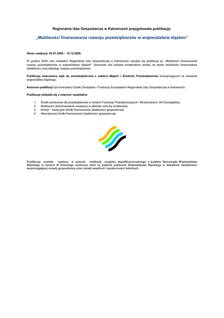 Regionalna Izba Gospodarcza w Katowicach przygotowała publikację: „Możliwości finansowania rozwoju przedsiębiorstw w województwie śląskim” Okres realizacji: 05.07.2005 – 15.12.2005. W grudniu 2005 roku nakładem Regionalnej Izby Gospodarczej w Katowicach ukazała się publikacja pt. „Możliwości finansowania rozwoju przedsiębiorstw w województwie śląskim”. Stanowiła ona swoiste kompendium wiedzy na temat możliwości finansowania działalności oraz dalszego rozwoju przedsiębiorstw. Publikacja skierowana była do przedsiębiorców z sektora Małych i Średnich Przedsiębiorstw funkcjonujących na obszarze województwa śląskiego. Autorami publikacji byli konsultanci Działu Doradztwa i Funduszy Europejskich Regionalnej Izby Gospodarczej w Katowicach. Publikacja składała się z czterech rozdziałów: 1. 2. 3. 4. Środki pomocowe dla przedsiębiorstw w ramach Funduszy Przedakcesyjnych i Strukturalnych Unii Europejskiej; Możliwości dofinansowania inwestycji w zakresie ochrony środowiska; Kredyt – tradycyjne źródło finansowania działalności gospodarczej; Alternatywne źródła finansowania działalności gospodarczej. Publikacja została wydana w ramach realizacji projektu współfinansowanego z budżetu Samorządu Województwa Śląskiego w ramach III otwartego konkursu ofert na zadania publiczne Województwa Śląskiego w dziedzinie działalności wspomagającej rozwój gospodarczy oraz rozwój wspólnot i społeczności lokalnych.