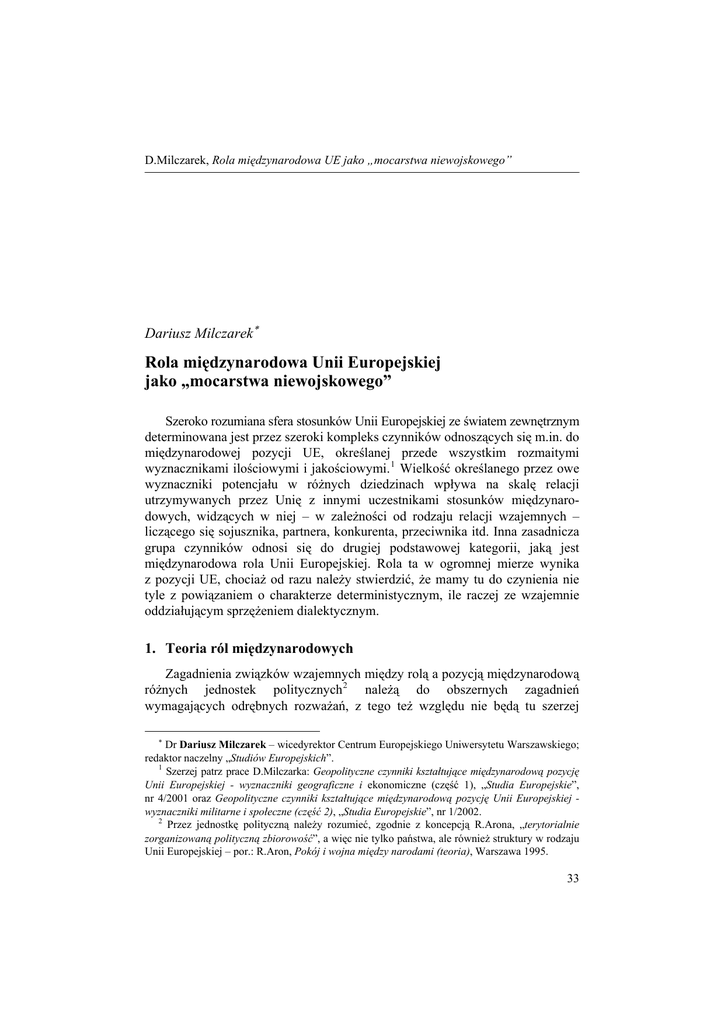 D.Milczarek, Rola międzynarodowa UE jako „mocarstwa niewojskowego” Dariusz Milczarek ∗ Rola międzynarodowa Unii Europejskiej jako „mocarstwa niewojskowego” Szeroko rozumiana sfera stosunków Unii Europejskiej ze światem zewnętrznym determinowana jest przez szeroki kompleks czynników odnoszących się m.in. do międzynarodowej pozycji UE, określanej przede wszystkim rozmaitymi wyznacznikami ilościowymi i jakościowymi. 1 Wielkość określanego przez owe wyznaczniki potencjału w różnych dziedzinach wpływa na skalę relacji utrzymywanych przez Unię z innymi uczestnikami stosunków międzynarodowych, widzących w niej – w zależności od rodzaju relacji wzajemnych – liczącego się sojusznika, partnera, konkurenta, przeciwnika itd. Inna zasadnicza grupa czynników odnosi się do drugiej podstawowej kategorii, jaką jest międzynarodowa rola Unii Europejskiej. Rola ta w ogromnej mierze wynika z pozycji UE, chociaż od razu należy stwierdzić, że mamy tu do czynienia nie tyle z powiązaniem o charakterze deterministycznym, ile raczej ze wzajemnie oddziałującym sprzężeniem dialektycznym. 1. Teoria ról międzynarodowych Zagadnienia związków wzajemnych między rolą a pozycją międzynarodową różnych jednostek politycznych 2 należą do obszernych zagadnień wymagających odrębnych rozważań, z tego też względu nie będą tu szerzej ∗ Dr Dariusz Milczarek – wicedyrektor Centrum Europejskiego Uniwersytetu Warszawskiego; redaktor naczelny „Studiów Europejskich”. 1 Szerzej patrz prace D.Milczarka: Geopolityczne czynniki kształtujące międzynarodową pozycję Unii Europejskiej - wyznaczniki geograficzne i ekonomiczne (część 1), „Studia Europejskie”, nr 4/2001 oraz Geopolityczne czynniki kształtujące międzynarodową pozycję Unii Europejskiej wyznaczniki militarne i społeczne (część 2), „Studia Europejskie”, nr 1/2002. 2 Przez jednostkę polityczną należy rozumieć, zgodnie z koncepcją R.Arona, „terytorialnie zorganizowaną polityczną zbiorowość”, a więc nie tylko państwa, ale również struktury w rodzaju Unii Europejskiej – por.: R.Aron, Pokój i wojna między narodami (teoria), Warszawa 1995. 33 Studia Europejskie, 1/2003 rozwijane. Wystarczy wskazać, że do analizy owych zagadnień można posługiwać się rozmaitymi instrumentami badawczymi, spośród których jednym z najbardziej użytecznych wydaje się teoria ról międzynarodowych. Podstawą tej koncepcji, stosunkowo dobrze rozwiniętej w zachodniej i polskiej literaturze przedmiotu, 3 jest teoria ról społecznych. 4 Korzystając z jej dorobku i odnosząc ją na razie do ról odgrywanych przez wszystkie jednostki polityczne uczestniczące w stosunkach międzynarodowych (w tym zwłaszcza przez państwa), można stwierdzić za Z.J.Pietrasiem, że rola międzynarodowa oznacza spójny system wybranych przez nie działań w stosunkach zewnętrznych. (Przy czym rola ta może być traktowana w sposób syntetyczny lub też jako pewien system ról.) Jeśli chodzi o klasyfikację ról międzynarodowych, to punktem wyjścia mogą być sposoby definiowania roli społecznej, które można wykorzystać do stworzenia podstawowego katalogu ról międzynarodowych, obejmującego zarysowane poniżej elementy. I tak można zacząć od przypomnienia, że współczesne stosunki międzynarodowe charakteryzują się formalnym równouprawnieniem wszystkich ich uczestników, którzy w związku z tym mają znacznie większe, niż w sferze wewnątrzspołecznej, możliwości samookreślania swoich ról w zależności od ich pozycji, prestiżu, celów oraz ideologii. Tym samym każdy z nich (co odnosi się nie tylko do państw, ale również do struktur w rodzaju Unii Europejskiej) formułuje własną rolę wybieraną przez siebie. Możemy mieć również do czynienia z rolą narzuconą czy raczej przypisywaną danej jednostce politycznej przez systemy międzynarodowe (ale także przez jej struktury wewnętrzne). O tym, jakiego rodzaju jest to rola, decyduje wiele czynników. Należy do nich przede wszystkim potencjał danej jednostki wynikający z jej pozycji (inne role przypisywane są wielkim mocarstwom, a inne państwom mniejszym). Ważną rolę odgrywa ponadto formuła wspomnianej wyżej roli wybieranej przez samą jednostkę – np. państwu głoszącemu wojowniczą politykę ekspansji trudno przypisywać rolę mediatora w rozwiązywaniu konfliktów międzypaństwowych. 3 Z bogatej literatury przedmiotu por.: Role Quests in the Post-Cold War Era. Foreign Policies in Transition, ed. P.Le Prestre, Montreal 1997; M.Barnett, Institutions, Role, and Disorder: The Case of the Arab States System, „International Studies Quarterly”, no. 3/1993; J.Roseanu, Turbulence in World Politics, Princeton 1990; Role Theory and Foreign Policy Analysis, ed. S.Walker, Durham 1987. Z polskiej literatury patrz prace Z.J.Pietrasia: Pojęcie i klasyfikacja ról międzynarodowych, Lublin 1989 oraz Międzynarodowa rola Chin, Lublin 1990 oraz D.Milczarek, Pozycja i rola Unii Europejskiej w stosunkach międzynarodowych. Wybrane aspekty teoretyczne, Warszawa 2003, zwł. rozdziały 4-6. 4 Szerzej patrz: Z.J.Pietraś, Międzynarodowa rola..., op.cit. oraz P.Katzenstein, Introduction: Alternative Perspectives on National Security w: The Culture of National Security: Norms and Identity in World Politics, ed. P.Katzenstein, New York 1996. 34 D.Milczarek, Rola międzynarodowa UE jako „mocarstwa niewojskowego” Występują ponadto role deklarowane, które wiążą się w pierwszym rzędzie z publicznym oznajmianiem zamiarów i celów polityki zewnętrznej przez jednostki polityczne w formie oficjalnych dokumentów. Praktyka wykazuje przy tym, że role deklarowane wcale nie muszą być tożsame z rolami realnie przez nie wybieranymi; tak jak te ostatnie nie muszą być publicznie ogłaszane. Uwzględnienie wszystkich tych ról pozwala na określenie kolejnej kategorii, jaką jest rola rzeczywista. Można ją okr
