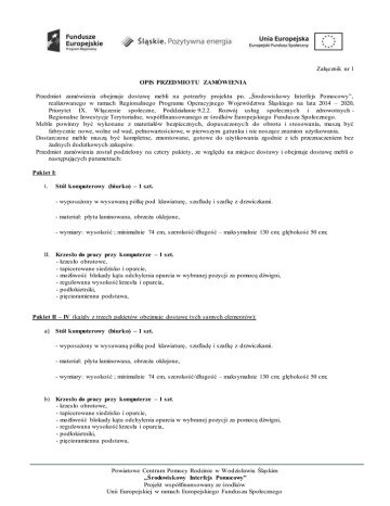 Załącznik nr 1 OPIS PRZEDMIOTU ZAMÓWIENIA Przedmiot zamówienia obejmuje dostawę mebli na potrzeby projektu pn. „Środowiskowy Interfejs Pomocowy”, realizowanego w ramach Regionalnego Programu Operacyjnego Województwa Śląskiego na lata 2014 – 2020, Priorytet IX. Włączenie społeczne, Poddziałanie 9.2.2. Rozwój usług społecznych i zdrowotnych Regionalne Inwestycje Terytorialne, współfinansowanego ze środków Europejskiego Funduszu Społecznego. Meble powinny być wykonane z materiałów bezpiecznych, dopuszczonyc h do obrotu i stosowania, muszą być fabrycznie nowe, wolne od wad, pełnowartościowe, w pierwszym gatunku i nie noszące znamion użytkowania. Dostarczone meble muszą być kompletne, zmontowane, gotowe do użytkowania zgodnie z ich przeznaczeniem bez żadnych dodatkowych zakupów. Przedmiot zamówienia został podzielony na cztery pakiety, ze względu na miejsce dostawy i obejmuje dostawę mebli o następujących parametrach: Pakiet I: I. Stół komputerowy (biurko) – 1 szt. - wyposażony w wysuwaną półkę pod klawiaturę, szufladę i szafkę z drzwiczkami. - materiał: płyta laminowana, obrzeża oklejone, - wymiary: wysokość ; minimalnie 74 cm, szerokość/długość – maksymalnie 130 cm; głębokość 50 cm; II. Krzesło do pracy przy komputerze – 1 szt. - krzesło obrotowe, - tapicerowane siedzisko i oparcie, - możliwość blokady kąta odchylenia oparcia w wybranej pozycji za pomocą dźwigni, - regulowana wysokość krzesła i oparcia, - podłokietniki, - pięcioramienna podstawa, Pakiet II – IV (każdy z trzech pakietów obejmuje dostawę tych samych elementów): a) Stół komputerowy (biurko) – 1 szt. - wyposażony w wysuwaną półkę pod klawiaturę, szufladę i szafkę z drzwiczkami. - materiał: płyta laminowana, obrzeża oklejone, - wymiary: wysokość ; minimalnie 74 cm, szerokość/długość – maksymalnie 130 cm; głębokość 50 cm; b) Krzesło do pracy przy komputerze – 1 szt. - krzesło obrotowe, - tapicerowane siedzisko i oparcie, - możliwość blokady kąta odchylenia oparcia w wybranej pozycji za pomocą dźwigni, - regulowana wysokość krzesła i oparcia, - podłokietniki, - pięcioramienna podstawa, Powiatowe Centrum Pomocy Rodzinie w Wodzisławiu Śląskim „Środowiskowy Interfejs Pomocowy” Projekt współfinansowany ze środków Unii Europejskiej w ramach Europejskiego Funduszu Społecznego c) Stół – 3 szt. - blat stołu zamocowany do stelaża; - blat wykonany z płyty laminowanej wykończony obrzeżem PCV 2 mm; - wymiary: wysokość: 75 cm; wymiary blatu: 120 x 80 cm; d) Krzesła do stołu (krzesła typu ISO) – 15 szt. - tapicerowane siedzisko i oparcie, - siedzisko o wymiarach: szerokość 475 mm, głębokość 415 mm, -wytrzymała, metalowa konstrukcja ramy – chromowana lub lakierowana proszkowo w kolorze czarnym; - możliwość składowania w stosie (min. 10 szt.), - wymiary podane w mm: e) Szafa – 1 szt. - wykonanie z płyty laminowanej o grubości min. 18 mm, - wymiary: wysokość: min. 173 cm, szerokość: 80 cm; f) Regał ekspozycyjny, otwarty – 1 szt. - 5 półek - bez drzwi, - materiał: całość z drewna albo korpus - płyta wiórowa laminowana, a obrzeża wykończone tworzywem PCV, - wymiary: wysokość min. 135 cm; szerokość min. 57 cm, głębokość min. 26 cm; g) Wieszak na odzież wierzchnią – 1 szt. - wieszak stojący, metalowa lub drewniana podstawa, Powiatowe Centrum Pomocy Rodzinie w Wodzisławiu Śląskim „Środowiskowy Interfejs Pomocowy” Projekt współfinansowany ze środków Unii Europejskiej w ramach Europejskiego Funduszu Społecznego - wysokość min. 140 cm, - materiał: metal lub drewno. Uwaga: Maksymalne różnice w wymiarach mebli są dopuszczalne w zakresie +/- 20 mm. Każdy z ww. pakietów powinien być tego samego typu, dobrany kolorystycznie – kolor do uzgodnienia z Zamawiającym. Zdjęcia oraz grafiki zawarte w opisie należy traktować jako ogólnopoglądowe. Termin realizacji: do dnia 03.03.2017 r. Meble są przeznaczone do długotrwałego użytkowania, minimalny okres gwarancji - 2 lata. Wykonawca będzie zobowiązany do dostarczenia mebli na własne ryzyko i odpowiedzialność do wskazanych lokalizacji: Pakiet I – Wodzisław Śląski, ul. Gałczyńskiego 1 (budynek Centrum Kształcenia Praktycznego i Zawodowego w Wodzisławiu Śląskim) Pakiet II – Wodzisław Śląski, ul. Szkolna 1 (budynek Liceum Ogólnokształcące im. 14 Pułku Powstańców Śląskich w Wodzisławiu Śląskim) Pakiet III – Radlin, ul. Orkana 23 (budynek Zasadniczej Szkoły Zawodowej w Radlinie), Pakiet IV – Rydułtowy, ul. Strzelców Bytomskich 11 (budynek Publicznego Zakładu Opieki Zdrowotnej w Rydułtowach) Dostawa mebli do powyższych lokalizacji obejmuje wniesienie ich do pomieszczenia wskazanego przez Zamawiającego i montaż, jeśli to jest wymagane. Powiatowe Centrum Pomocy Rodzinie w Wodzisławiu Śląskim „Środowiskowy Interfejs Pomocowy” Projekt współfinansowany ze środków Unii Europejskiej w ramach Europejskiego Funduszu Społecznego