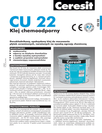 Klej chemoodporny CERESIT CU_22_KT_05.05 Dwuskładnikowy, epoksydowy klej do mocowania płytek ceramicznych, narażonych na wysoką agresję chemiczną WŁAŚCIWOŚCI wodoszczelny odporny na działanie chemikaliów o bardzo wysokiej wytrzymałości o szybkim przyroście wytrzymałości niezawierający rozpuszczalników ZASTOSOWANIE Klej Ceresit CU 22 służy do mocowania płytek ceramicznych i kamiennych (także marmurowych), szklanych mozaik itp. Może być też użyty do przyklejania kształtek klinkierowych lub płyt wiórowych. CU 22 może być stosowany wewnątrz i na zewnątrz budynków. Szczególnie zalecany jest do miejsc stale mokrych i narażonych na agresję chemiczną, np. w: myjniach samochodowych, zakładach leczniczo-kąpielowych, kuchniach zbiorowego żywienia, browarach, silosach, budynkach inwentarskich, mleczarniach, basenach pływackich i laboratoriach. Klej może być stosowany na podłożach metalowych (niekorodujących lub pokrytych epoksydową powłoką antykorozyjną z posypką z suszonego ogniowo piasku kwarcowego); betonowych (wiek powyżej 3 miesięcy, wilgotność ≤ 4%), na cementowych tynkach i jastrychach (wiek powyżej 28 dni, wilgotność ≤ 4%); na płytach włóknowo-cementowych, wiórowych (gr. ³ 22 mm) oraz na istniejących płytkach ceramicznych i kamiennych. Nadaje się do mocowania płytek na podkładach ogrzewania podłogowego. CU 22 można również stosować do trwałego, chemoodpornego spoinowania płytek. Materiał może kontaktować się z wodą pitną. PRZYGOTOWANIE PODŁOŻA Klej CU 22 ma przyczepność do zwartych, nośnych, suchych podłoży, wolnych od substancji zmniejszających przyczepność. Istniejące zabrudzenia, powłoki i środki antyadhezyjne należy dokładnie usunąć. W przypadku nierównych podłoży lub mocowania płytek o głęboko profilowanych powierzchniach montażowych – do CU 22 można dodać 15% suszonego ogniowo piasku kwarcowego o uziarnieniu 0,2÷0,6 mm. Nierówności podłoża należy wyszpachlować klejem z dodatkiem piasku na co najmniej 12 godzin przed mocowaniem płytek. WYKONANIE Opakowanie CU 22 zawiera obydwa składniki kleju. Należy dodać utwardzacz (składnik B) do substancji bazowej (składnik A) i wymieszać za pomocą wolnoobrotowej wiertarki z mieszadłem, aż do uzyskania jednorodnej kolorystycznie masy bez grudek. Czas zużycia materiału istotnie zależy od temperatury. W temperaturze +23°C wynosi on ok. 90 min. Klej należy rozprowadzać po podłożu pacą o zębach 3÷8 mm w zależności od rozmiarów płytek. Suche płytki układać na kleju i dociskać. Nie układać płytek na styk. Zachować szerokość spoin w zależności od wielkości płytek i warunków eksploatacji. Spoinować nie wcześniej niż po 24 godzinach, używając chemoodpornych spoin Ceresit CE 47, CE 48 lub analogicznie – do spoinowania płytek zastosować klej CU 22. Narzędzia i świeże zabrudzenia należy czyścić szczotką i ciepłą wodą. Stwardniały klej można usunąć tylko mechanicznie. W przypadku bardzo trudnych warunków eksploatacji, np. w zakładach leczniczo-kąpielowych, basenach, akumulatorniach, zaleca się wcześniejsze zabezpieczenie podłoża poprzez wykonanie elastycznej, chemoodpornej powłoki wo- CU 22 CU 22 UWAGA Prace należy wykonywać w suchych warunkach, przy temperaturze powietrza i podłoża od +10°C do +25°C. Wszelkie dane odnoszą się do temperatury +23°C i wilgotności względnej powietrza 50%. W innych warunkach należy uwzględnić krótszy lub dłuższy czas twardnienia materiału. Materiał zawiera substancje szkodliwe dla zdrowia. Nieutwardzona żywica może powodować odczyny alergiczne. Zabrudzenia zmywać wodą. Stosować rękawice i okulary ochronne. W przypadku kontaktu z oczami płukać je obficie wodą i zasięgnąć porady lekarza. W pomieszczeniach zapewnić odpowiednią wentylację. Chronić przed dziećmi. ZALECENIA Niniejsza karta techniczna określa zakres stosowania materiału i sposób prowadzenia robót, ale nie może zastąpić zawodowego przygotowania wykonawcy. Oprócz podanych informacji prace należy wykonywać zgodnie ze sztuką budowlaną i zasadami BHP. Producent gwarantuje jakość wyrobu, natomiast nie ma wpływu na warunki i sposób jego użycia. W przypadku wątpliwości należy wykonać własne próby stosowania. Wraz z ukazaniem się tej karty technicznej tracą ważność karty wcześniejsze. DANE TECHNICZNE Baza: żywica epoksydowa z mineralnymi wypełniaczami i dodatkami Kolor: szary Gęstość świeżego kleju: 1,6 kg/dm3 Proporcje mieszania: 3 części wagowe składnika A na 1 część składnika B Temperatura stosowania: od +10°C do +25°C Czas zużycia: ok. 90 min Czas otwarty (wg normy PN-EN 12004): Spoinowanie: po 24 godz. Spływ (wg normy PN-EN 12004): ≤ 0,5 mm Przyczepność (wg normy PN-EN 12004): - początkowa: ≥ 2,0 MPa - po zanurzeniu w wodzie: ≥ 2,0 MPa Wytrzymałość na ścinanie po szoku termicznym (wg normy PN-EN 12004): Odporność chemiczna: SKŁADOWANIE Do 12 miesięcy od daty produkcji przy składowaniu w suchych warunkach i w oryginalnych, nieuszkodzonych opakowaniach. Chronić przed mrozem! OPAKOWANIA przyczepność ≥ 0,5 N/mm2 po czasie nie krótszym niż 20 min ≥ 2,0 MPa po 7 dniach, zgodnie z tabelą odporności chemicznej materiałów Ceresit Odporność na temperaturę po całkowitym utwardzeniu: - warunki suche: od -30°C do +100°C - warunki wilgotne: od -30°C do +70°C Orientacyjne zużycie: Pojemniki metalowe 8 kg, zawierające obydwa składniki. wymiar zębów pacy [mm] 3 mm 4 mm 6 mm 8 mm ilość CU 22 [kg/m2] 1,9 2,2 2,8 3,4 Wyrób zgodny z normą PN-EN 12004:2002, posiada atest higieniczny Państwowego Zakładu Higieny HK/B/0330/03/99 oraz atest na kontakt z wodą pitną HK/W/0901/03/1999. Henkel Polska Sp. z o.o. ul. Domaniewska 41, 02-672 Warszawa Centralny Dział Obsługi Klienta: Tel. (+48 41) 371-01-00 • Fax (+48 41) 374-22-22 www.ceresit.pl • infolinia 0-800-120-241 Buduj korzy